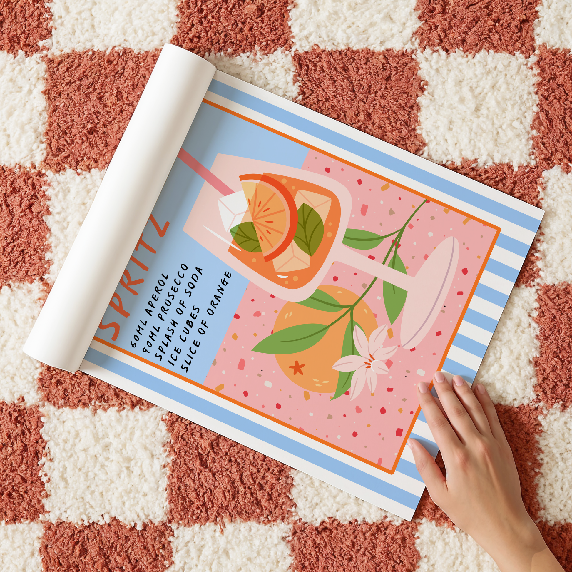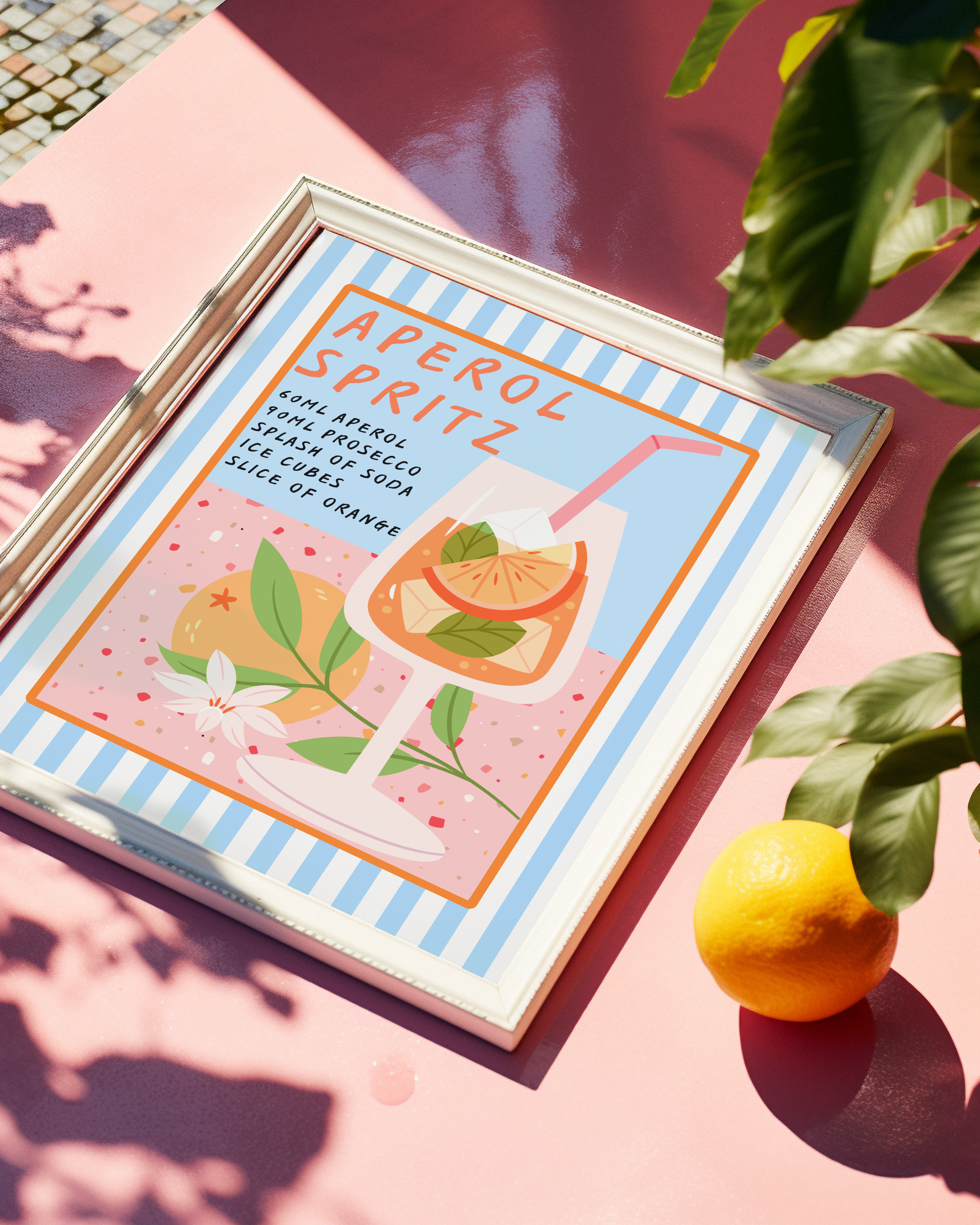 Celebrate the iconic Italian Aperol Spritz with this vibrant poster print. Featuring a chic retro-inspired illustration of the refreshing cocktail — complete with its recipe — this print captures the essence of sunny afternoons, leisurely brunches, and alfresco aperitivo hours.