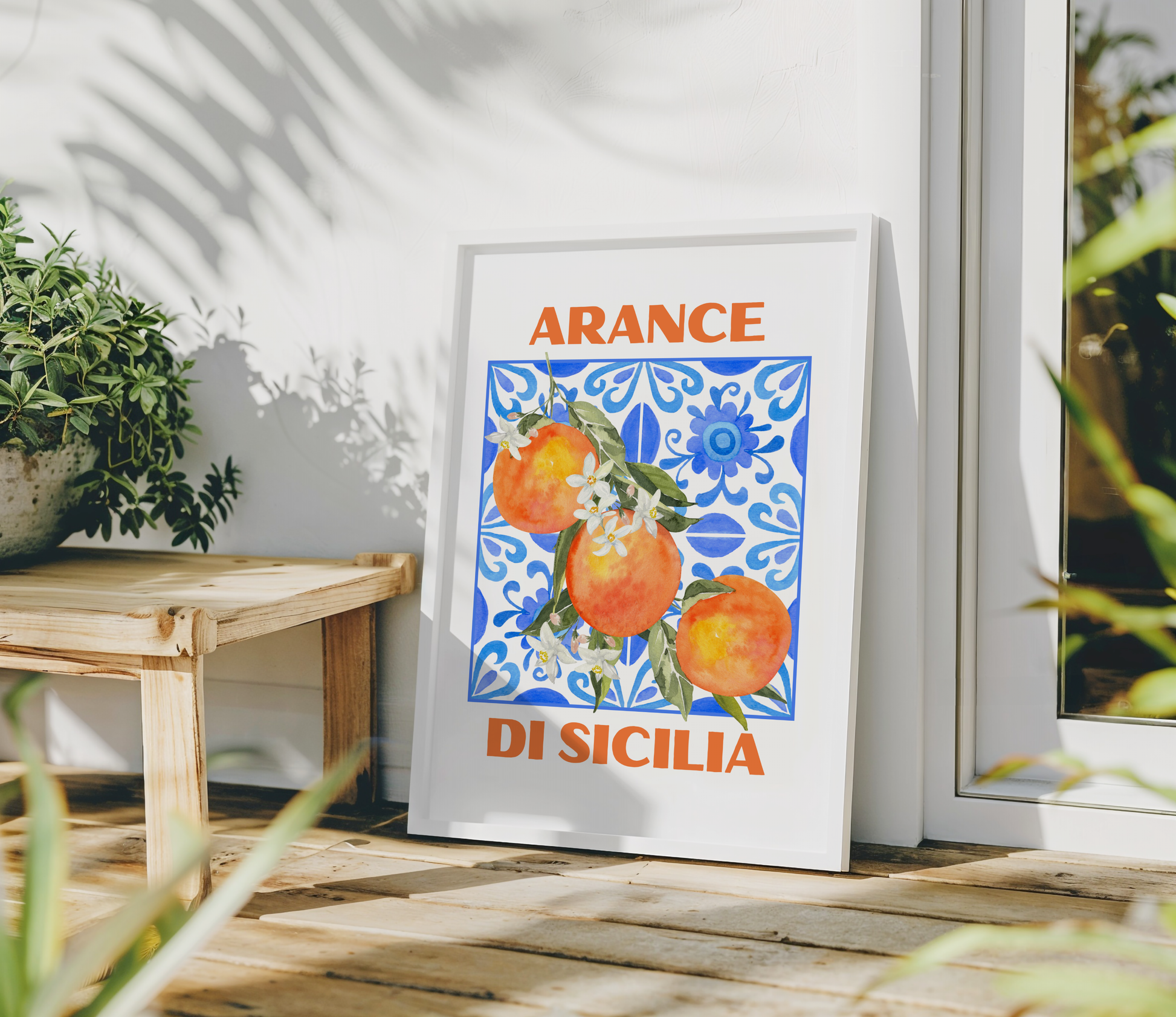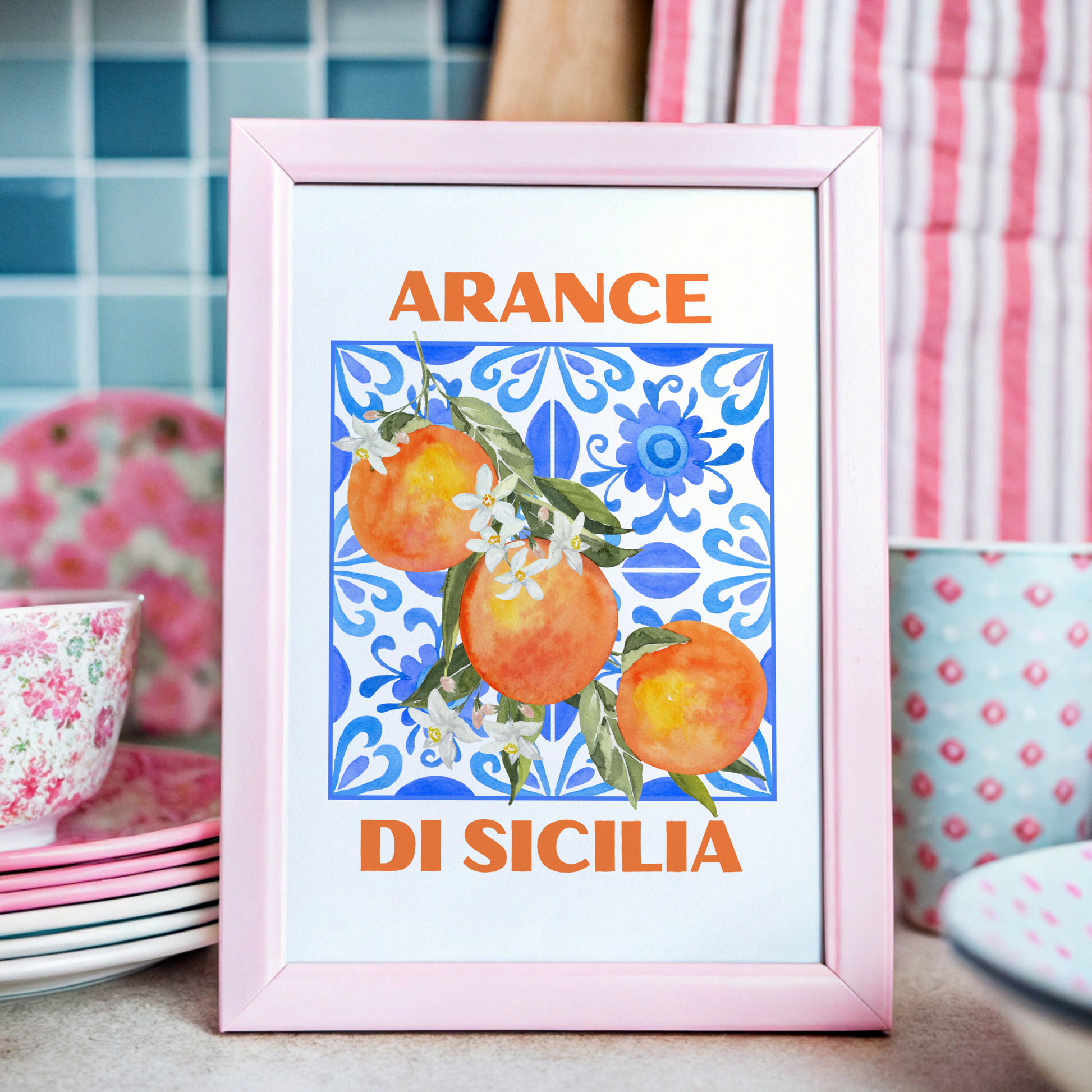 Indulge in the beauty of an Italian summer with this visually stunning 'Arance Di Sicilia' poster print. The artwork features a beautifully illustrated orange branch, on a Sicilian Mosaic Tile and the words "ARANCE DI SICILIA" in a striking typography.