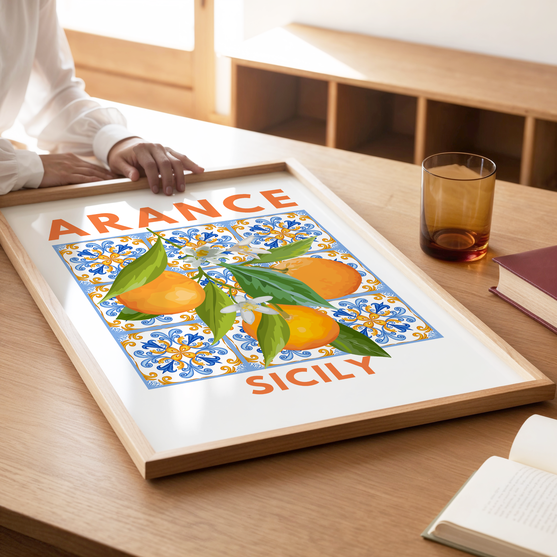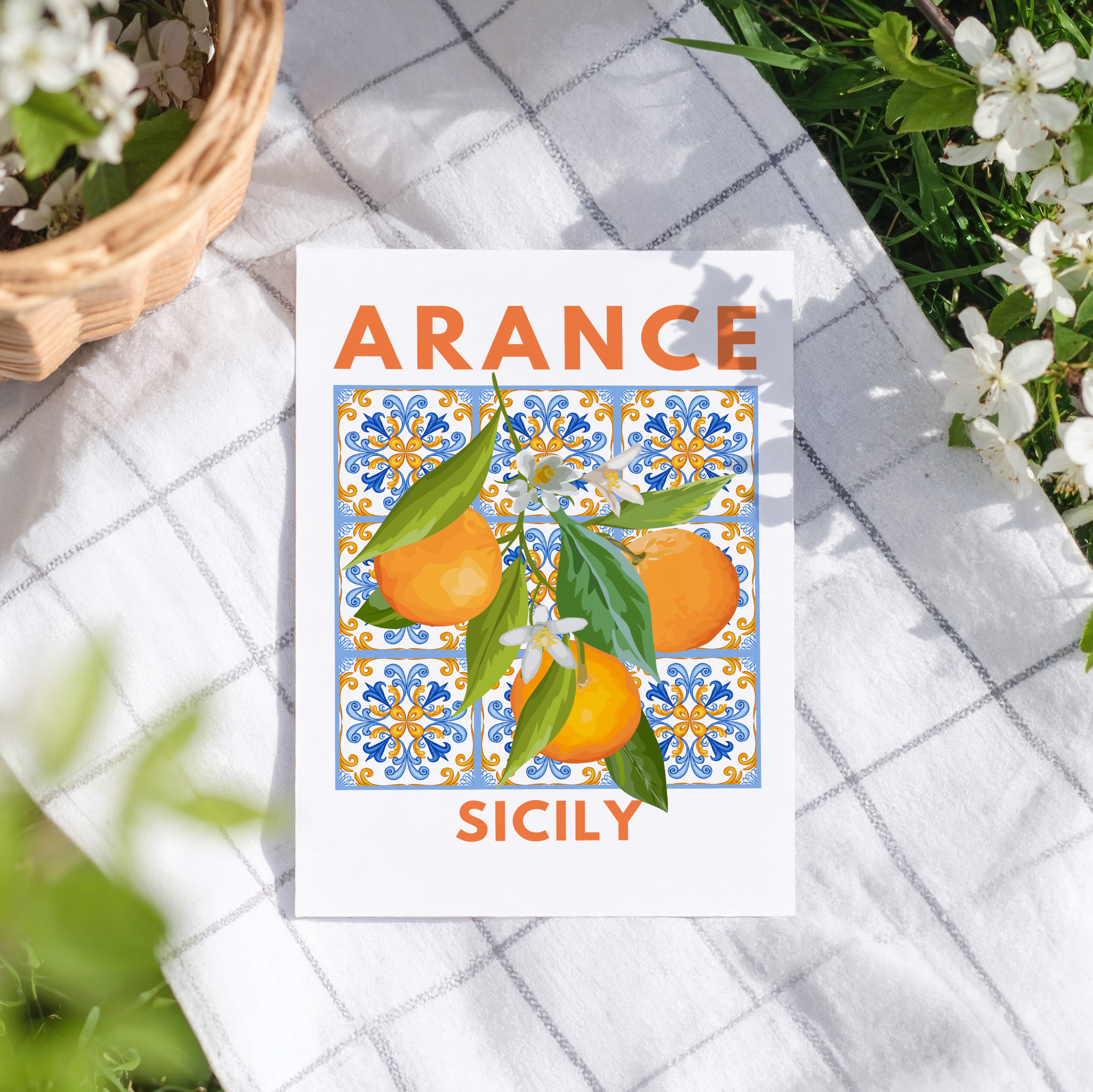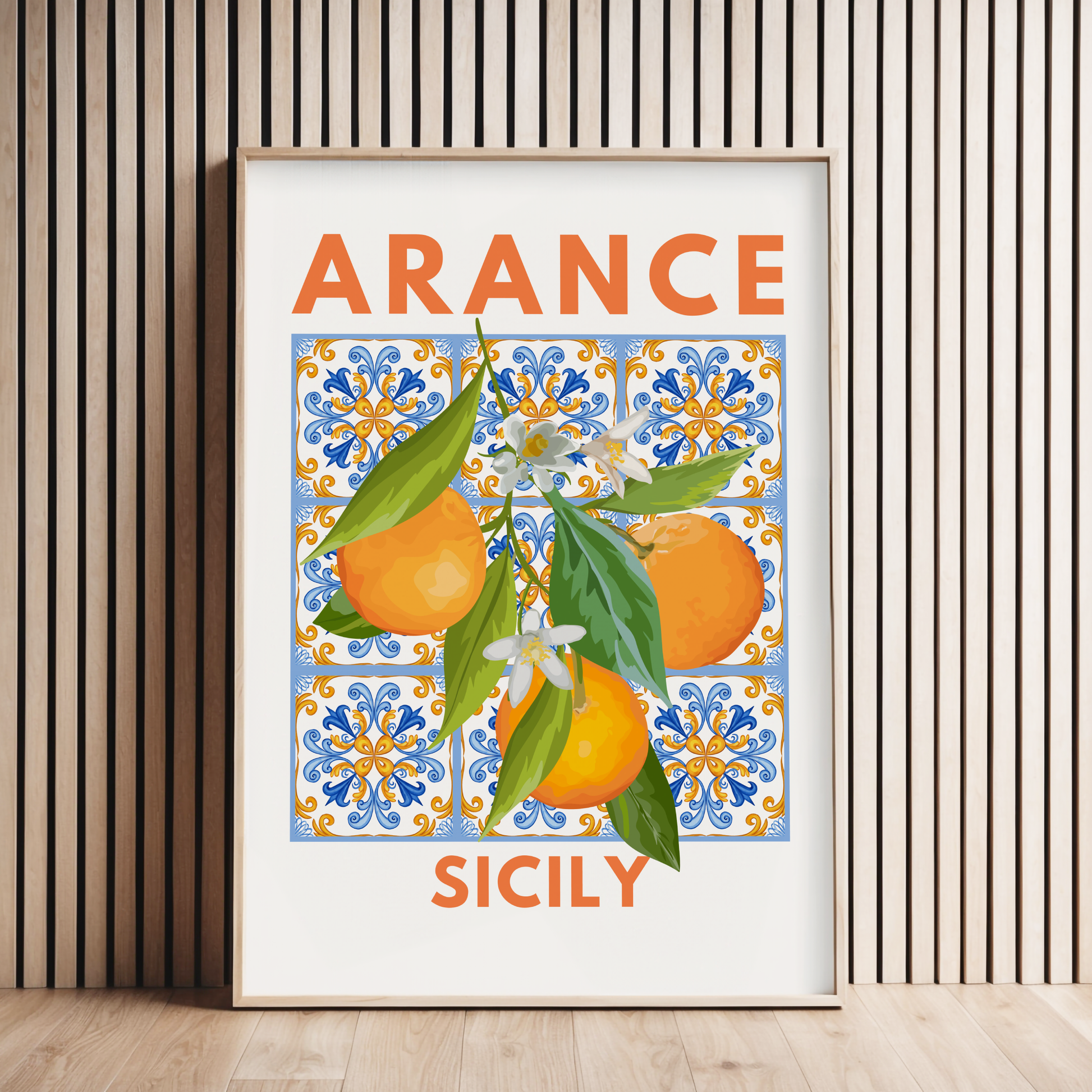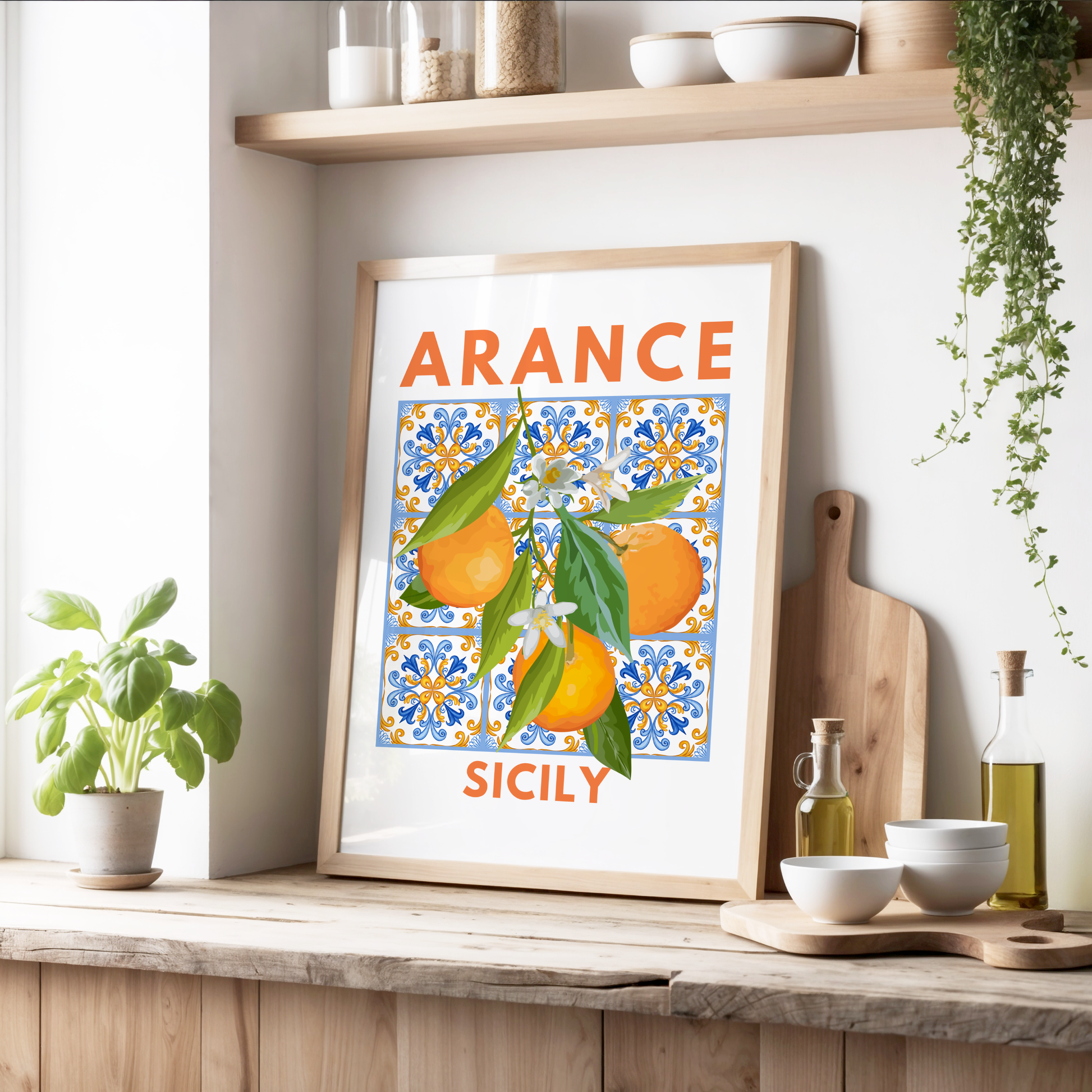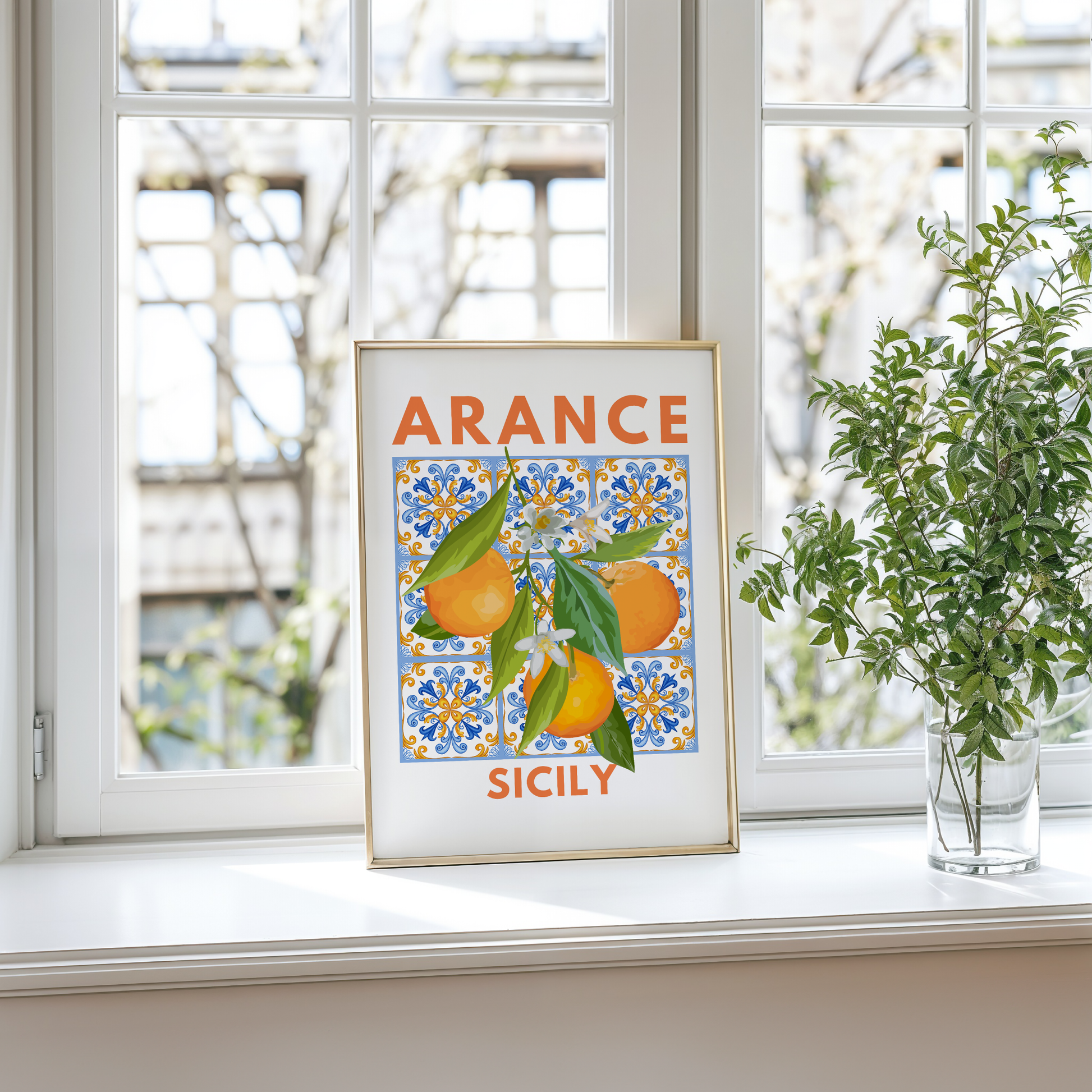 Indulge in the beauty of an Italian summer with this visually stunning 'Arance Sicily' poster print. This elegant digital print features a vibrant orange branch set against a backdrop of intricately detailed Italian mosaic tiles, with the words "ARANCE SICILY" in striking typography. The design captures the warmth, charm, and zest of Sicily’s sun-drenched landscapes and citrus groves.