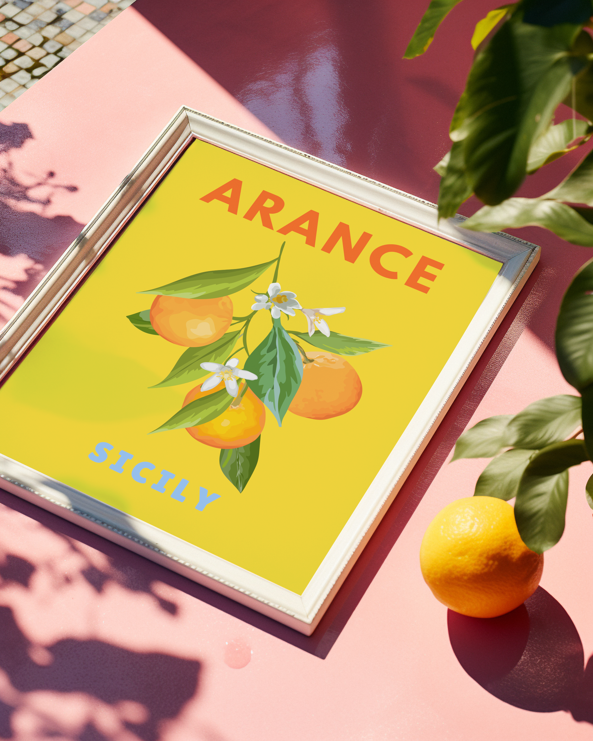 Indulge in the beauty of an Italian summer with this visually stunning 'Arance Sicily' poster print. The artwork features a beautifully designed orange branch on a vibrant yellow background, and the words "ARANCE SICILY" in a striking typography.