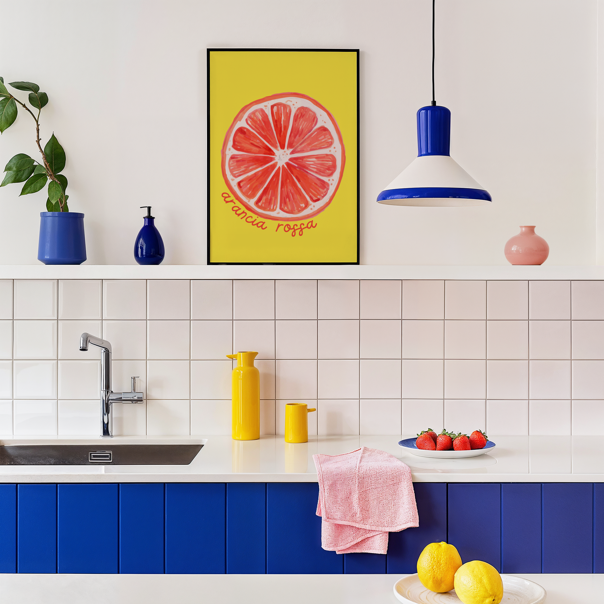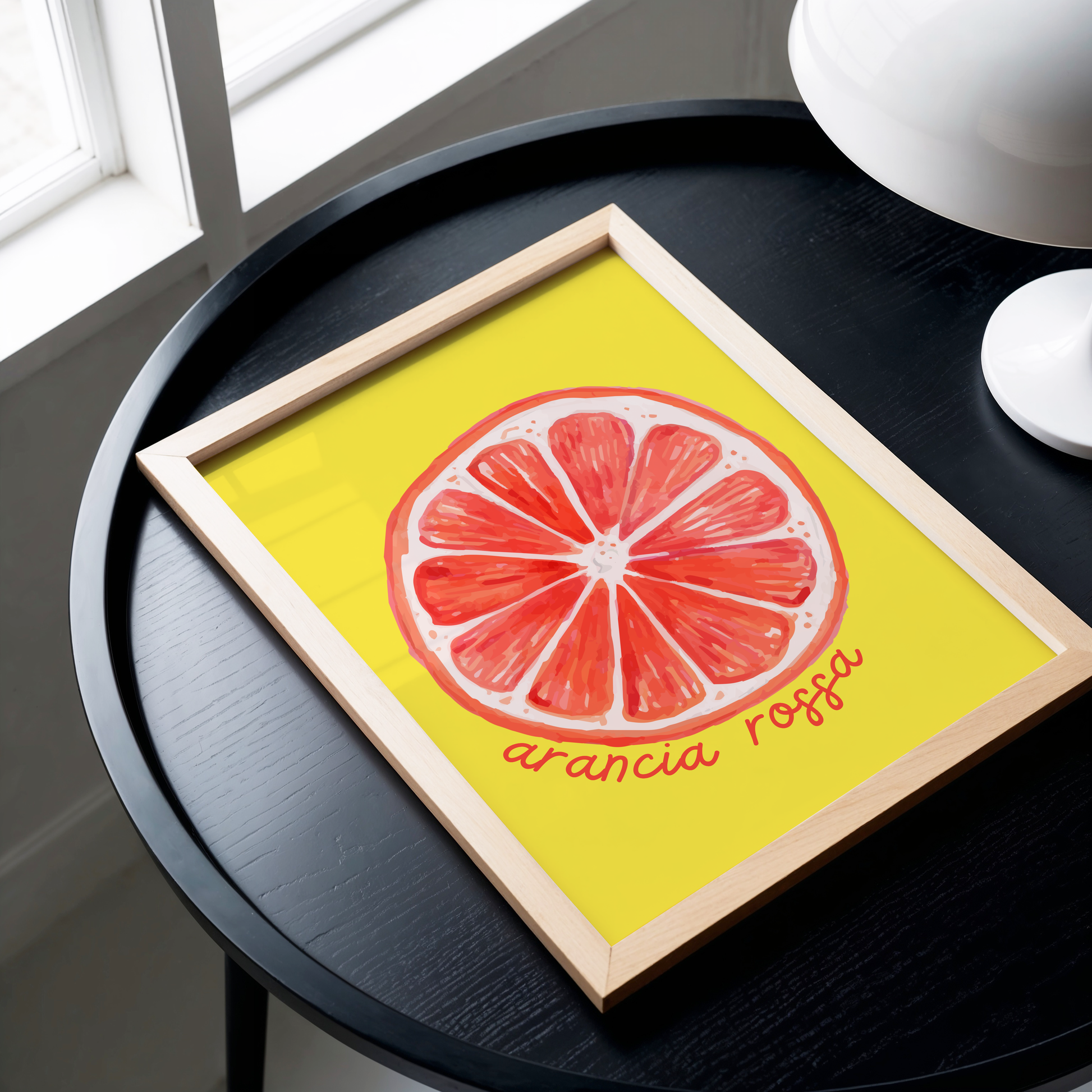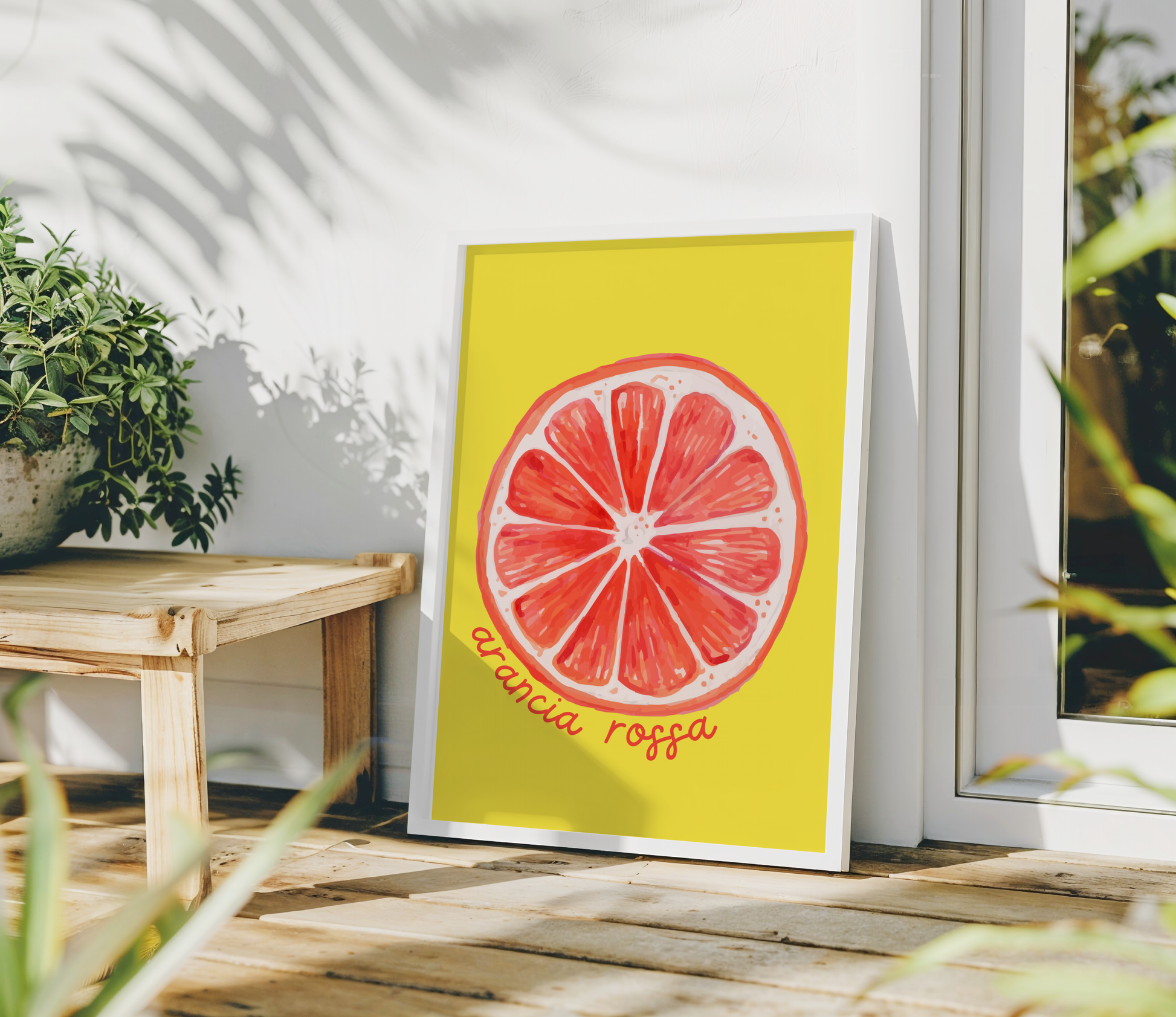 Capture the beauty and vibrancy of an Italian summer with this bold and colourful ‘Arancia Rossa’ poster print. Featuring a juicy slice of blood orange and the words arancia rossa (Italian for "blood orange") set against a vibrant yellow background, this piece brings sunshine, zest, and a playful Mediterranean vibe into your home.
