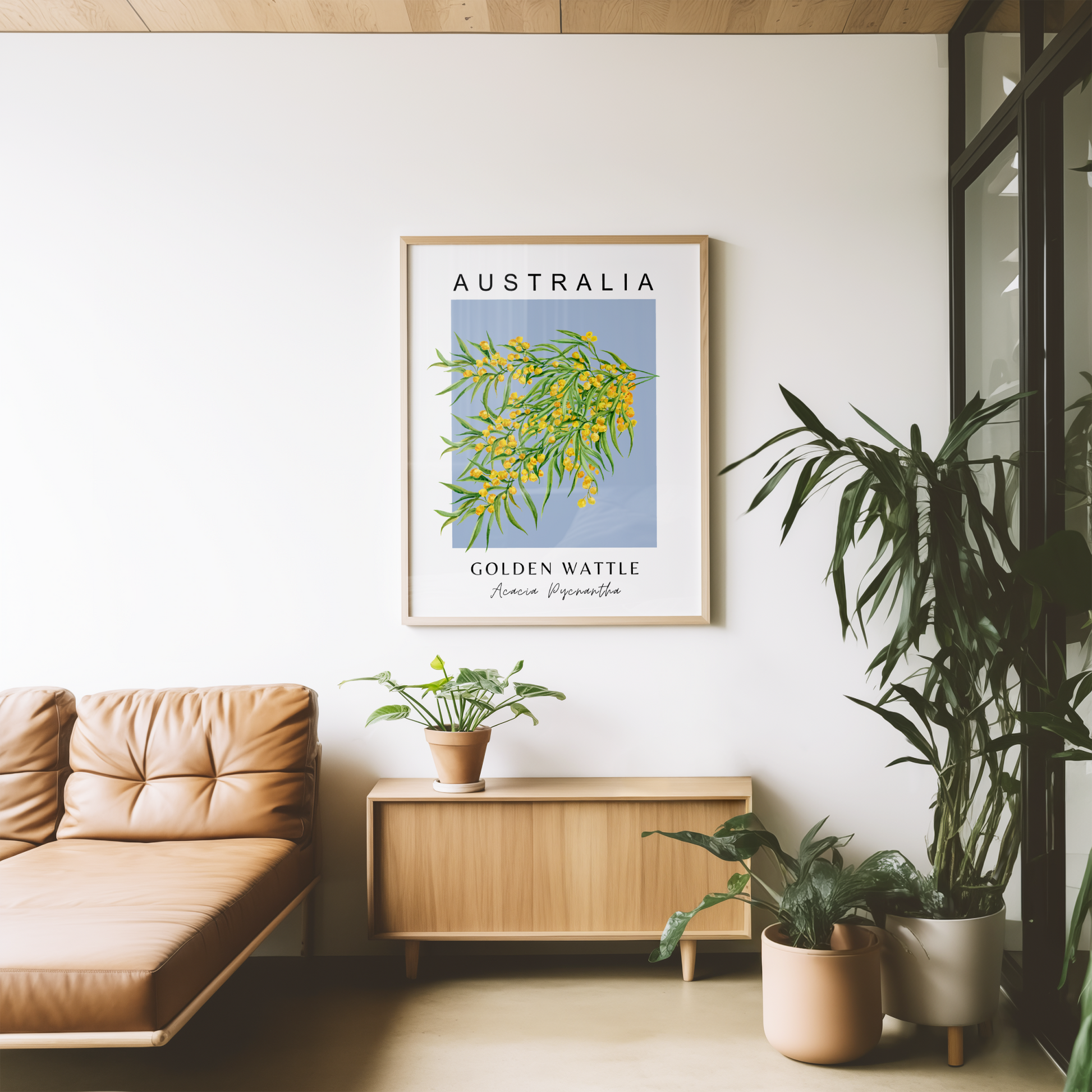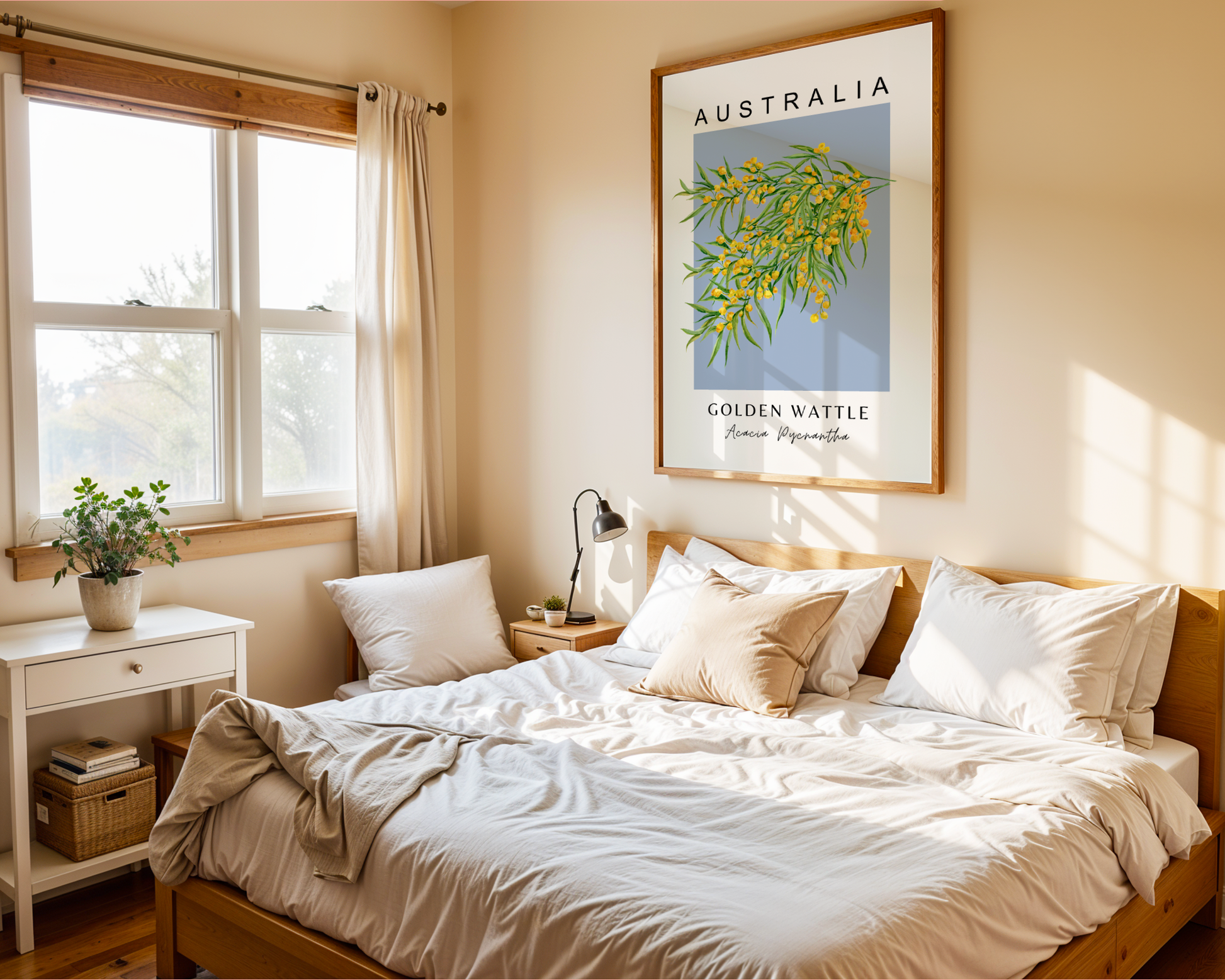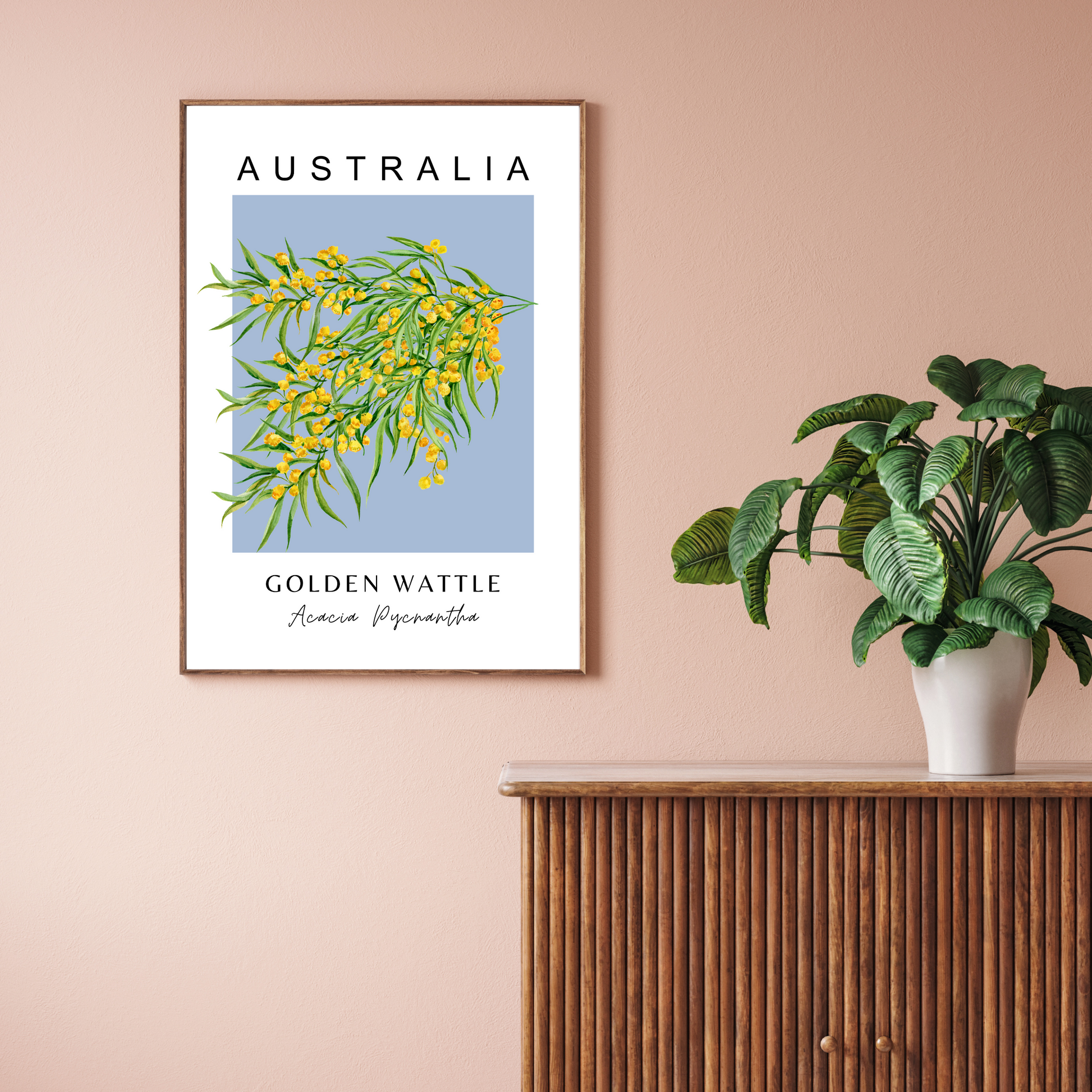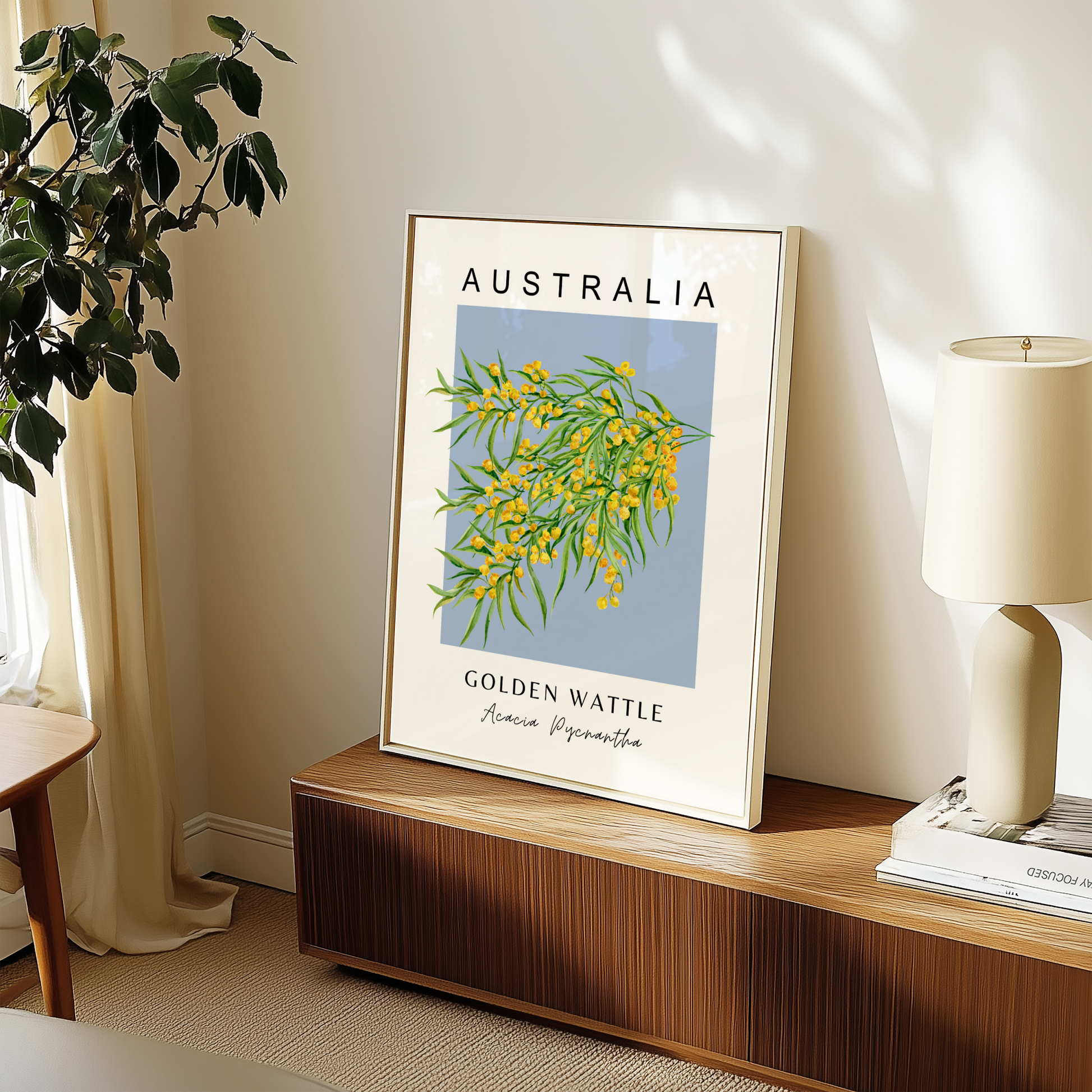 Scientifically known as Acacia Pycnantha, the golden wattle is admired for its fluffy, vibrant yellow blooms and delicate greenery. This artwork captures the elegance and radiance of this iconic Australian native, perfect for adding a warm, botanical touch to your living room, bedroom, home office, or entryway.