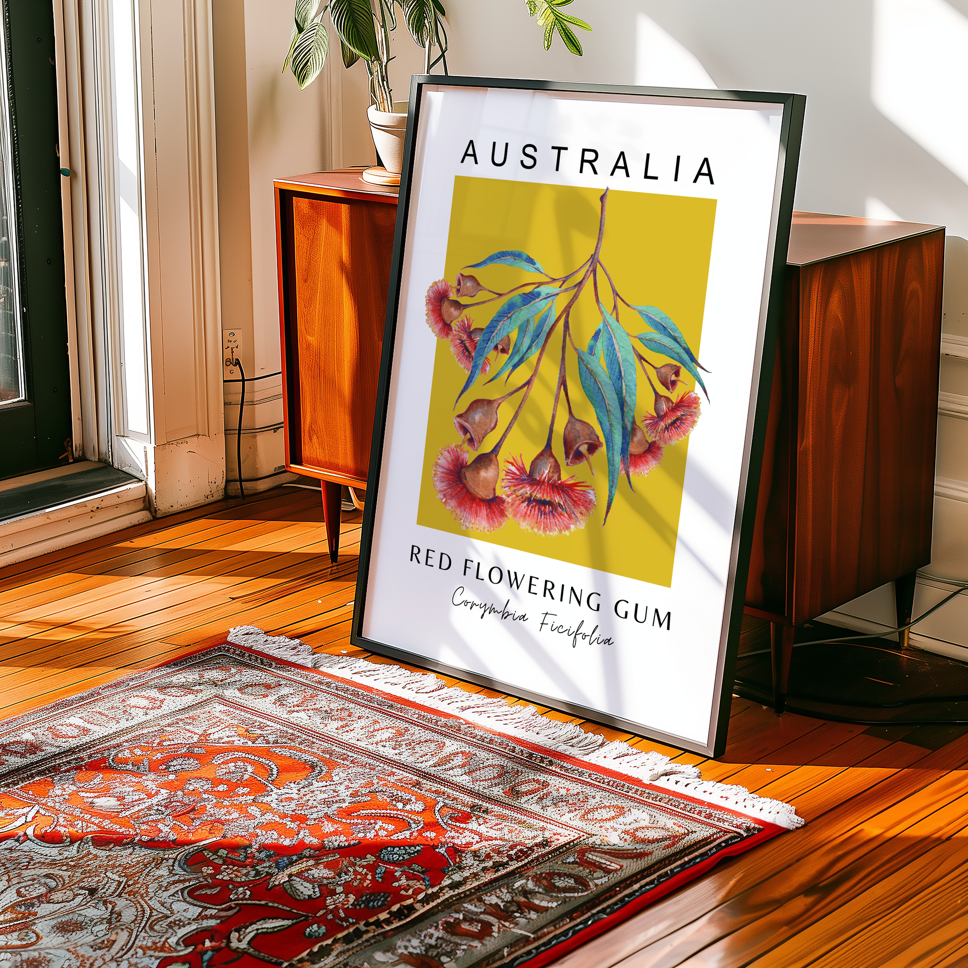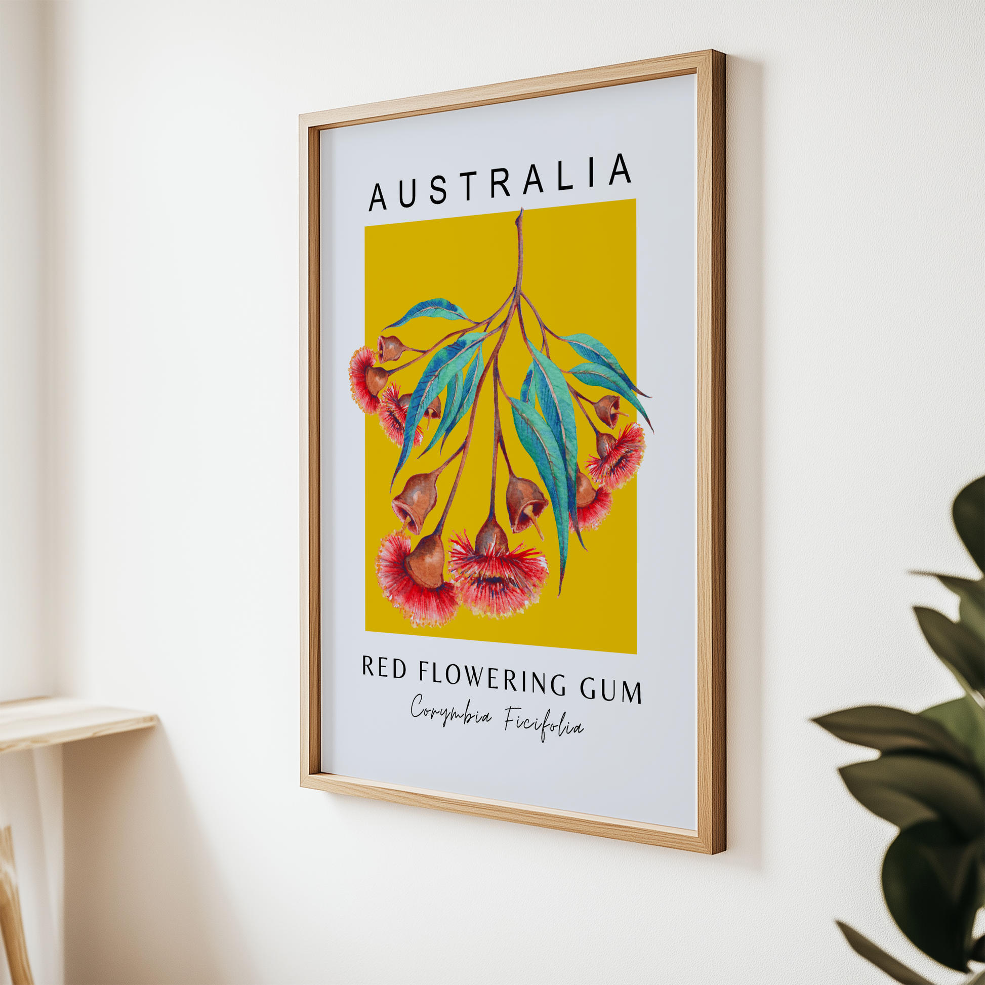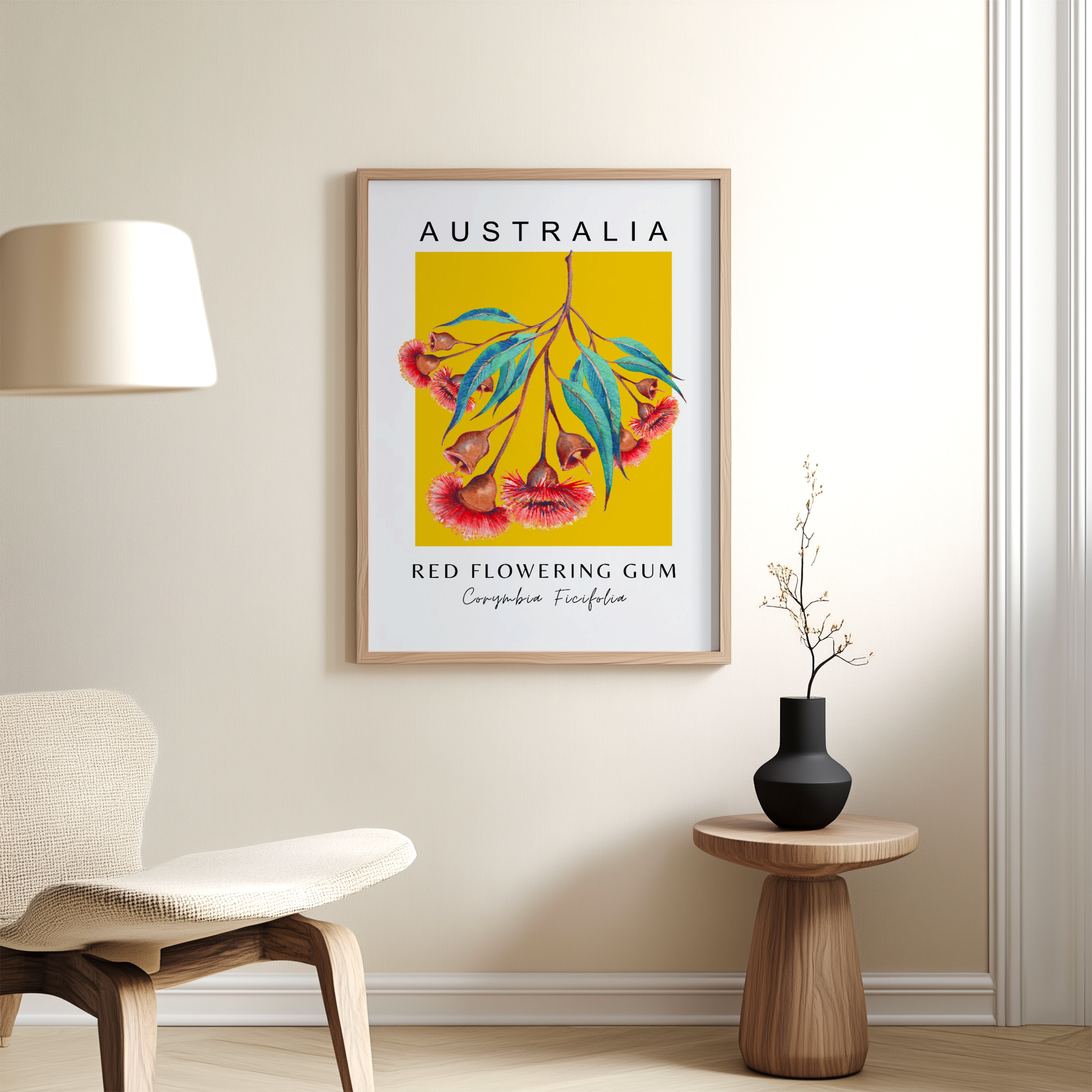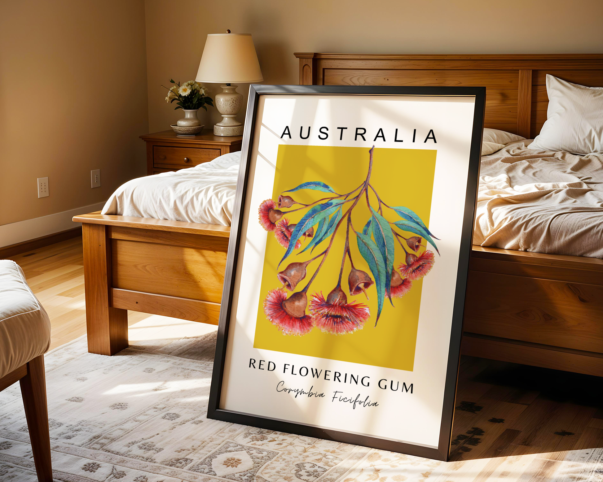 Featuring the Corymbia Ficifolia, also known as the Red Flowering Gum, this elegant artwork brings a botanical and uniquely Australian touch to any space. With its vibrant red blossoms and modern illustration style, it's a perfect addition to your living room, bedroom, home office, or entryway.