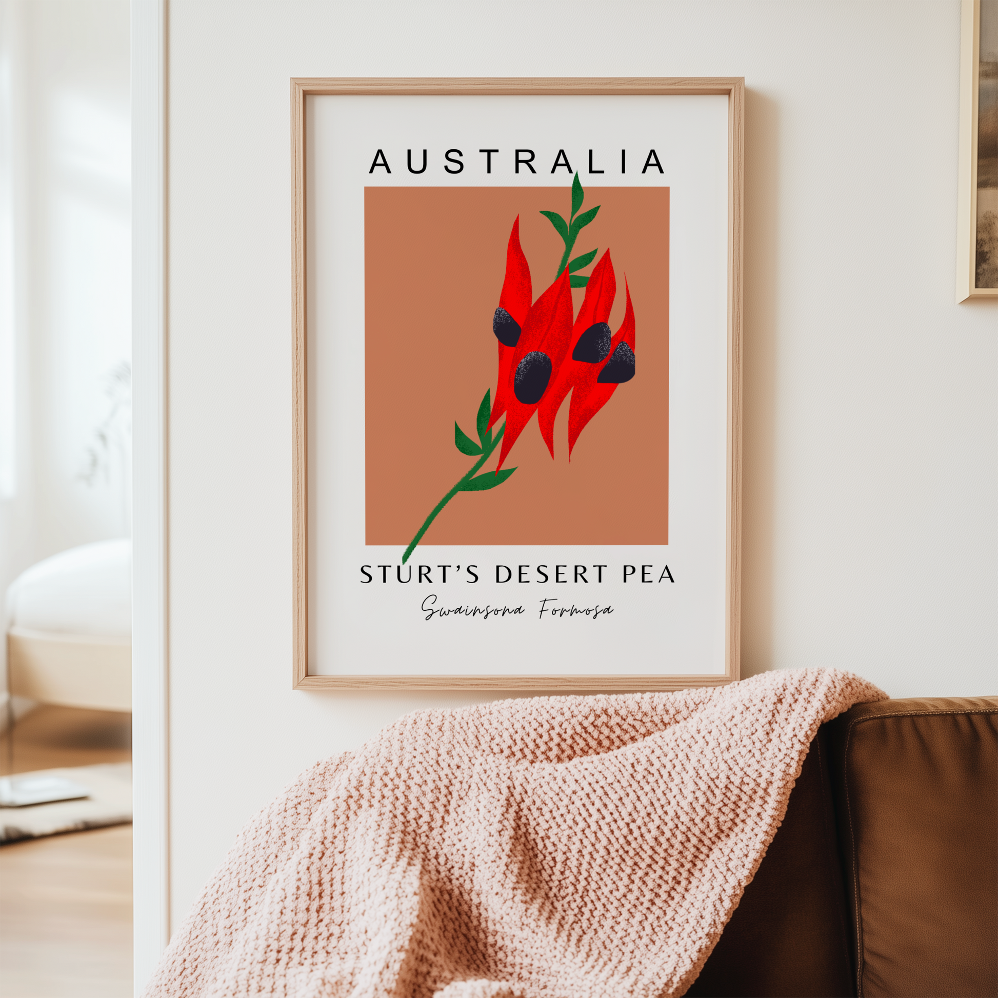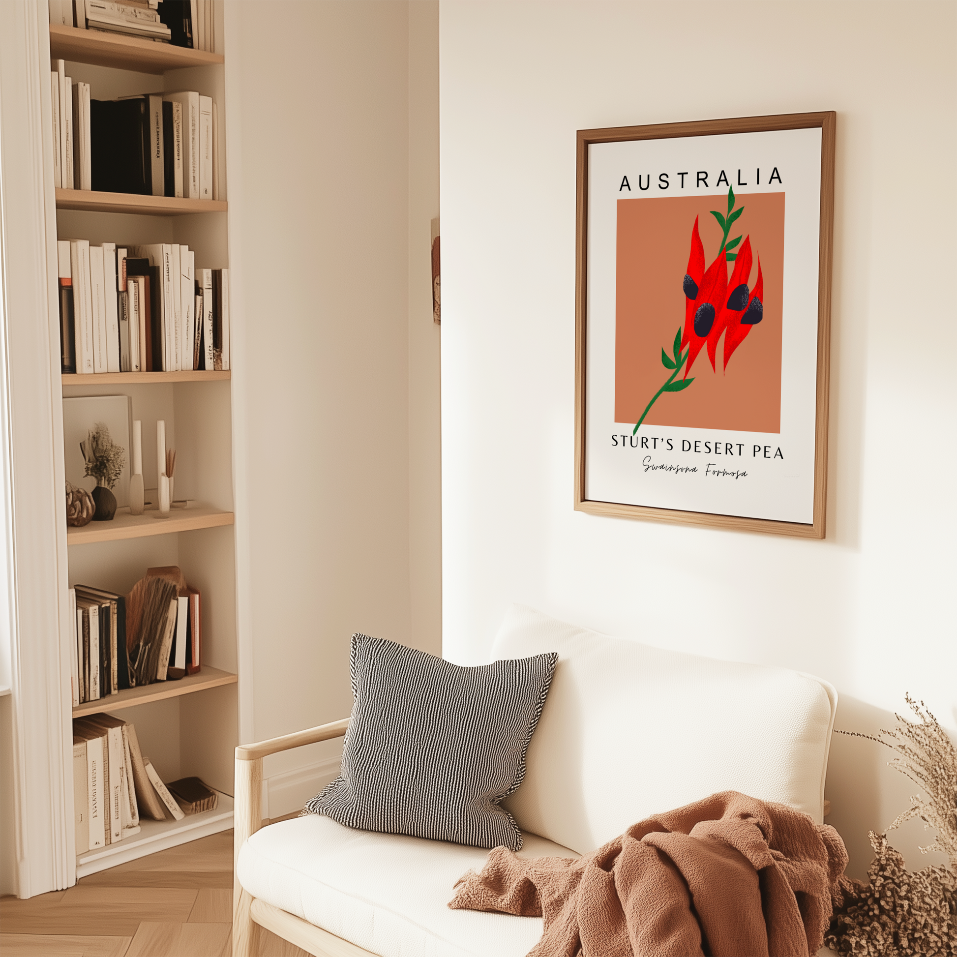 Featuring the iconic Swainsona formosa, this artwork showcases the deep red, almost surreal blossoms of the Sturt’s Desert Pea in a modern, botanical style. It's perfect for bringing a bold and uniquely Australian touch to your living room, bedroom, office, or entryway.