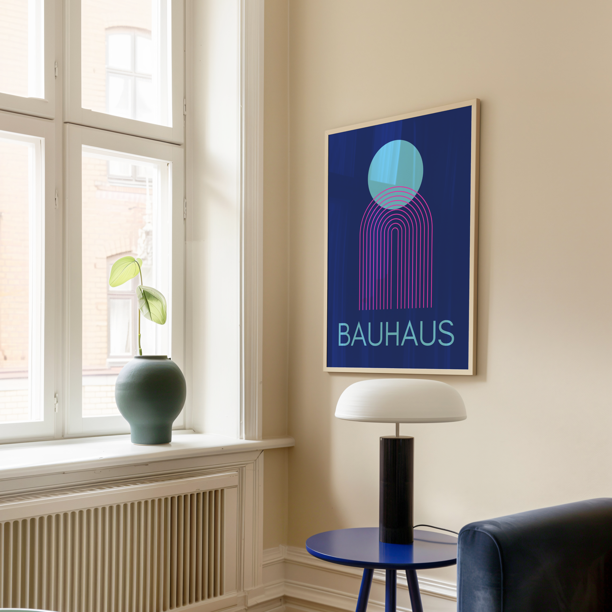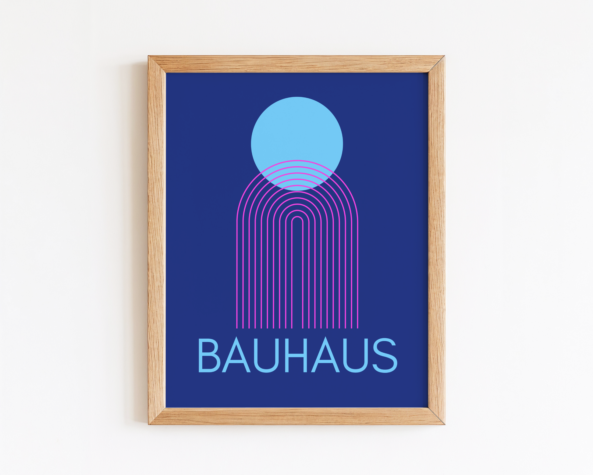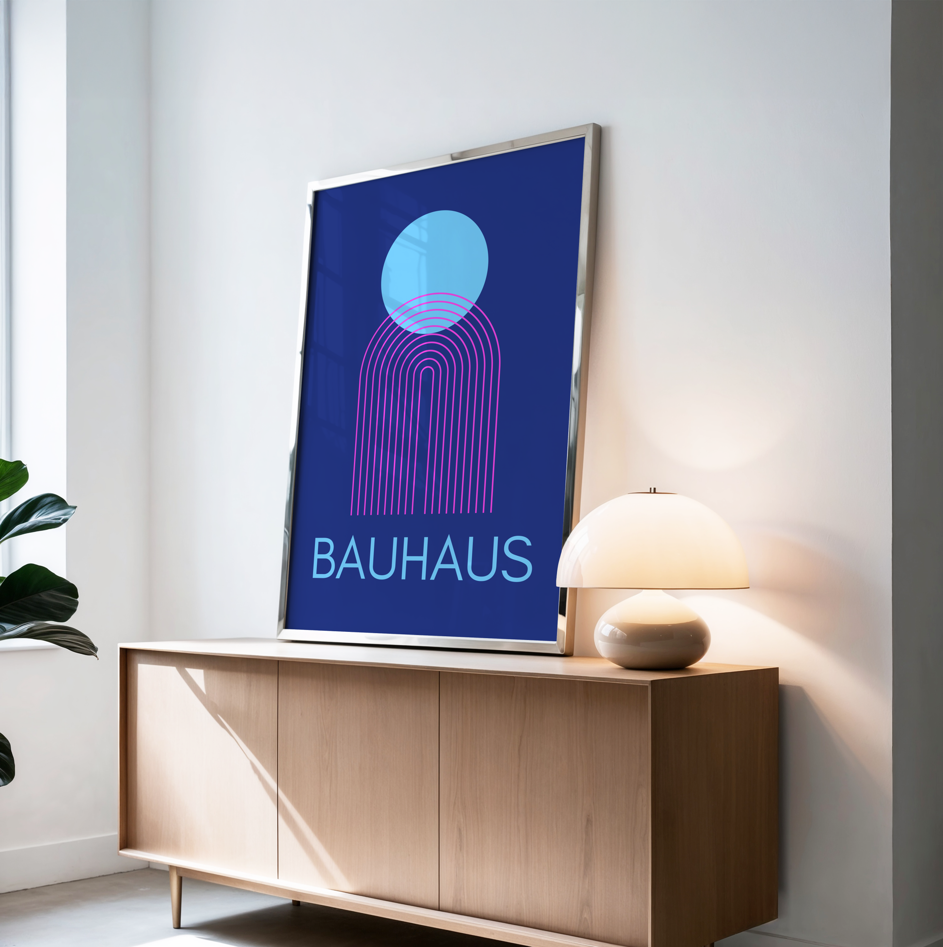 Add a bold pop of modernist style to your walls with this striking Bauhaus-inspired poster print. Featuring a minimalist geometric design in vibrant pink and light blue on a deep navy background, this piece is a perfect nod to the legendary Bauhaus design movement.