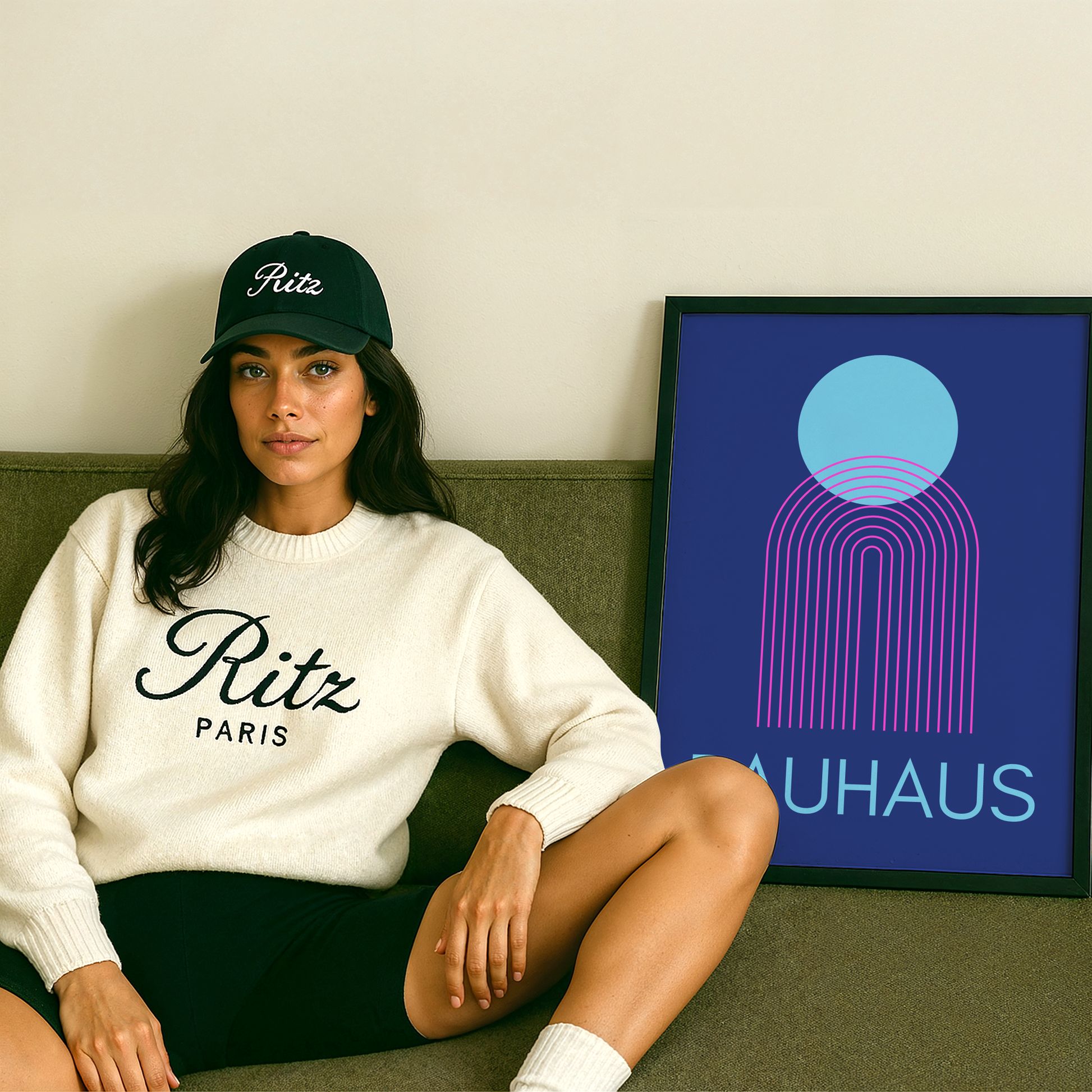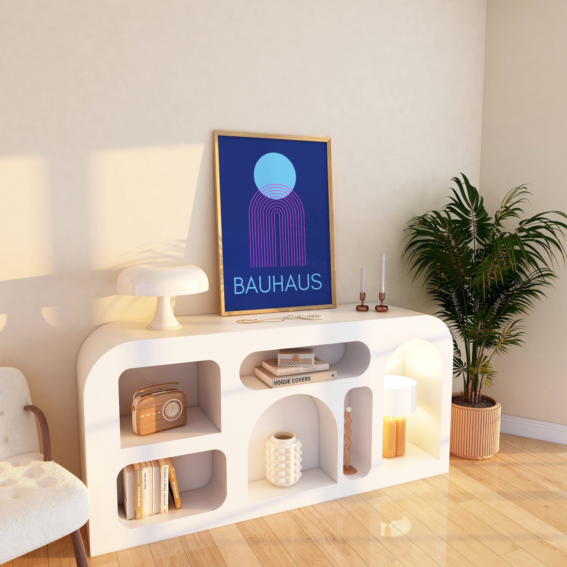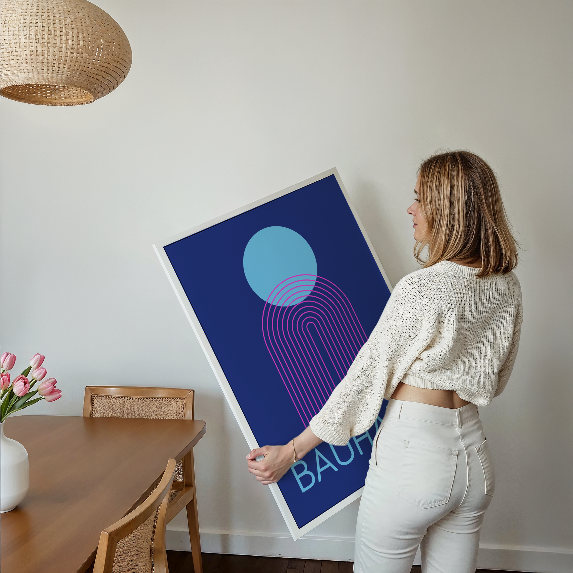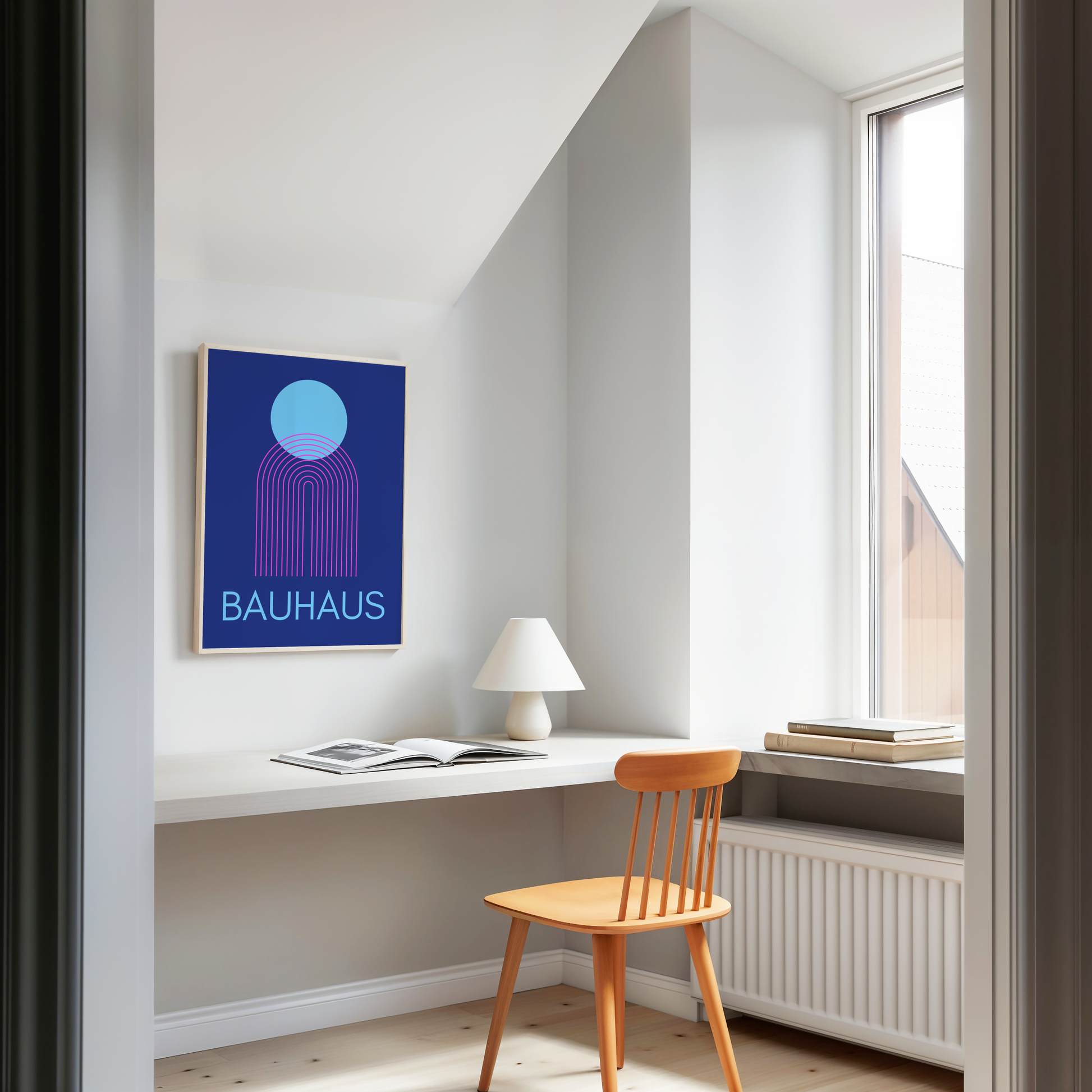 Add a bold pop of modernist style to your walls with this striking Bauhaus-inspired poster print. Featuring a minimalist geometric design in vibrant pink and light blue on a deep navy background, this piece is a perfect nod to the legendary Bauhaus design movement.
