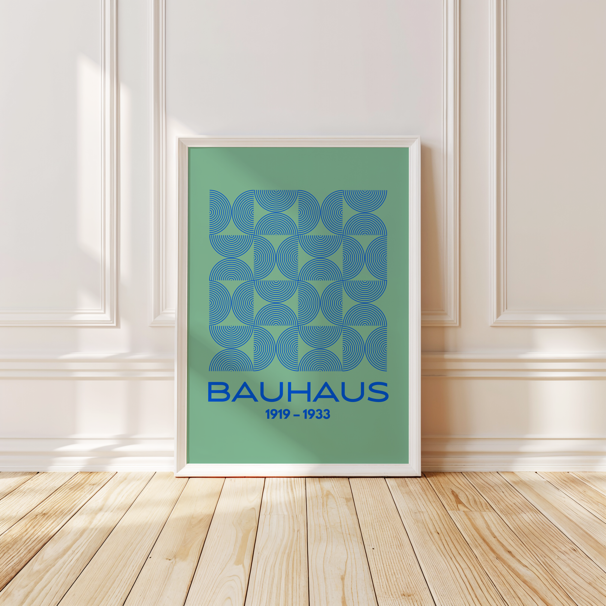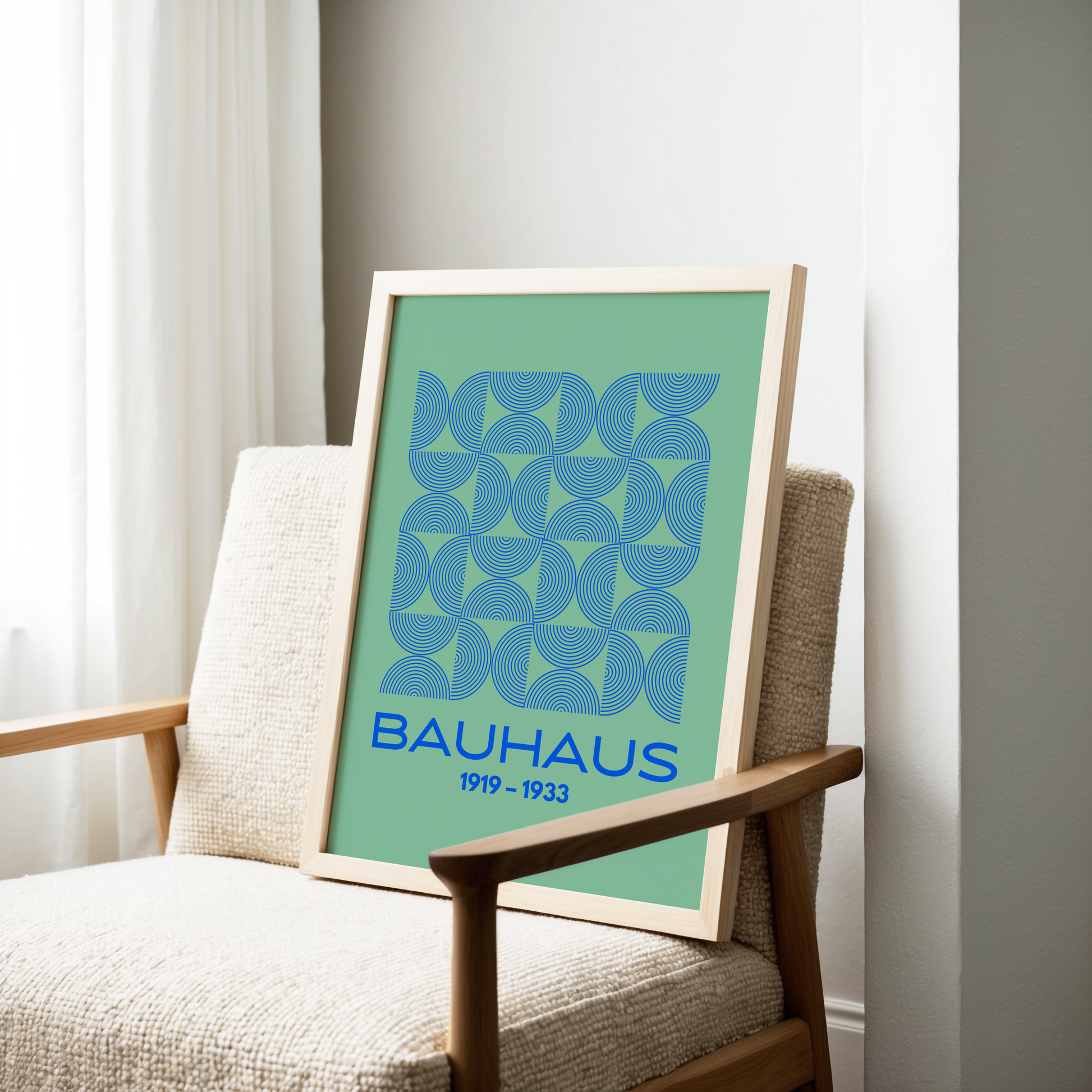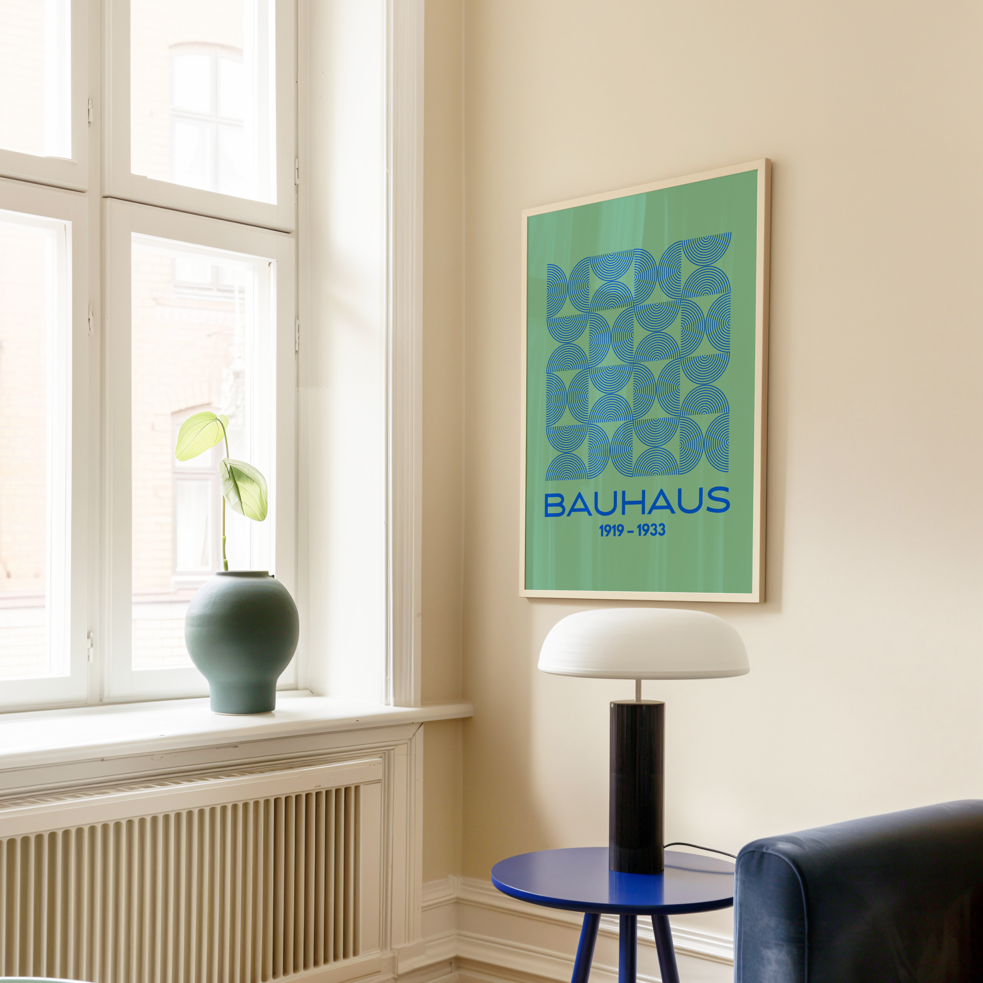 This poster print showcases a geometric design inspired by the Bauhaus movement, highlighted in vibrant shades of green and blue. The artwork is elegantly paired with the text "Bauhaus 1919-1933," paying homage to the influential art and design school that emerged during this iconic period. The combination of bold shapes and colours creates a striking visual experience that will enhance any space.