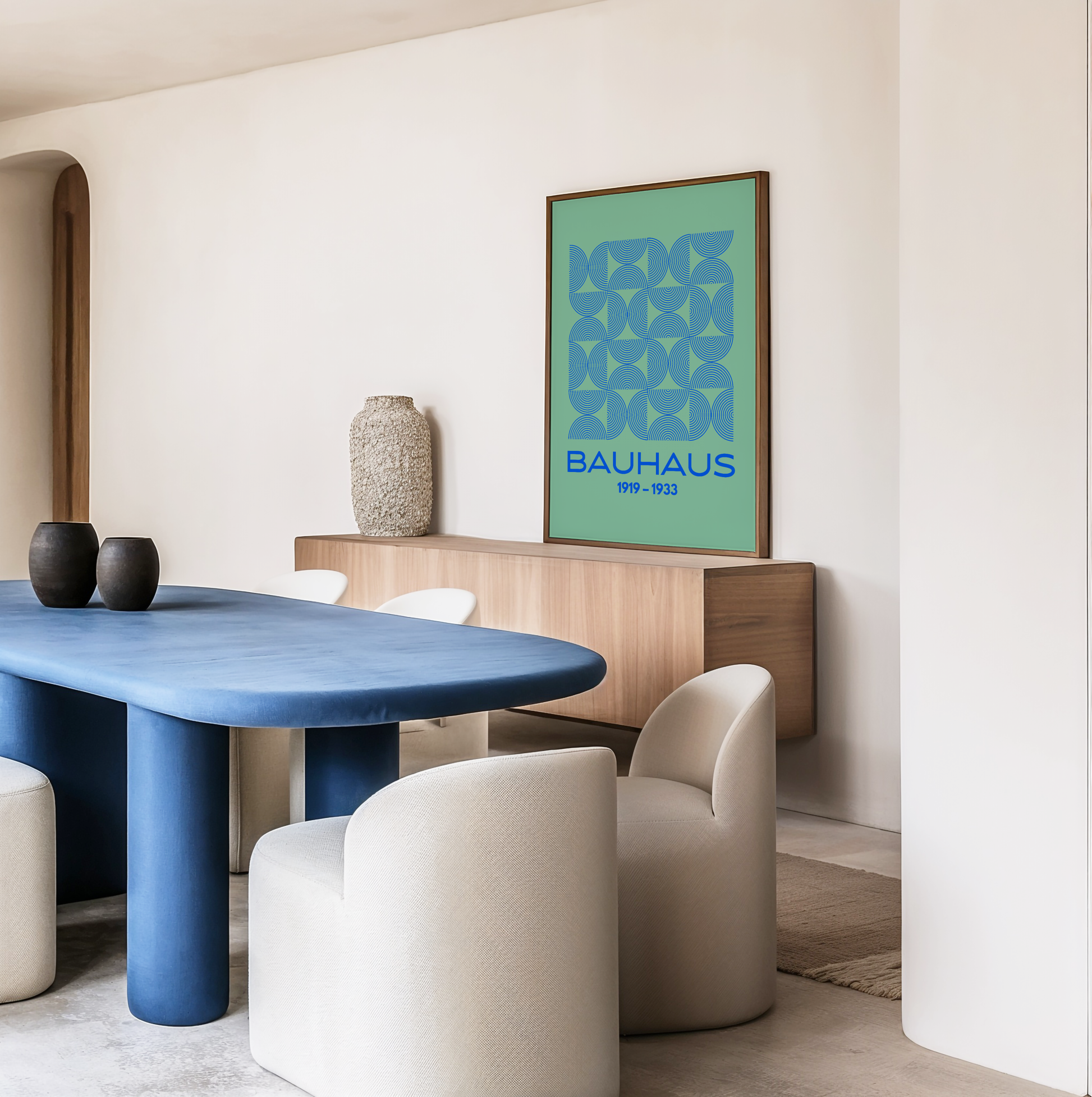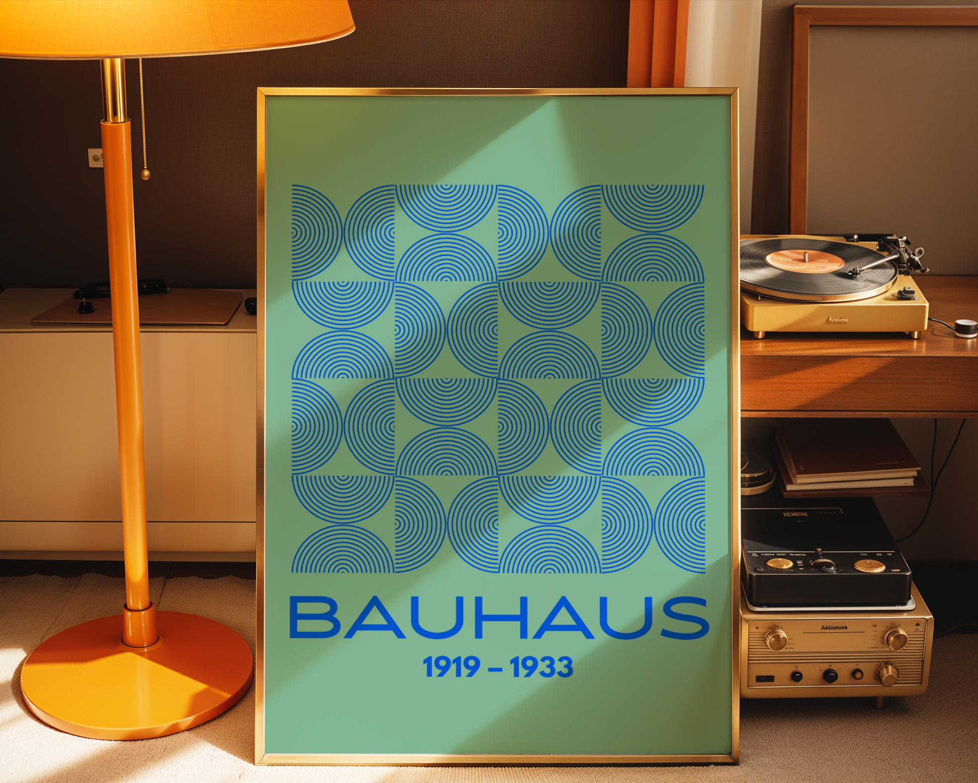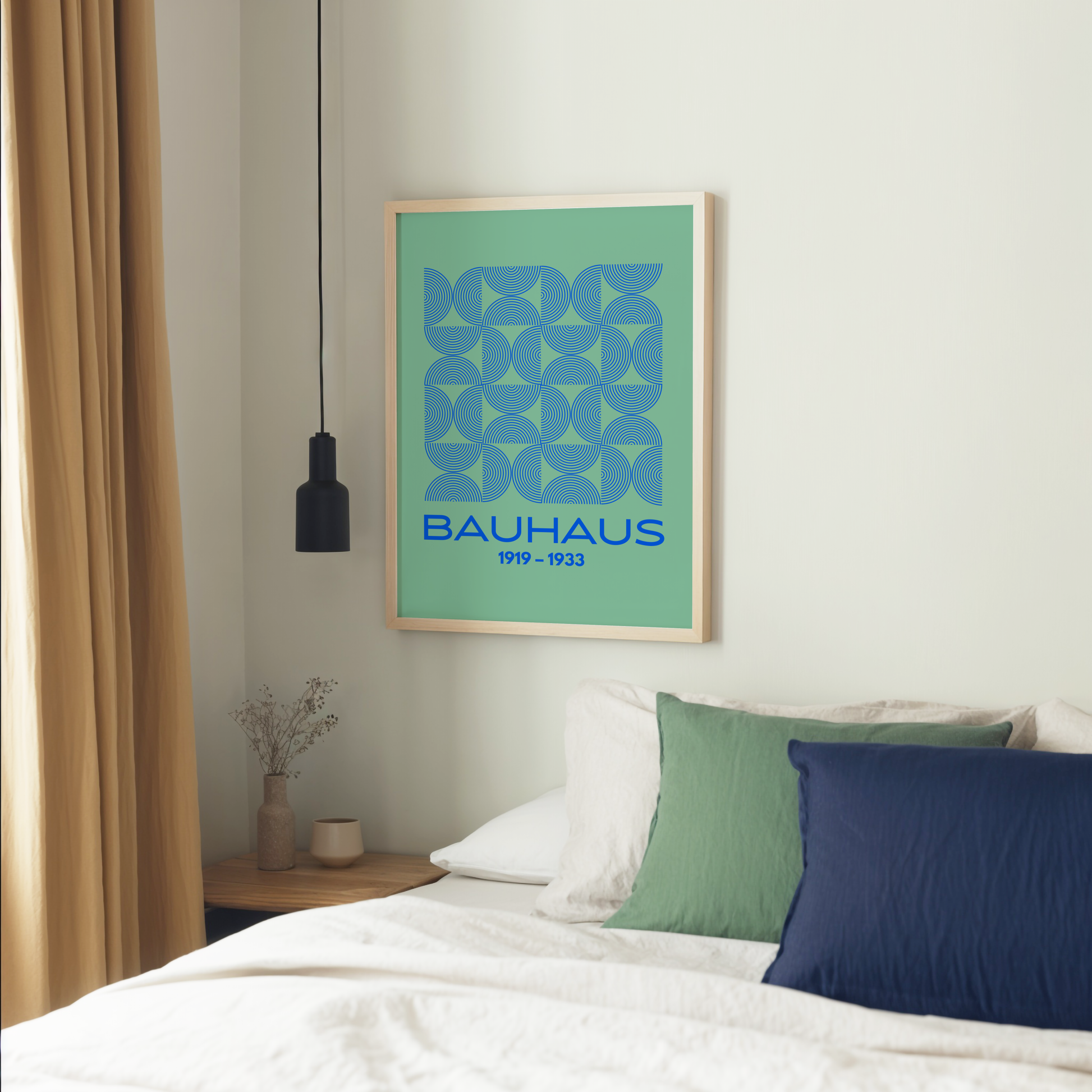 This poster print showcases a geometric design inspired by the Bauhaus movement, highlighted in vibrant shades of green and blue. The artwork is elegantly paired with the text "Bauhaus 1919-1933," paying homage to the influential art and design school that emerged during this iconic period. The combination of bold shapes and colours creates a striking visual experience that will enhance any space.
