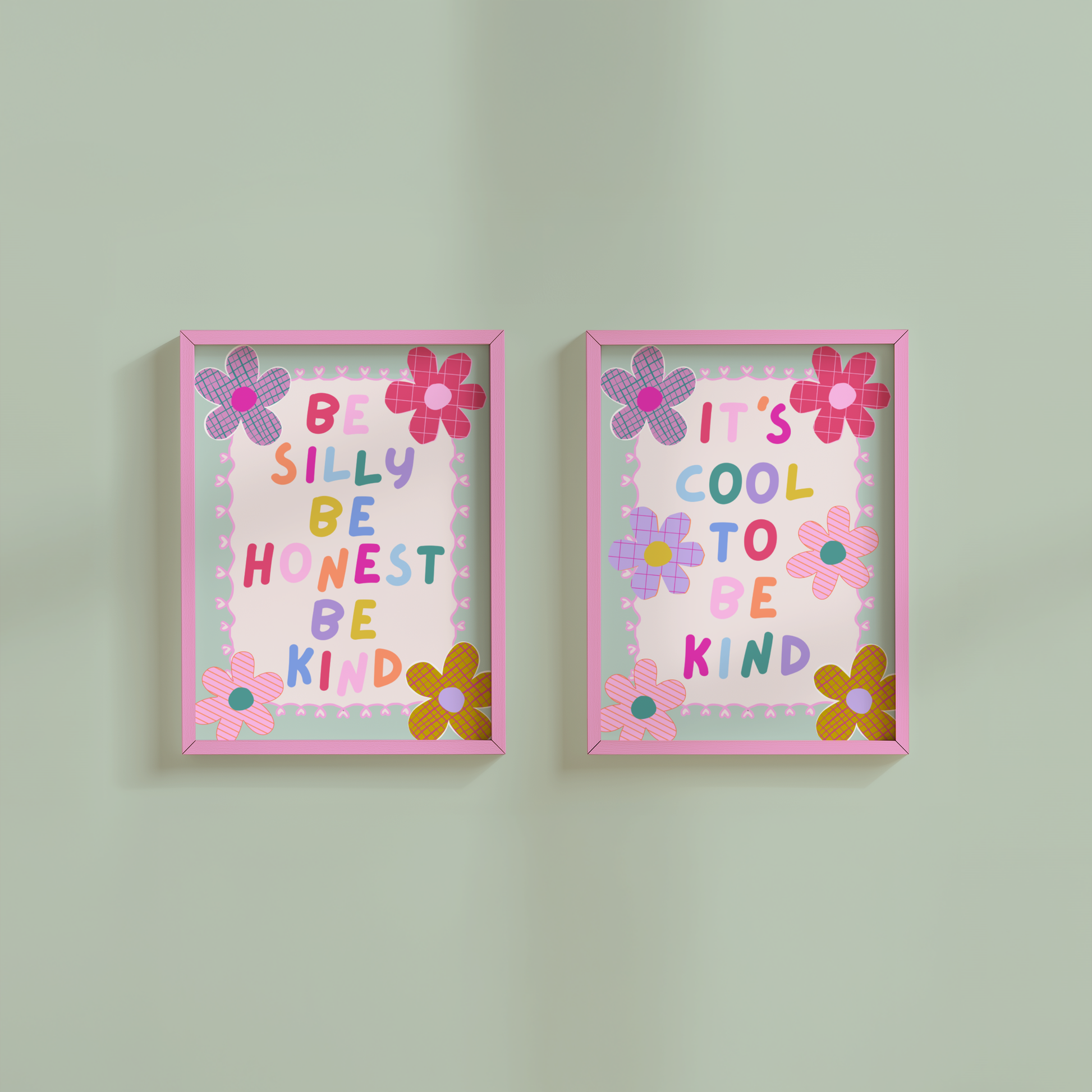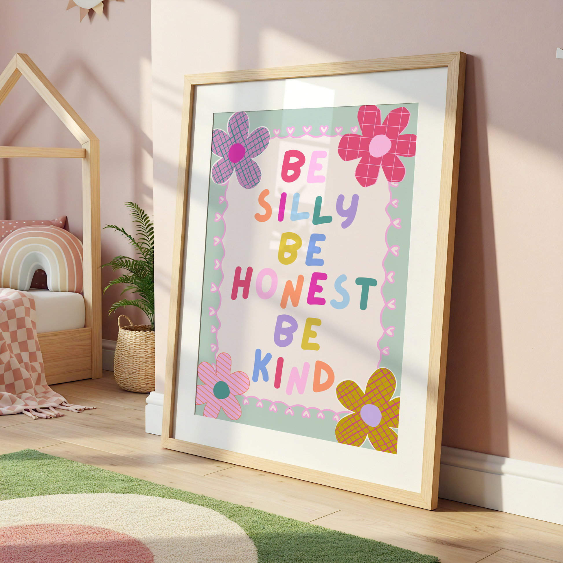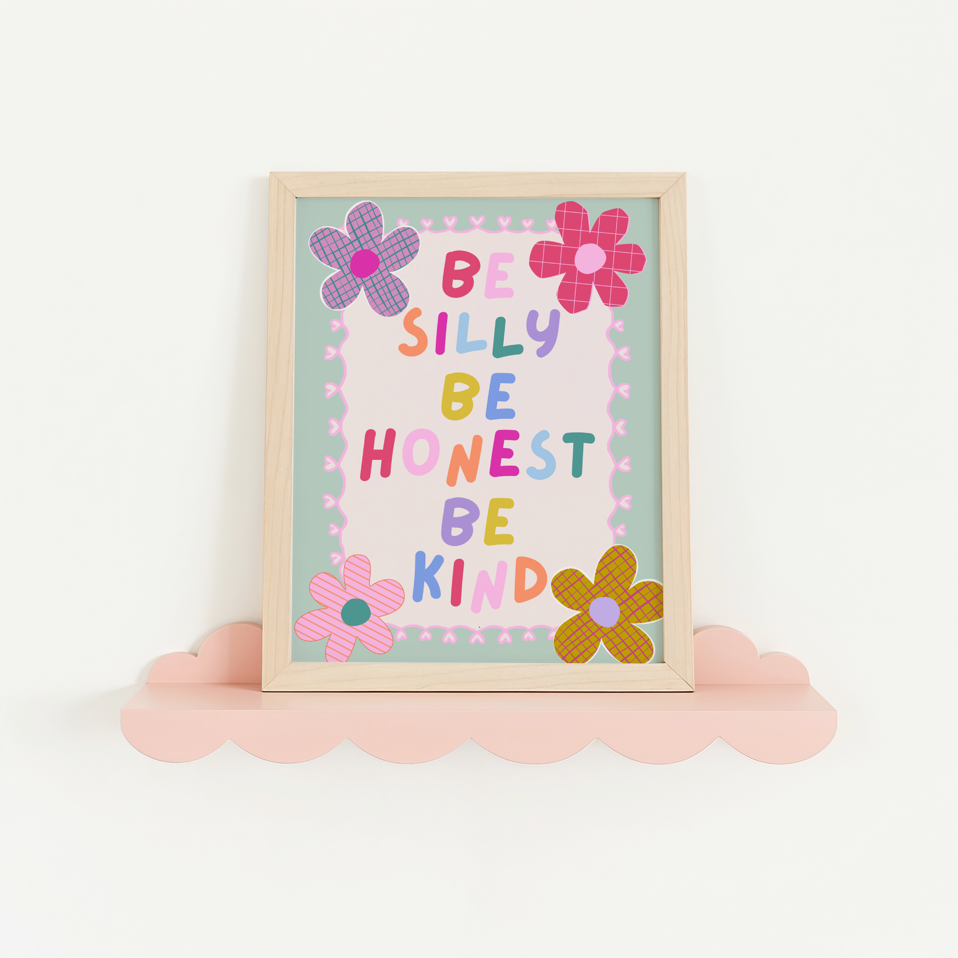 Bring joy, kindness, and colour to your child’s world with this “Be Silly, Be Honest, Be Kind” poster print. 🌸