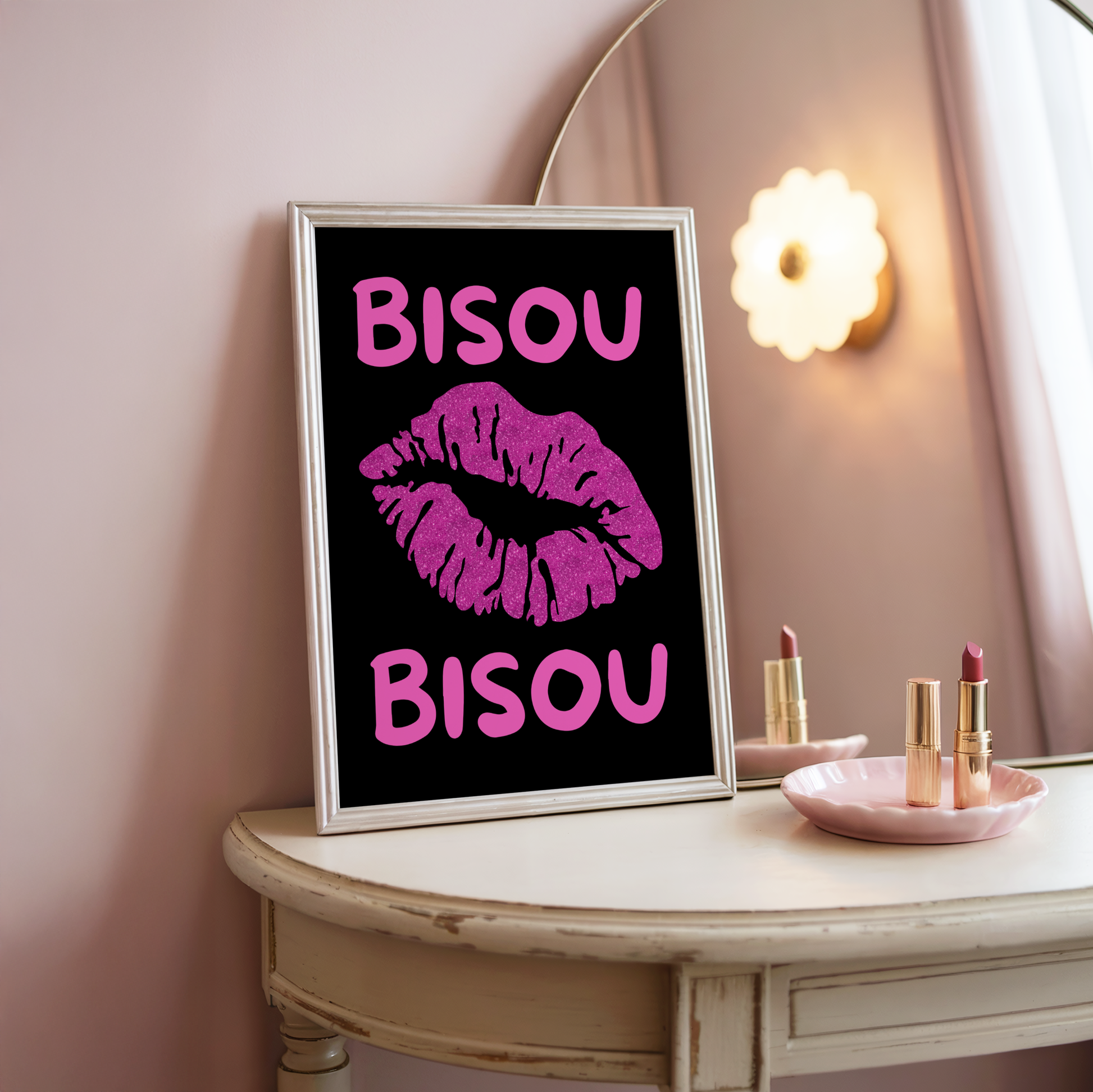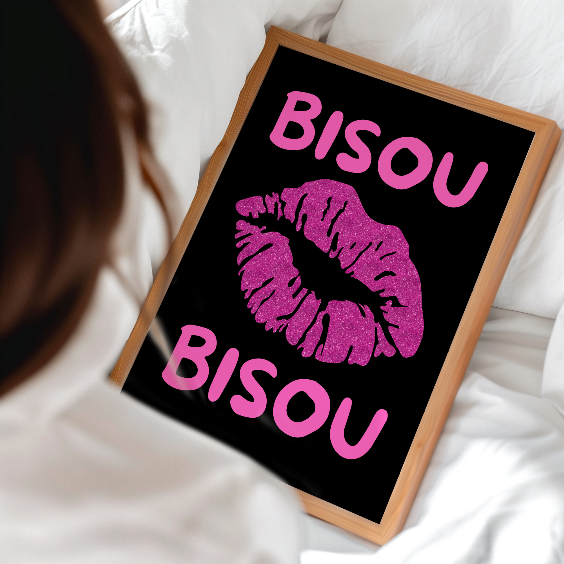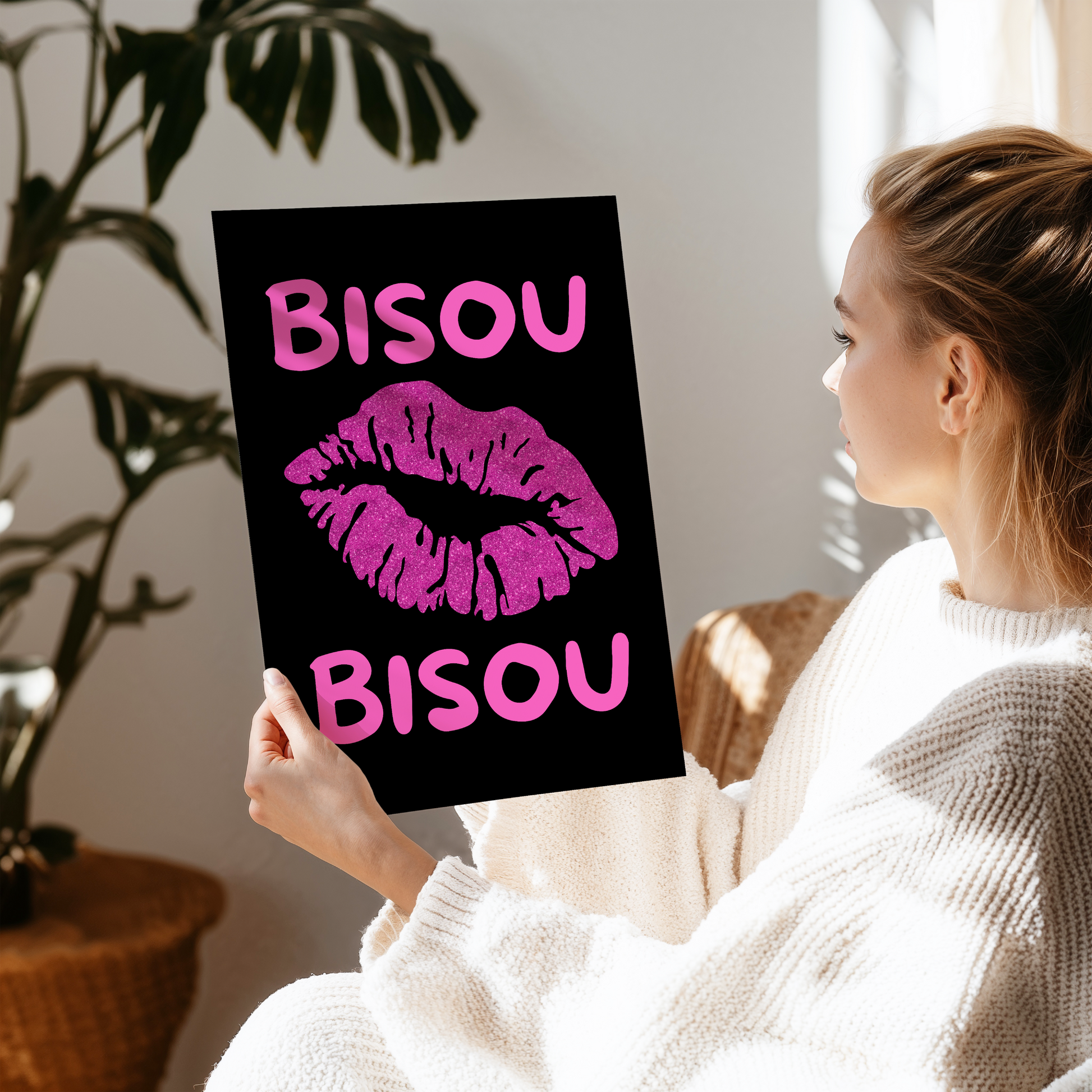 Add bold personality and a splash of glam to your space with this “Bisou Bisou” poster print featuring sparkling pink glitter lips and playful French typography. Perfect for lovers of pop art, Parisian chic, and all things femme.