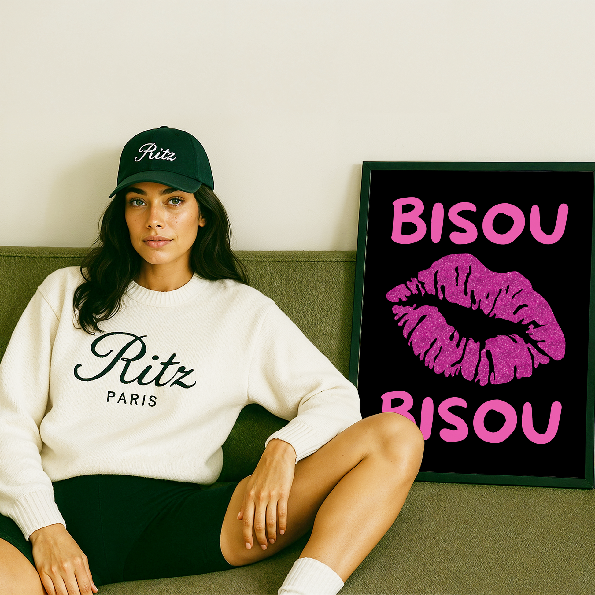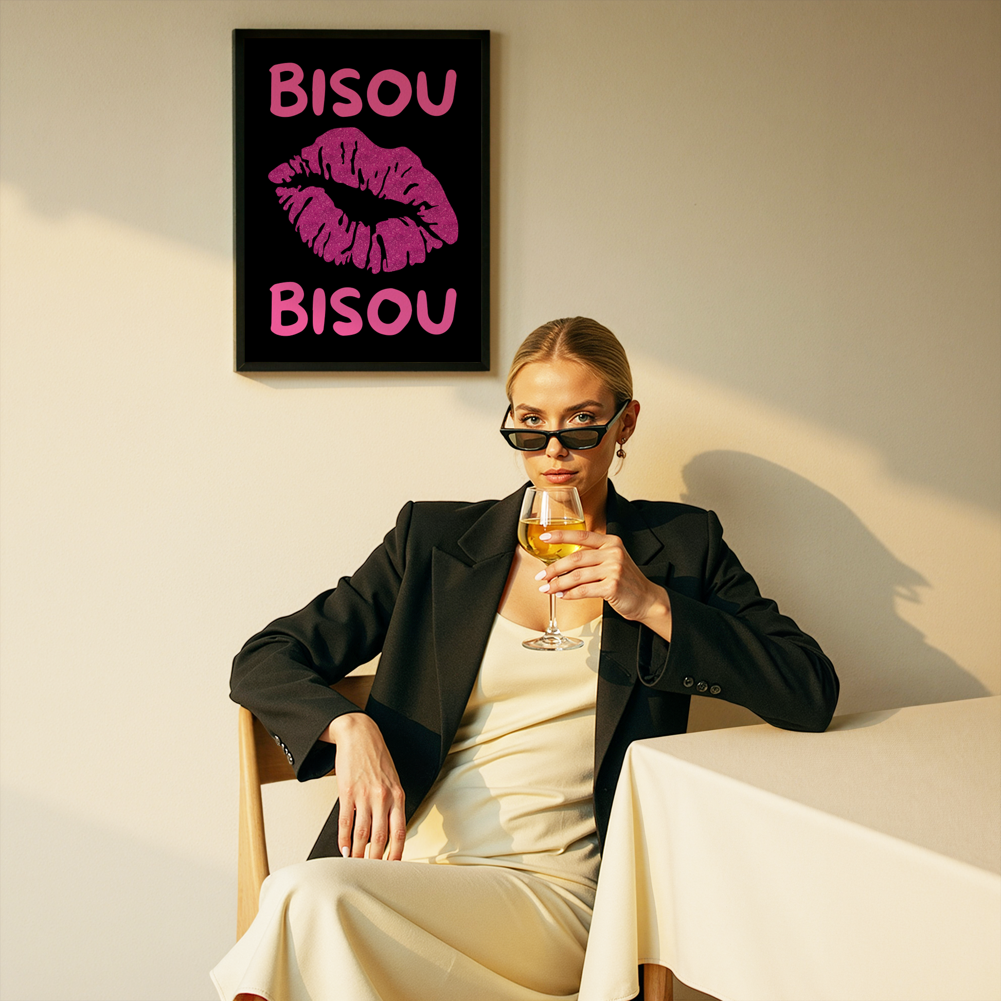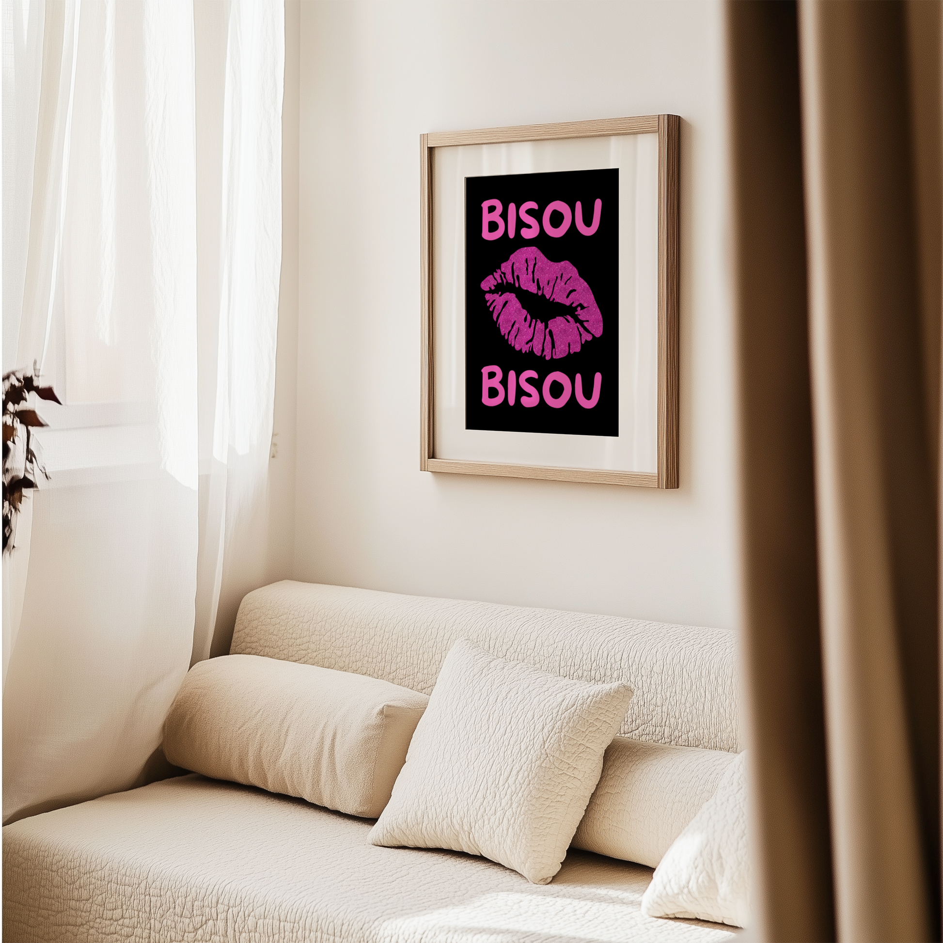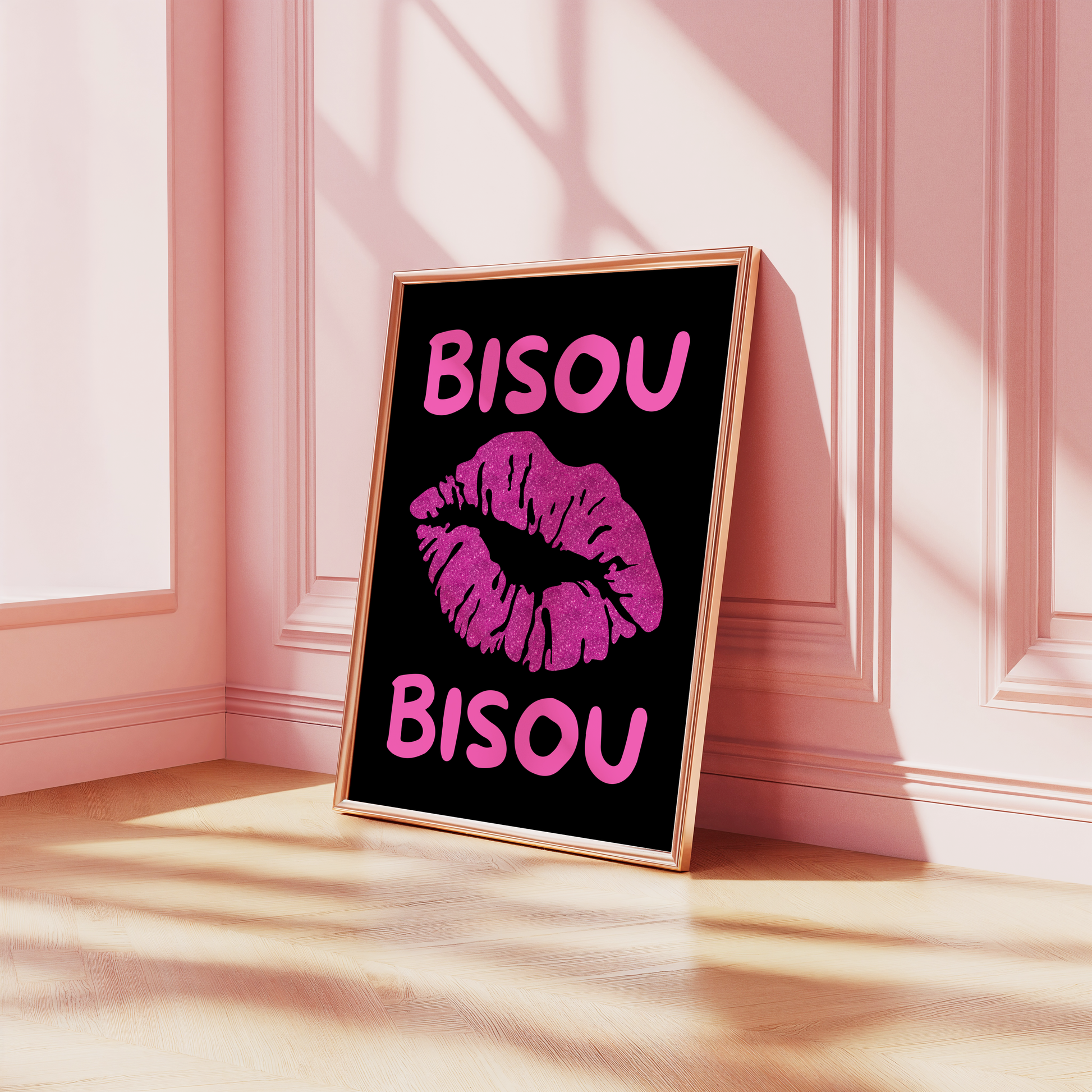 Add bold personality and a splash of glam to your space with this “Bisou Bisou” poster print featuring sparkling pink glitter lips and playful French typography. Perfect for lovers of pop art, Parisian chic, and all things femme.