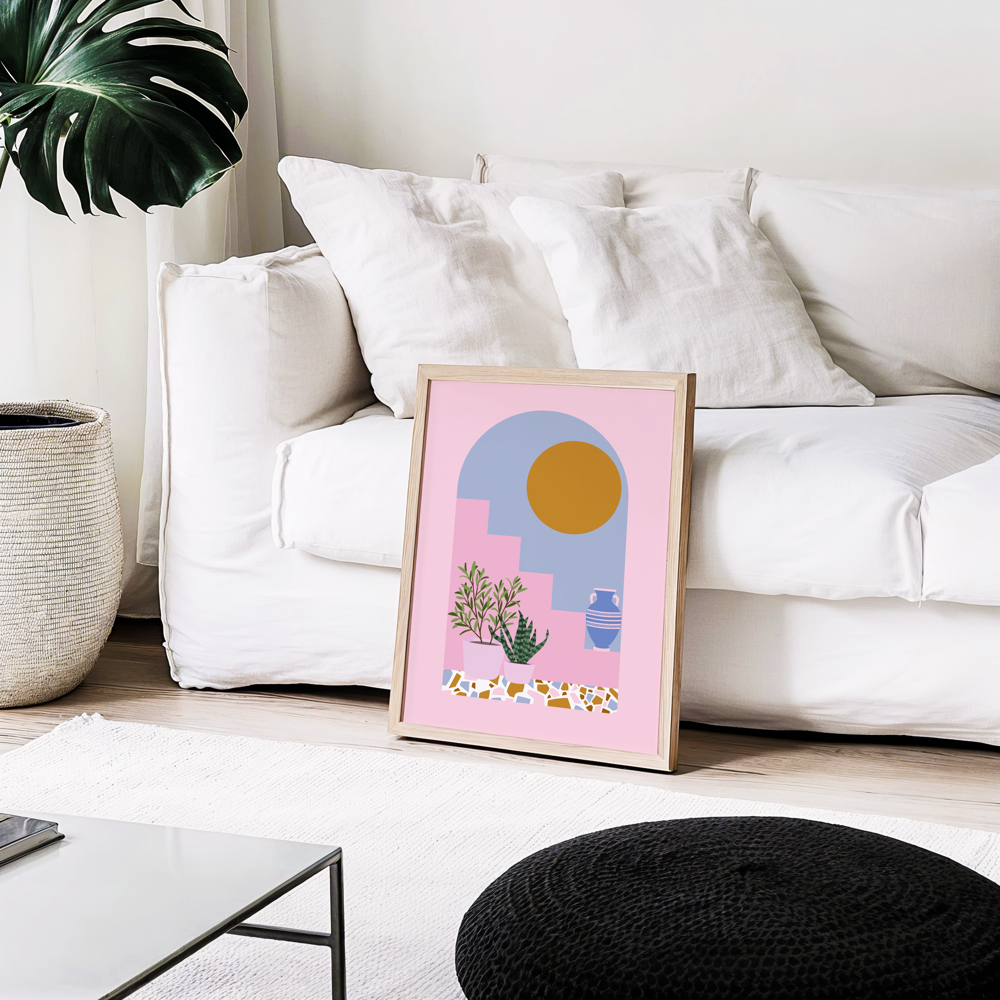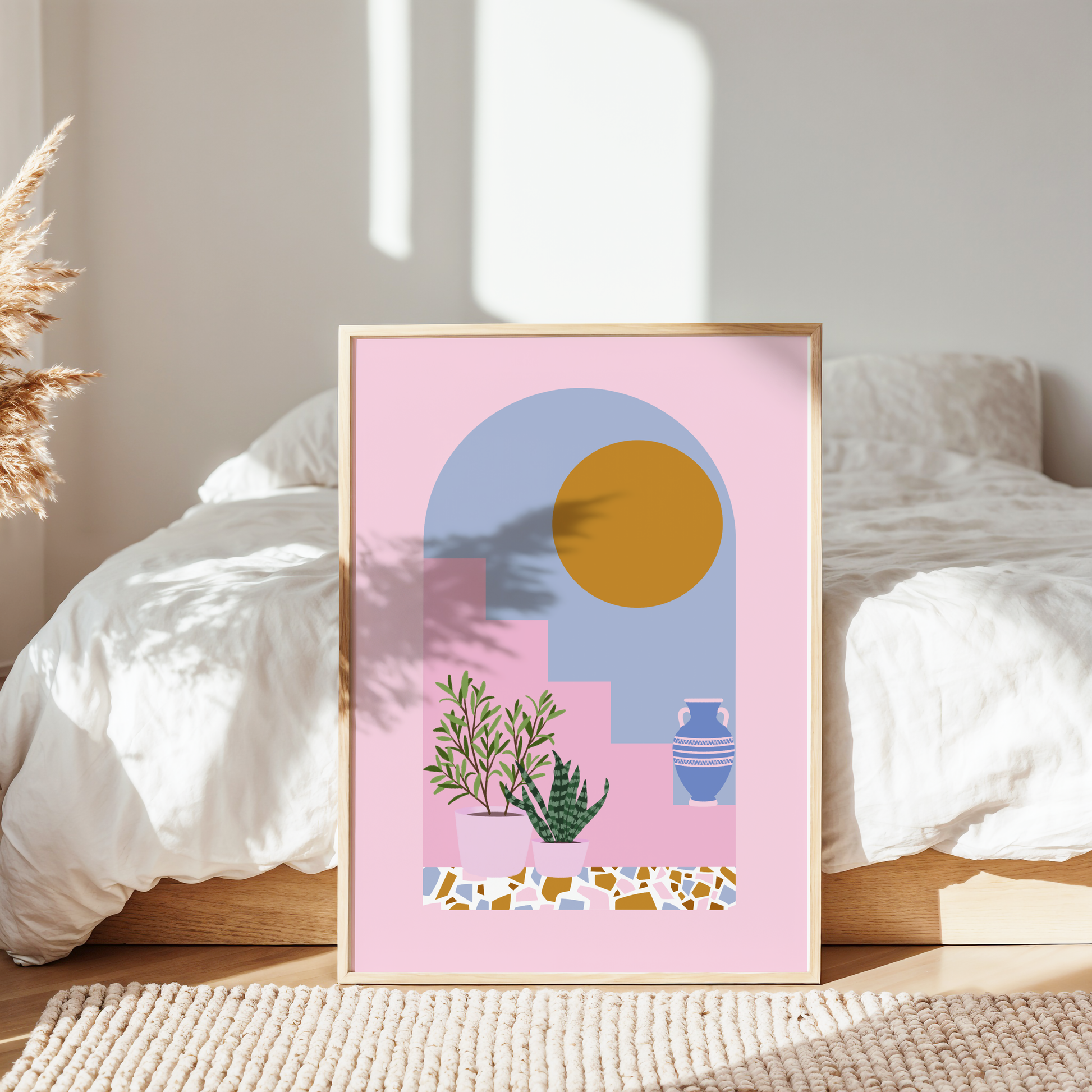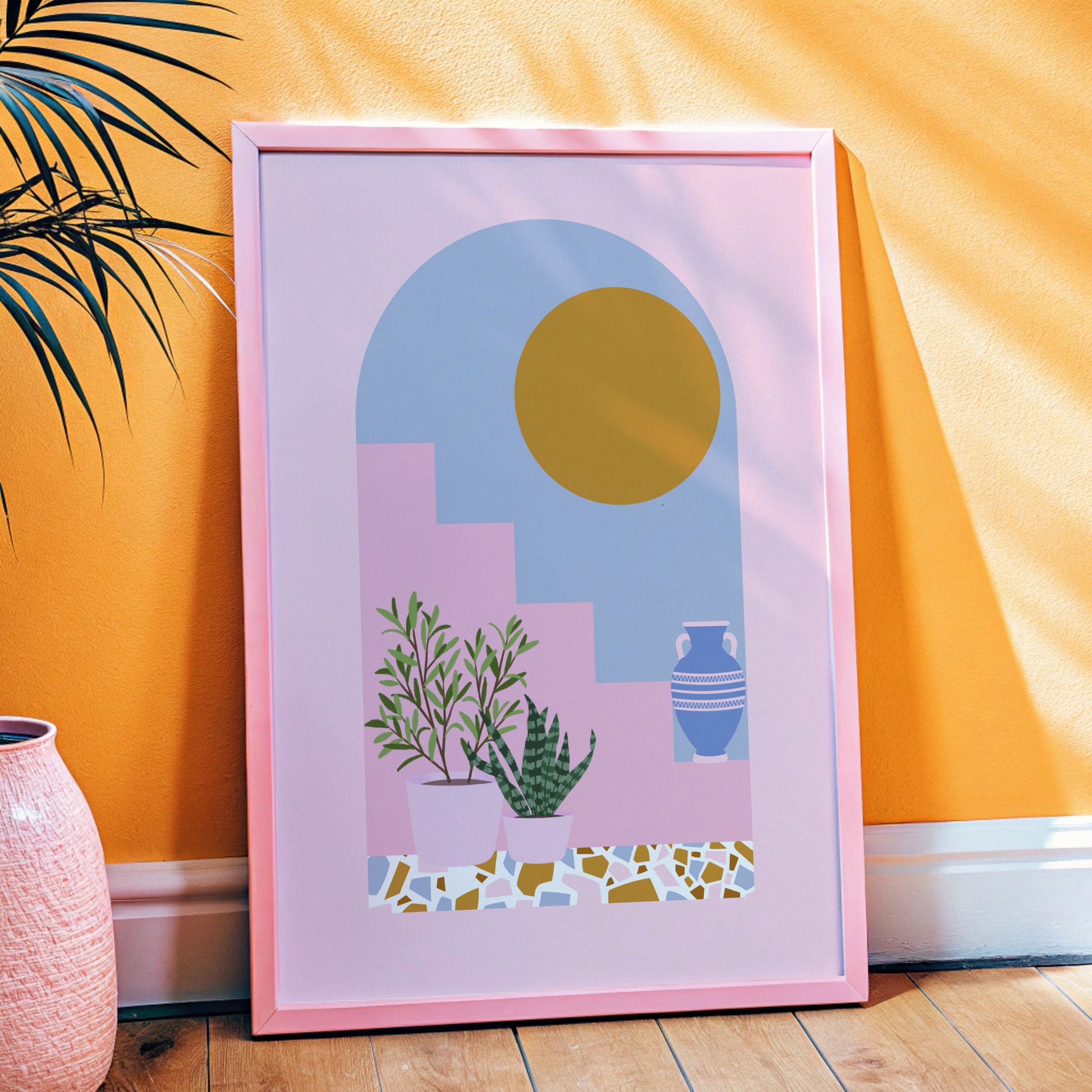Add a touch of bohemian dreaming to your space with this poster print. This modern 2D illustration features a beautifully balanced composition of a staircase, terrazzo floor, arched window, radiant sun, vase, and potted plants – all in a delicate and harmonious colour palette of blush pinks, blues and earthy tones.