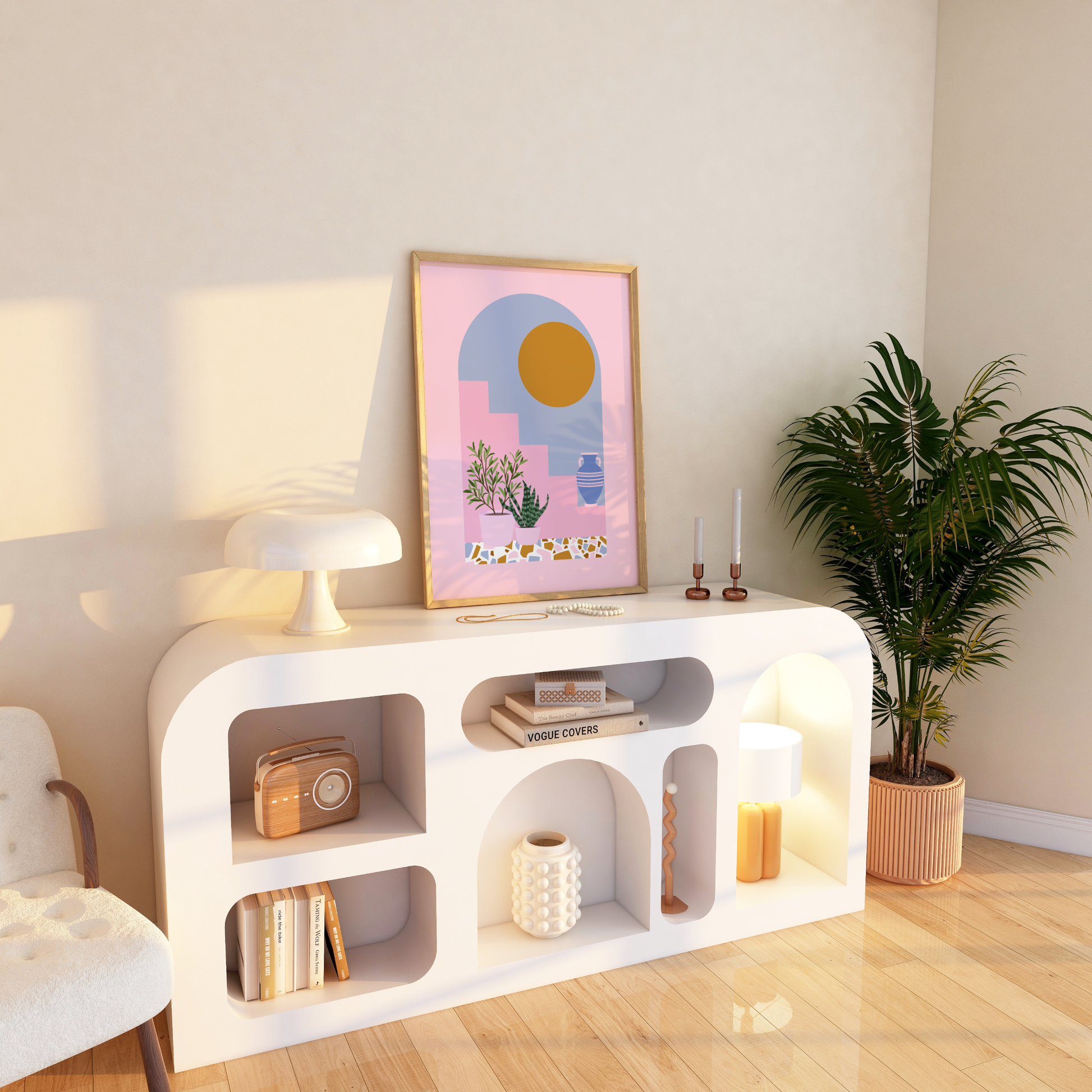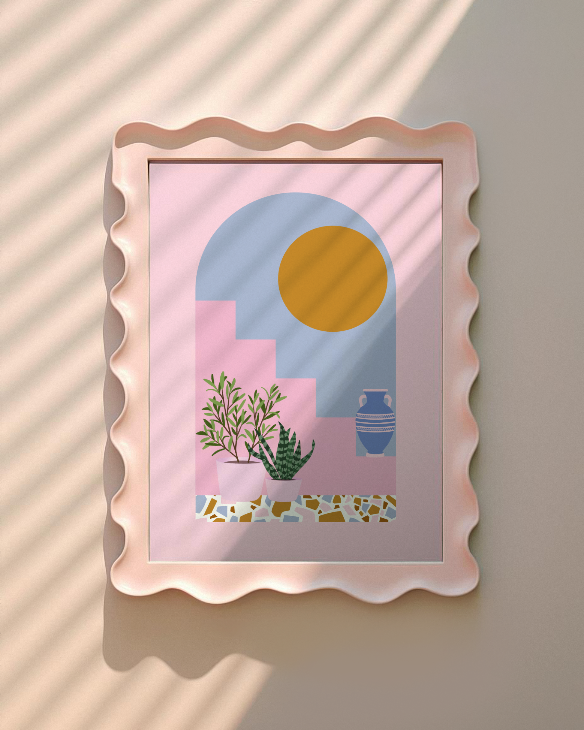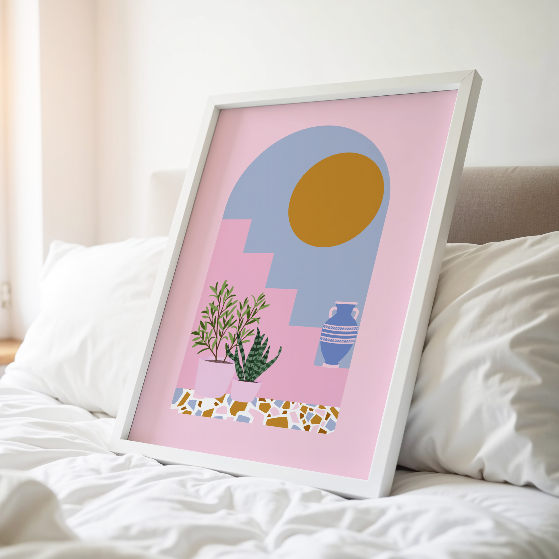Add a touch of bohemian dreaming to your space with this poster print. This modern 2D illustration features a beautifully balanced composition of a staircase, terrazzo floor, arched window, radiant sun, vase, and potted plants – all in a delicate and harmonious colour palette of blush pinks, blues and earthy tones.