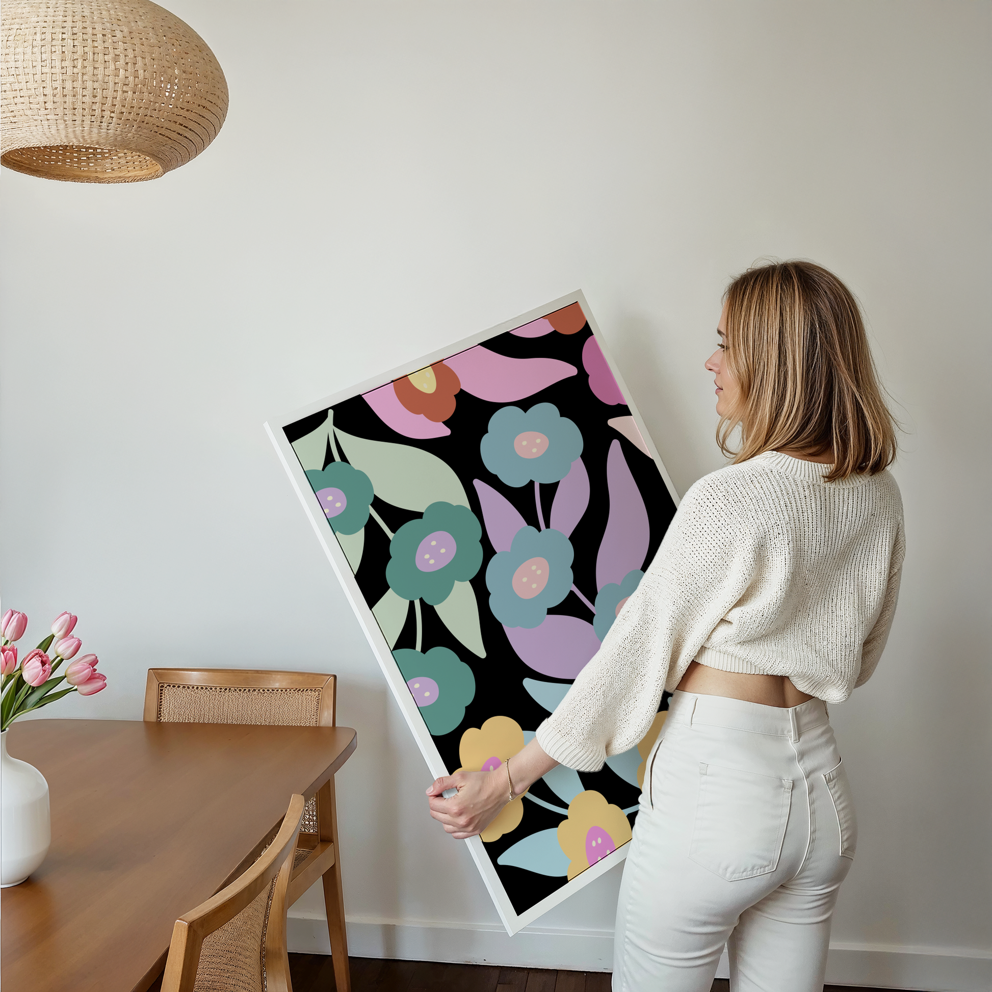 Bring bold colour and modern charm into your space with this Boho Floral poster print. Featuring a vibrant retro-inspired flower pattern in pastel blues, lilacs, pinks and soft yellows against a striking black background, this design instantly transforms any room with playful, modern energy.