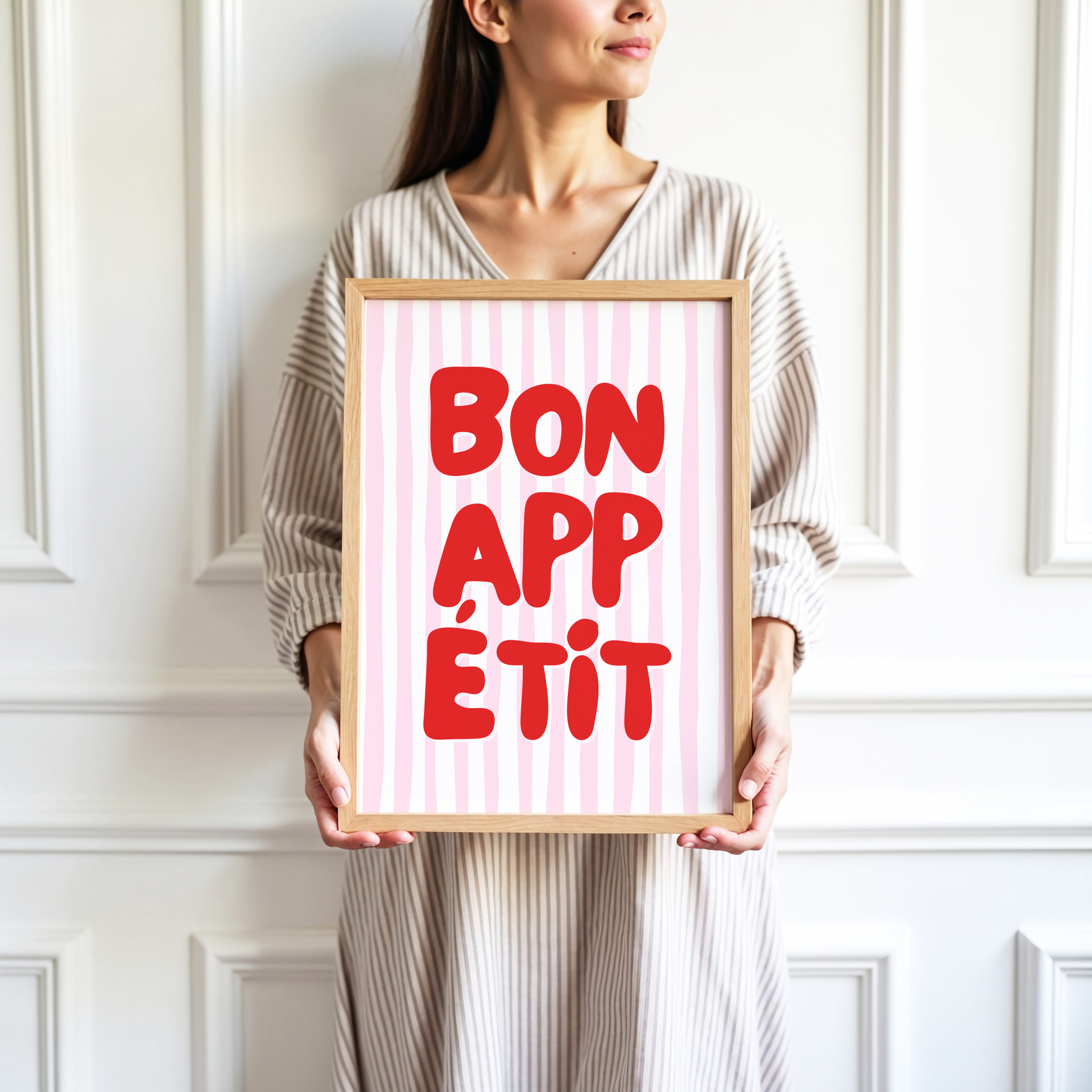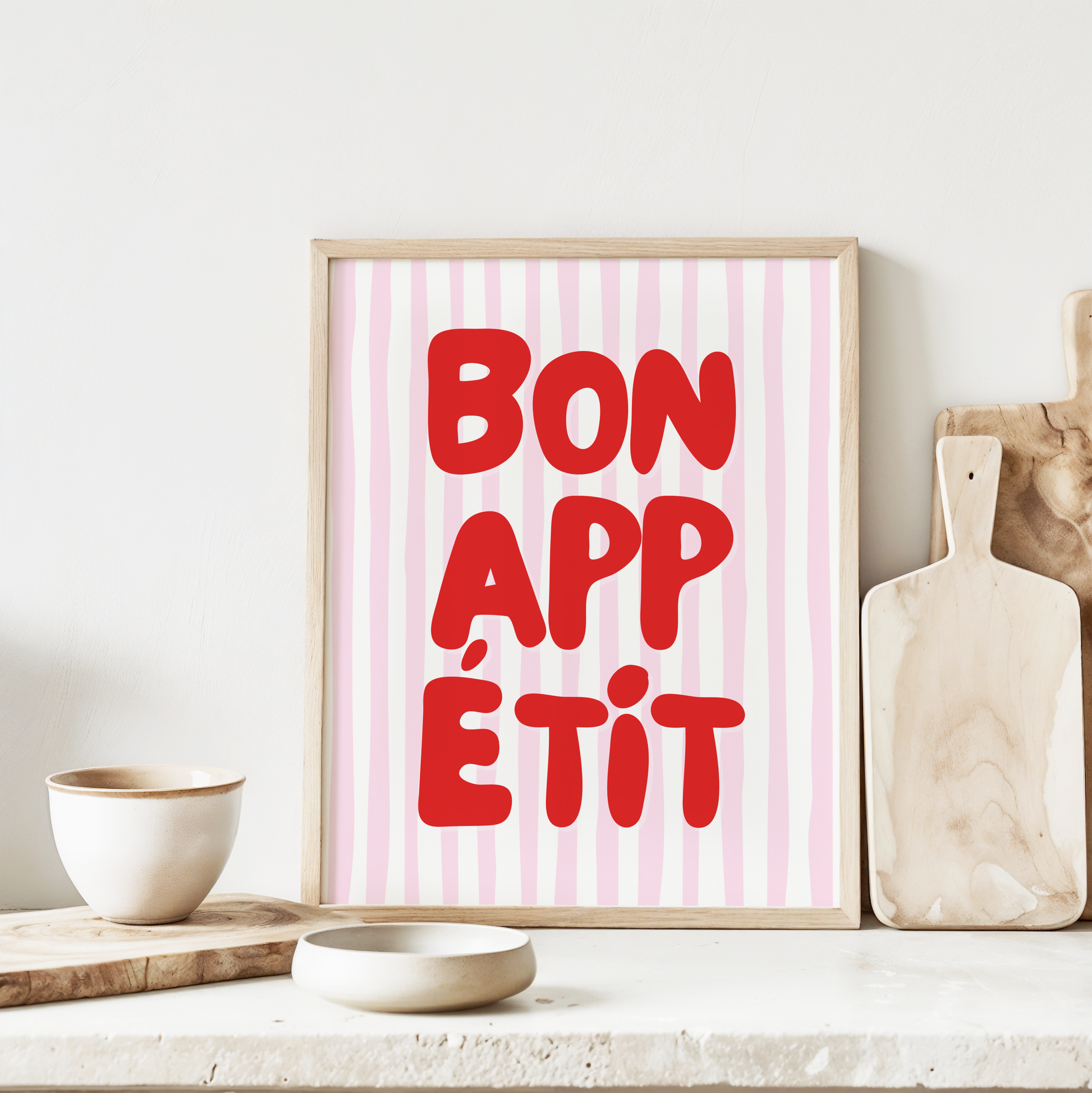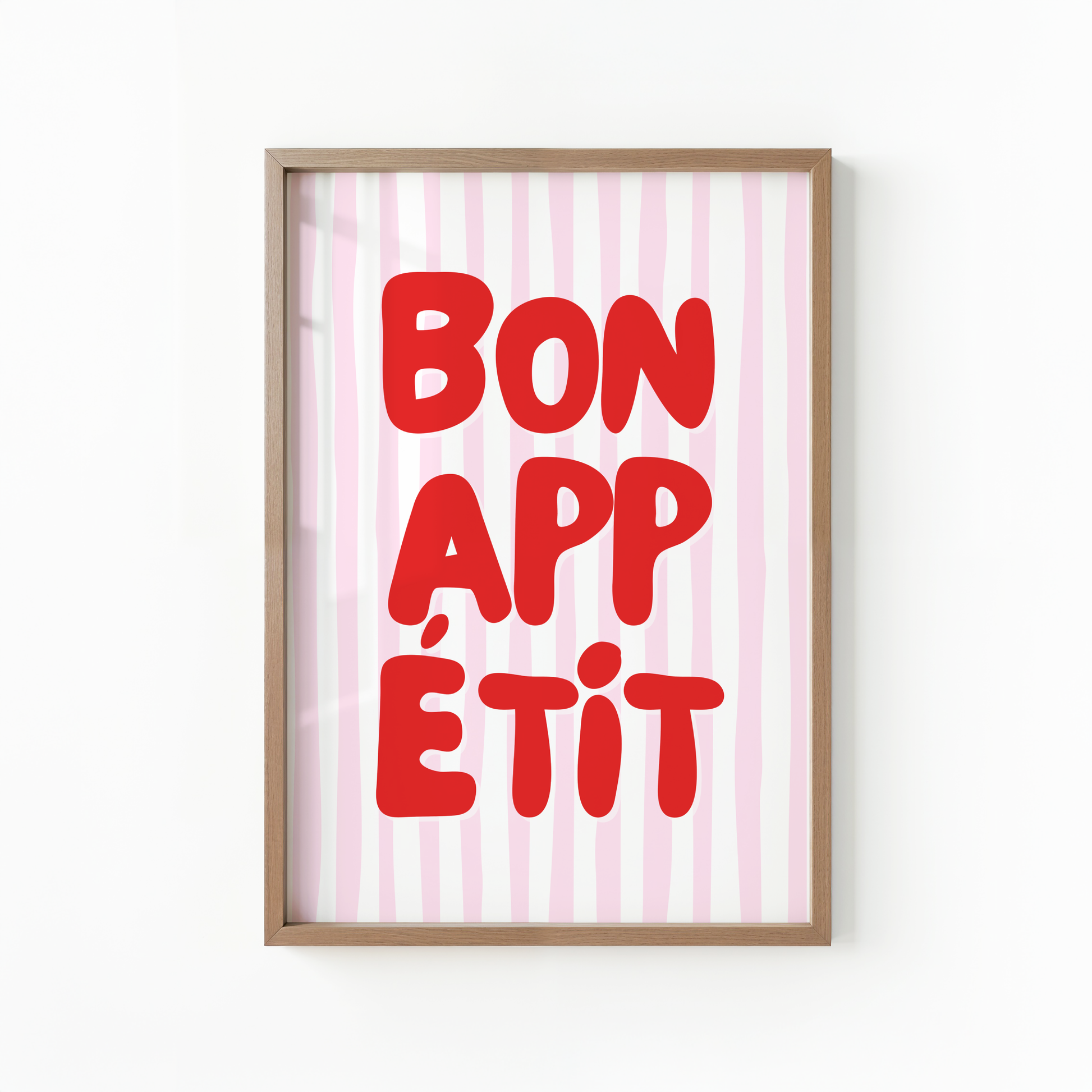 Give your kitchen or dining space a playful pop of pizzazz with this poster print that showcases a white and pink striped background and "Bon Appetit" in stylish red typography.