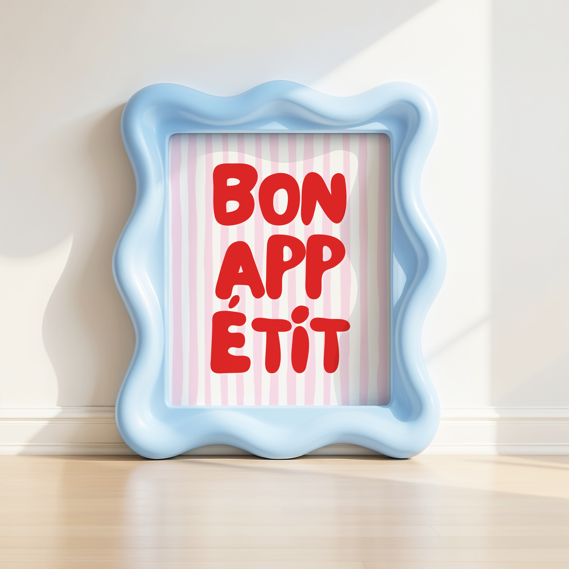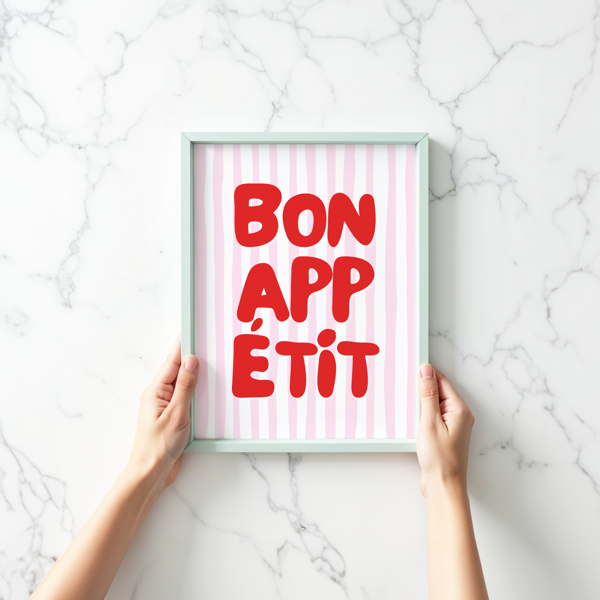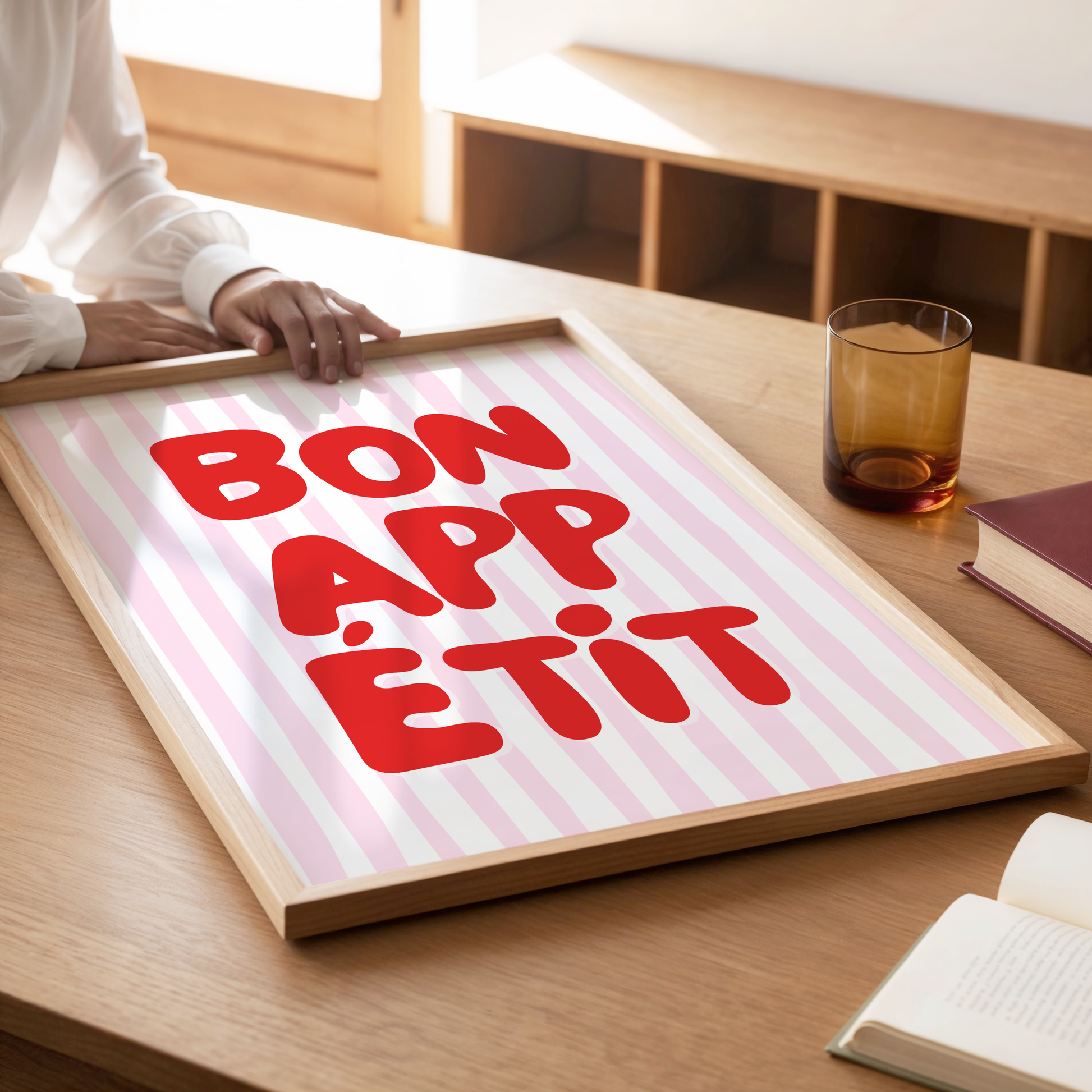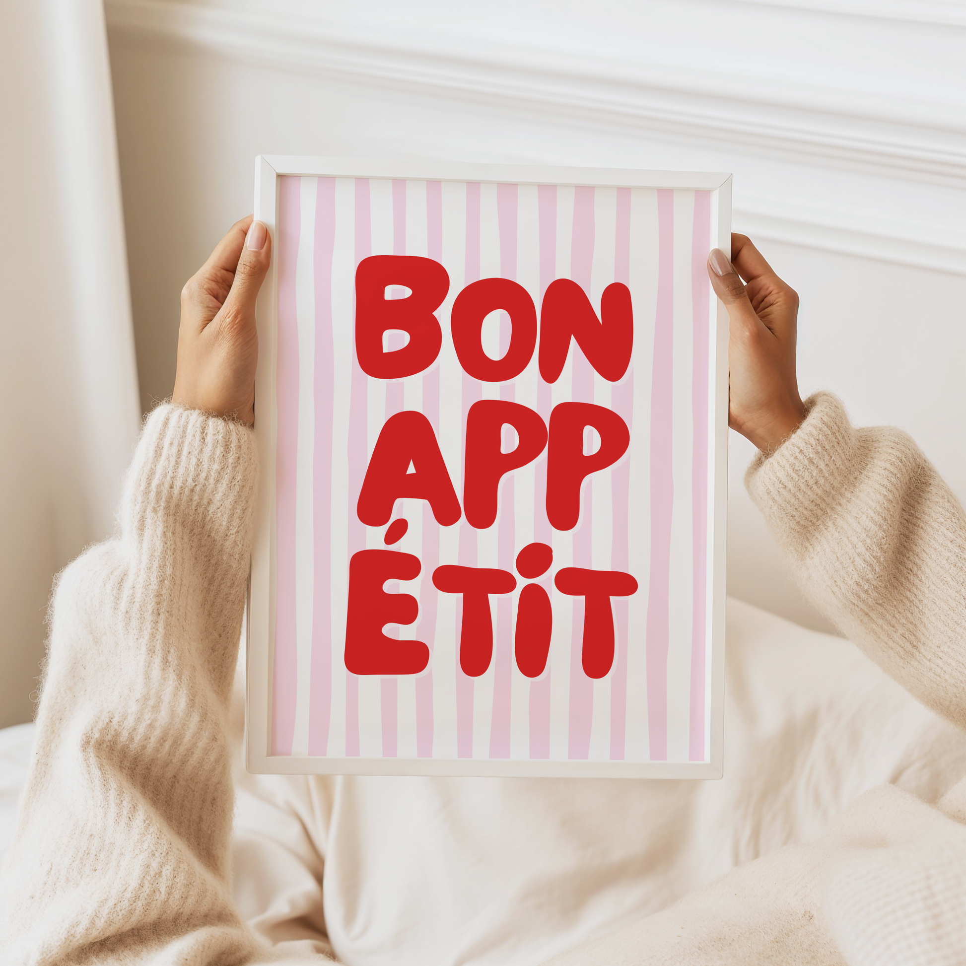 Give your kitchen or dining space a playful pop of pizzazz with this poster print that showcases a white and pink striped background and "Bon Appetit" in stylish red typography.