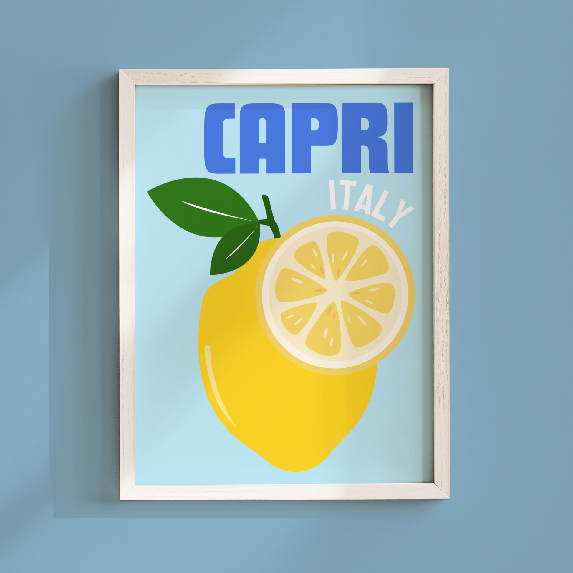 This vibrant poster print features a sunny sky blue background and a beautifully illustrated whole lemon and lemon slice, accompanied by the words "CAPRI, ITALY" in bold blue typography. It’s a fresh and zesty way to liven up your kitchen, dining room, or living space with a touch of Mediterranean beauty.