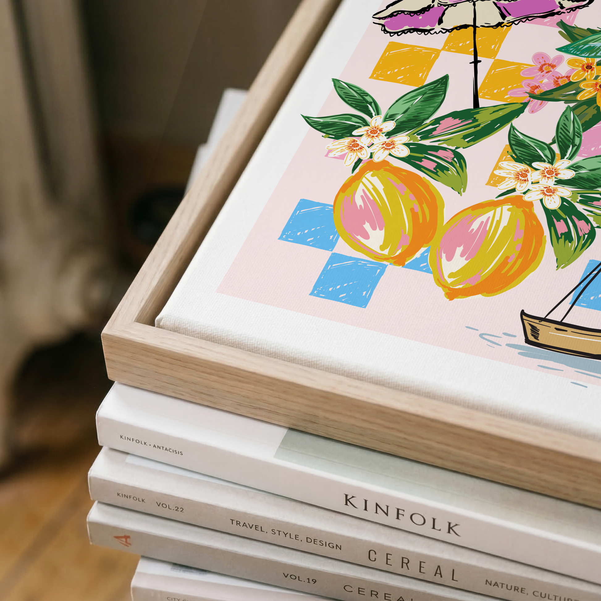 Transport your space to the sun-soaked shores of Capri with this bright and joyful poster print. Featuring a playful blend of citrus fruits, a striped sailboat, and a charming parasol, this print captures the essence of Italian summer in a bold, colourful style.