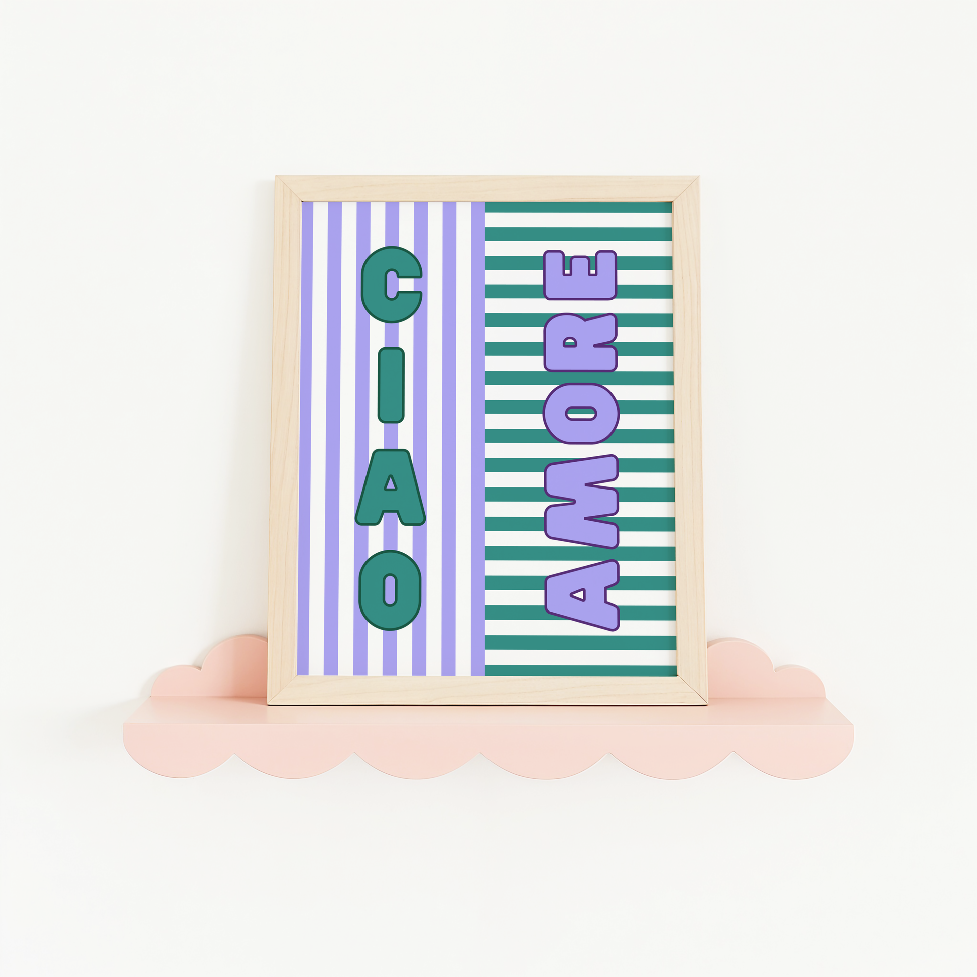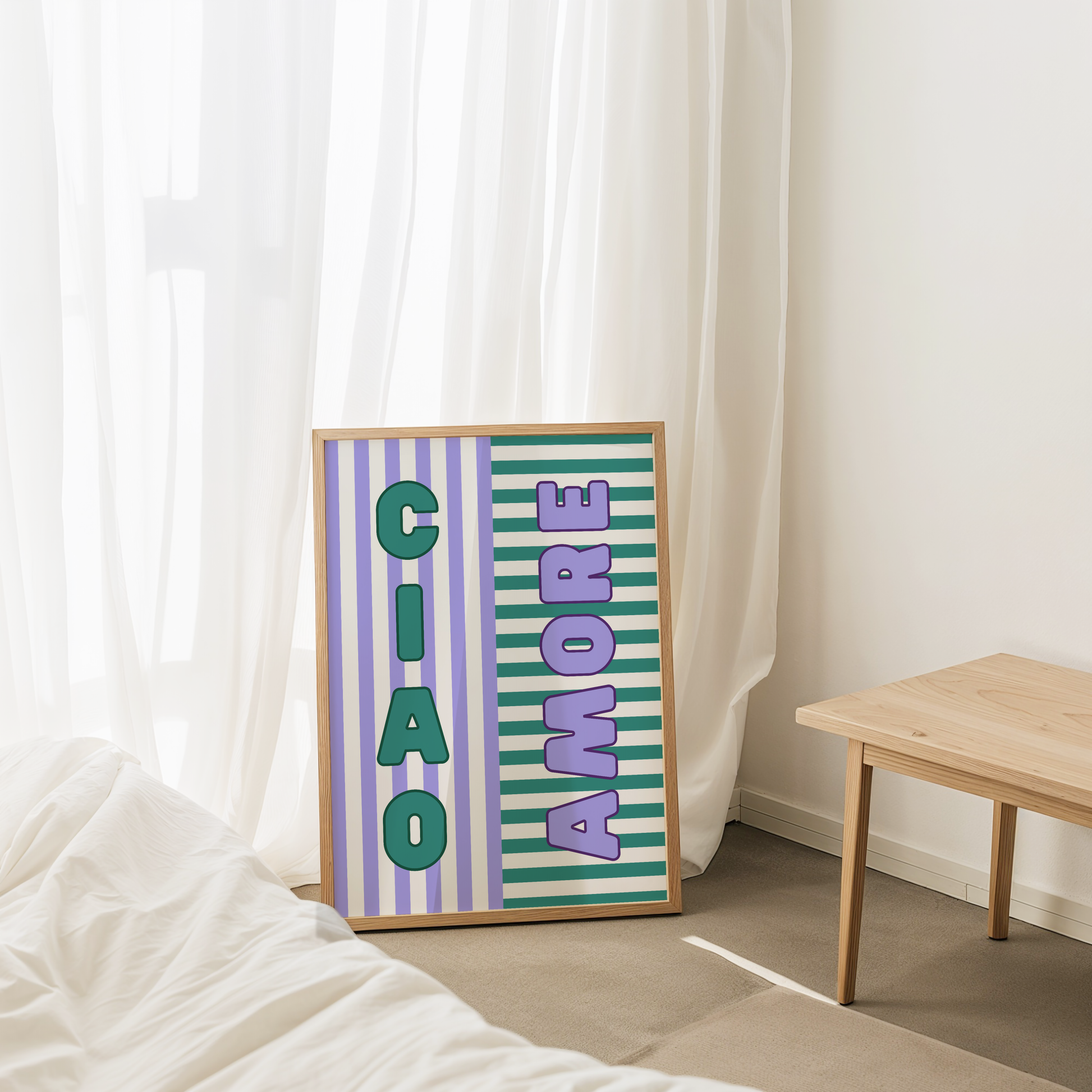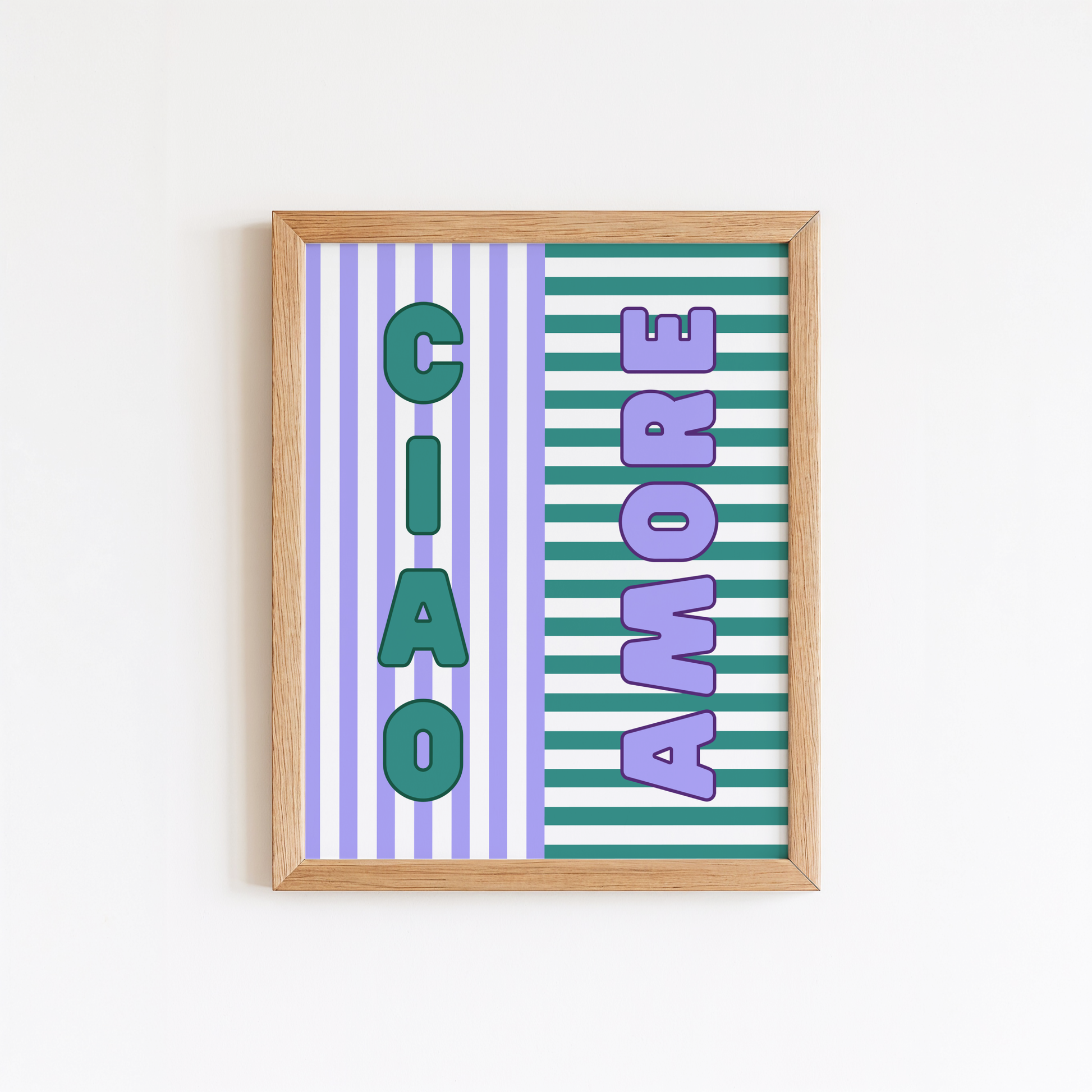 Say hello to love with this playful and vibrant “Ciao Amore” poster print. Featuring bold typography in Italian (Ciao = Hello, Amore = Love), this modern retro design is split down the middle with lavender and teal stripes, adding a fun and eye-catching twist.