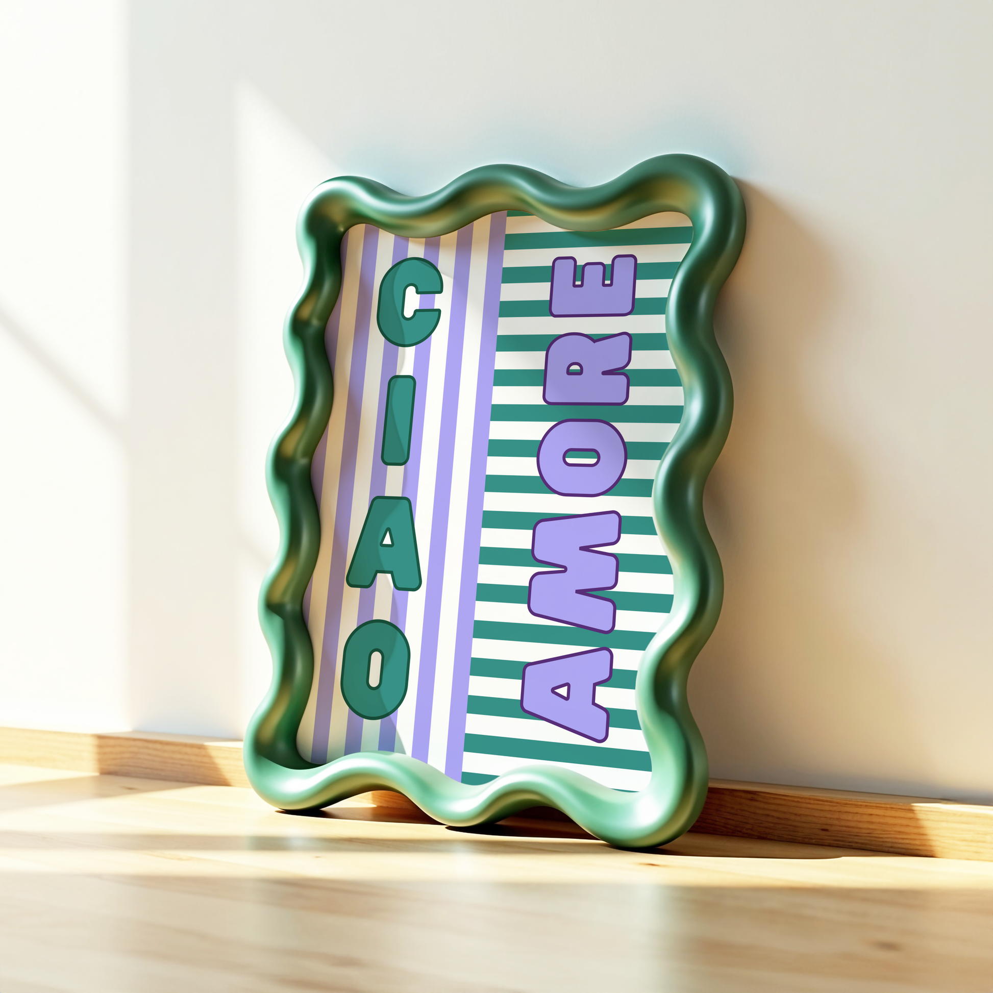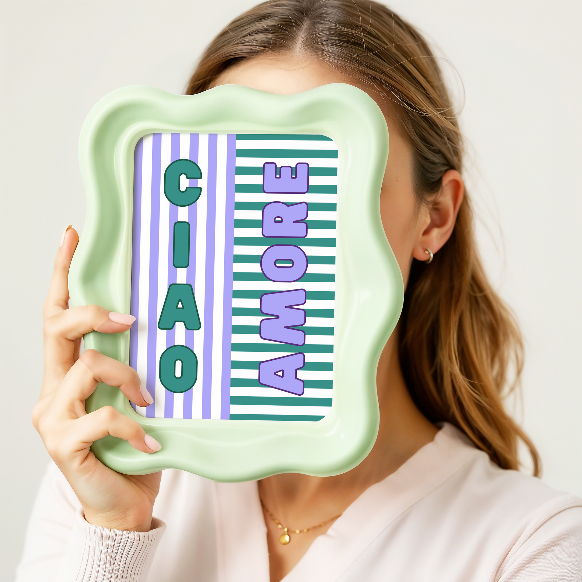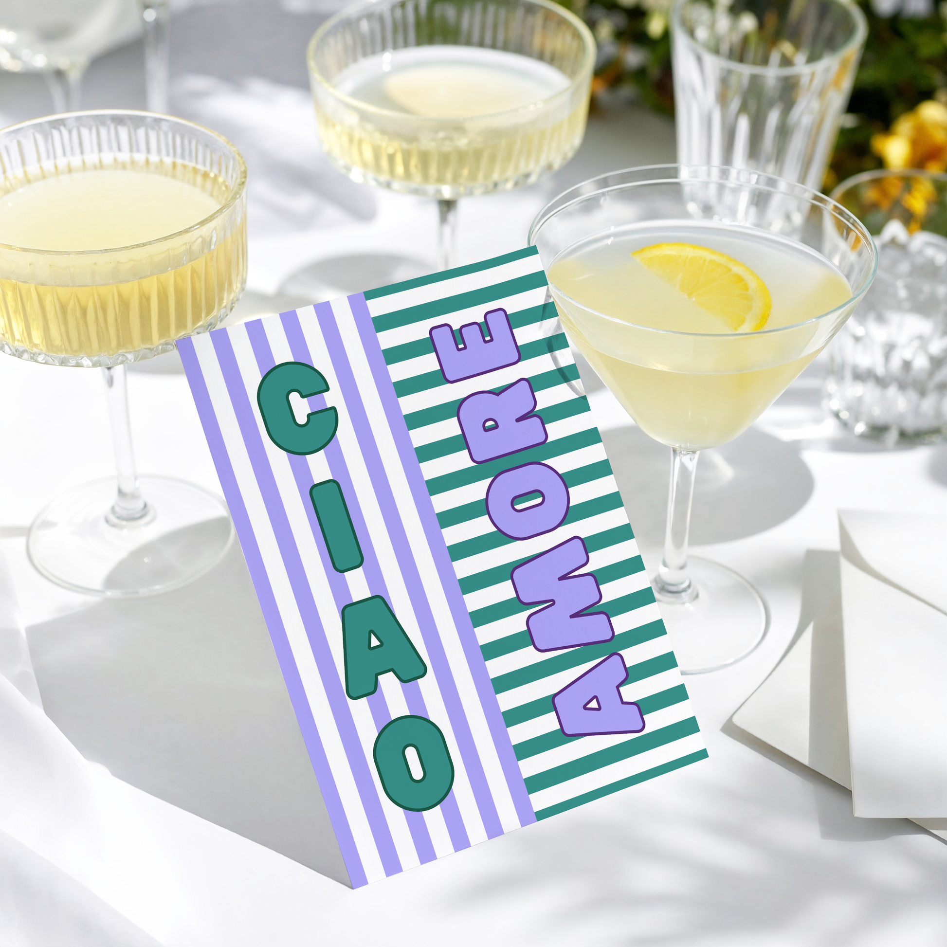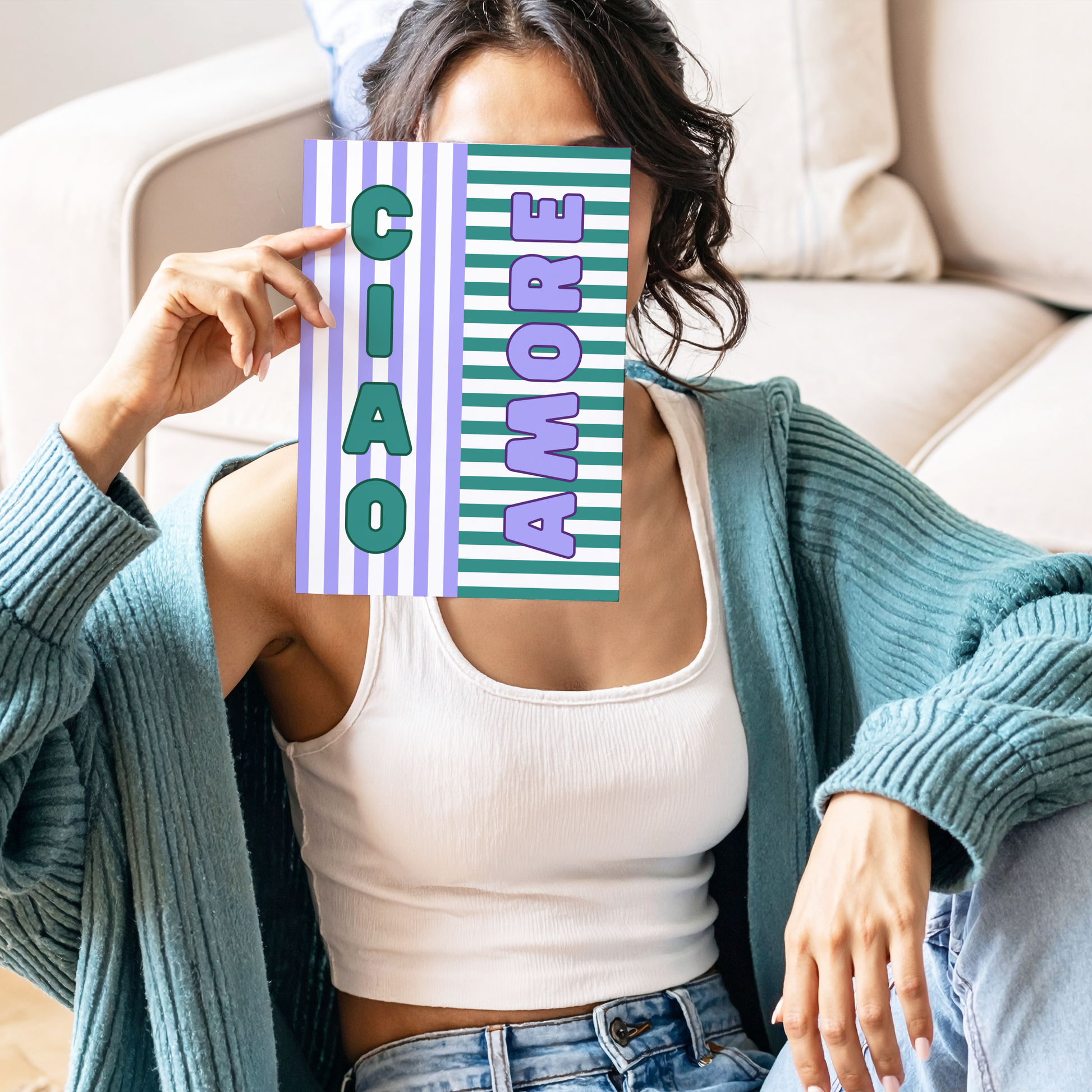 Say hello to love with this playful and vibrant “Ciao Amore” poster print. Featuring bold typography in Italian (Ciao = Hello, Amore = Love), this modern retro design is split down the middle with lavender and teal stripes, adding a fun and eye-catching twist.