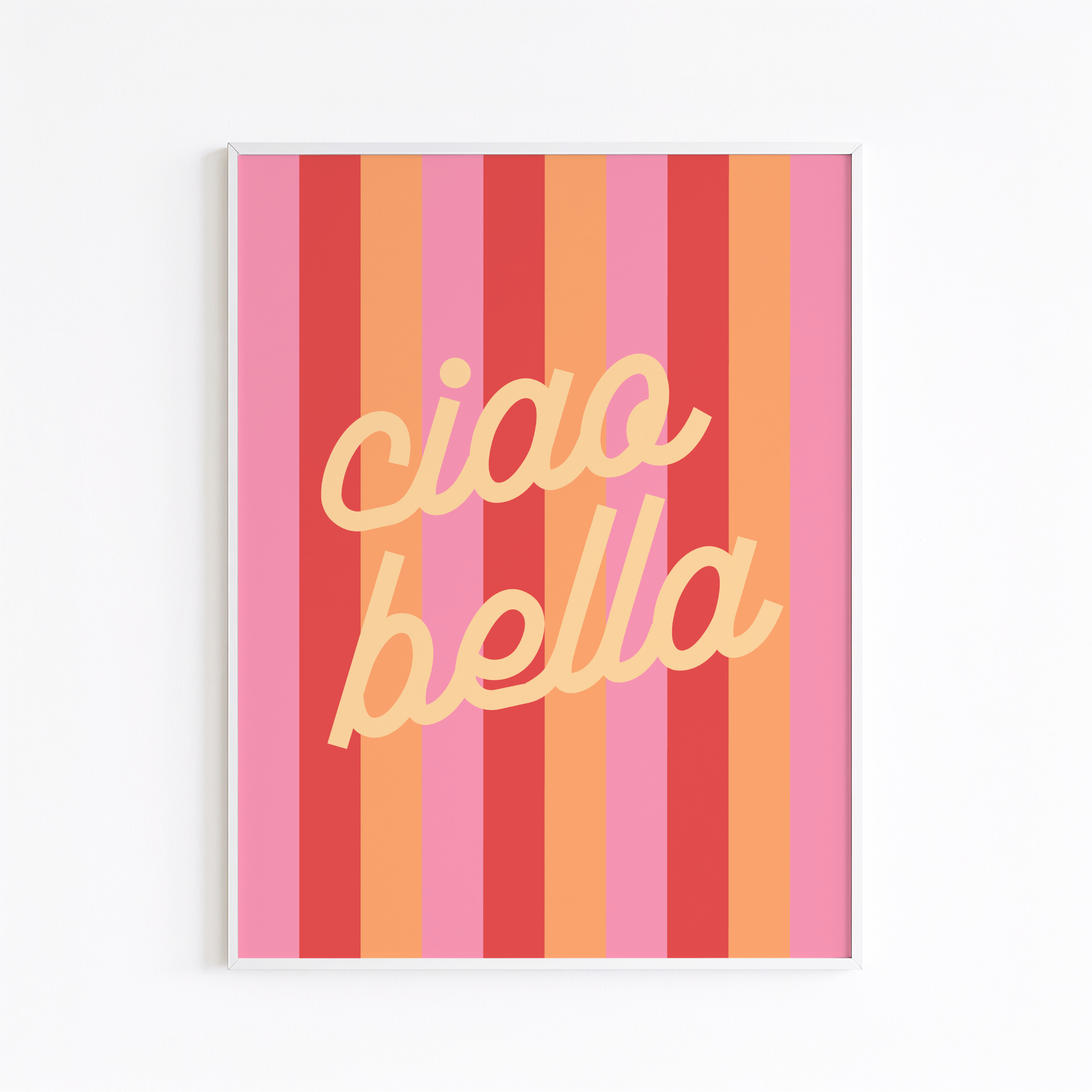 Add a touch of Italian charm and playful retro vibes to your space with this Ciao Bella poster print. Featuring bold pink, peach, and red stripes with buttery yellow lettering, this poster brings instant warmth, joy, and personality to any room.
