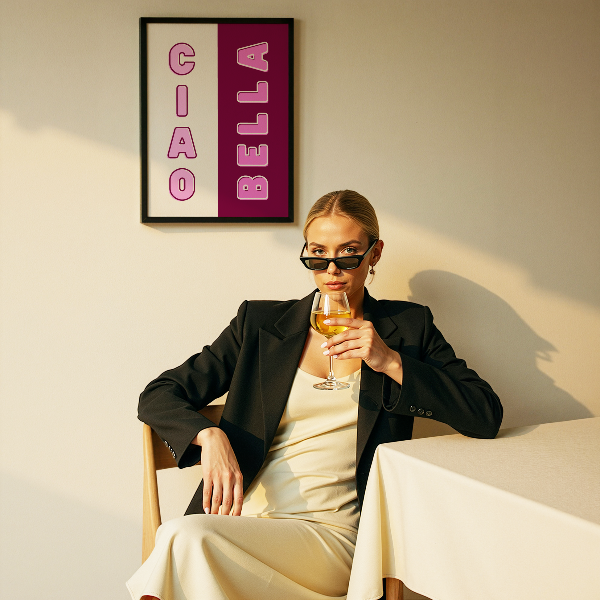 This bold and stylish “Ciao Bella” poster print makes a vibrant visual statement with its striking combination of white, merlot, and pink tones. Featuring the iconic Italian phrase "Ciao Bella," this piece brings a charming and playful energy to any room.