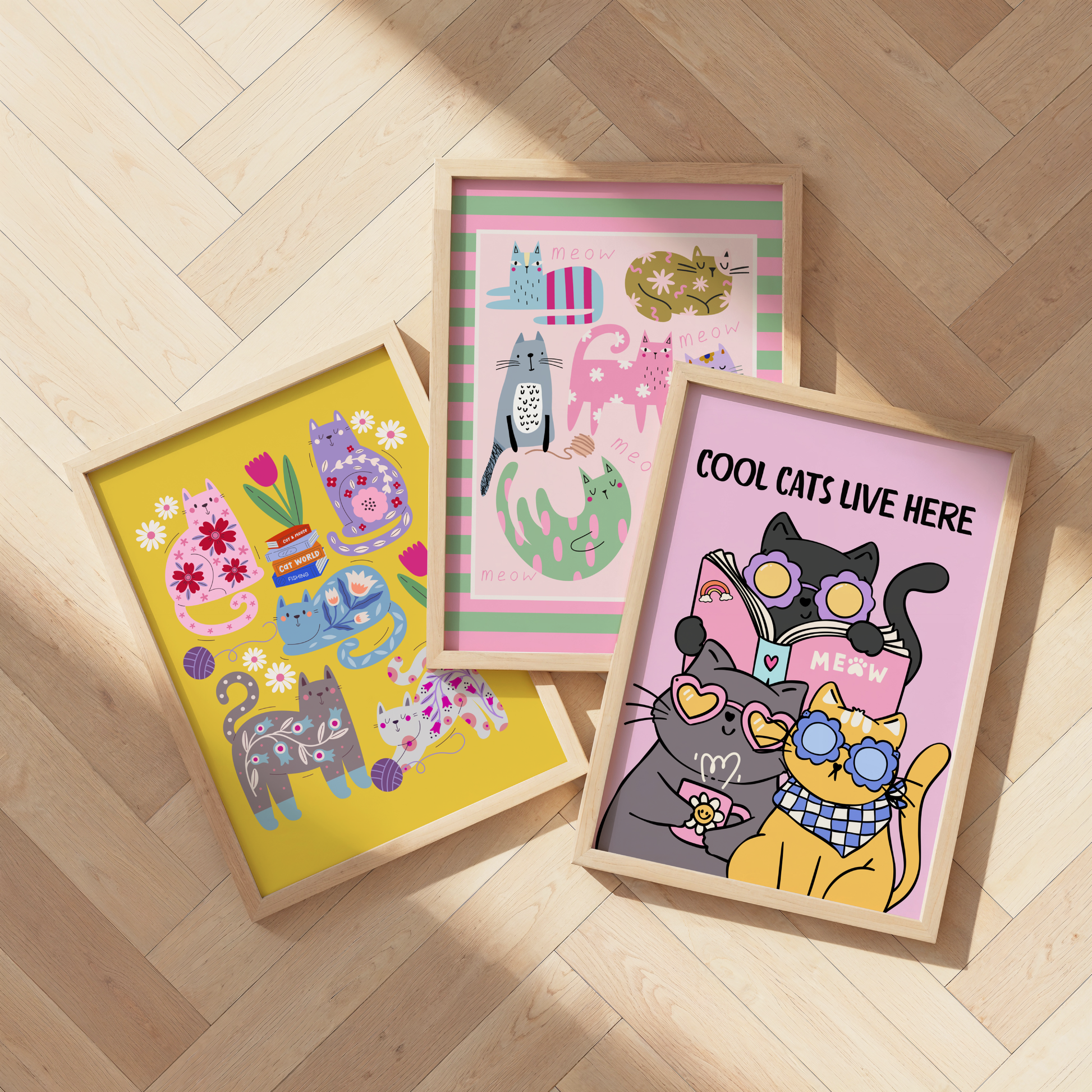 Bring pure cuteness and personality into your little one’s space with this “Cool Cats Live Here” poster print. Featuring three adorable cats in quirky sunglasses, pastel tones and playful accessories, this artwork is perfect for cat lovers and kids alike.