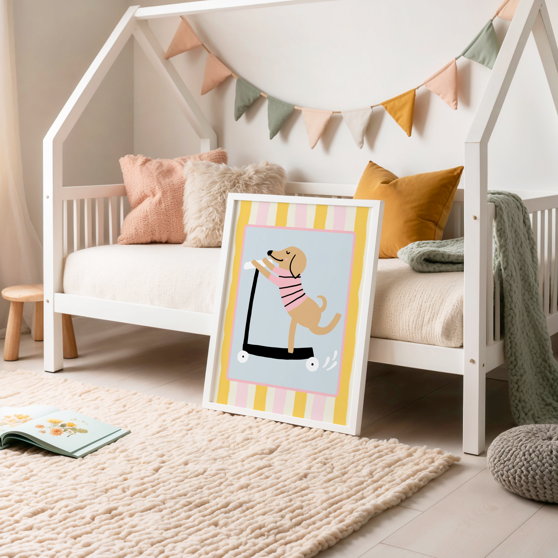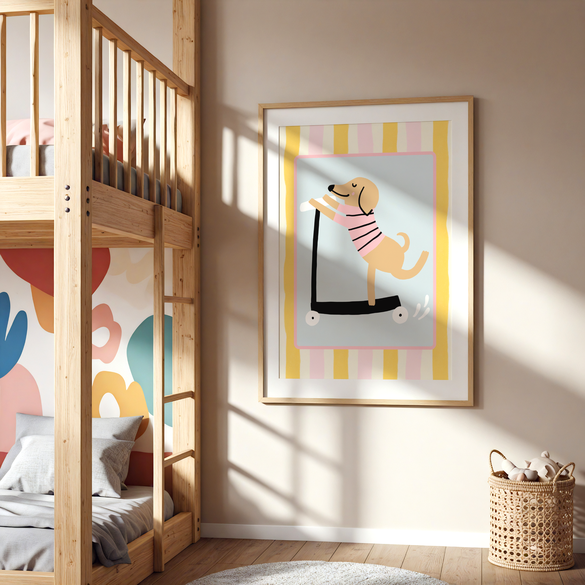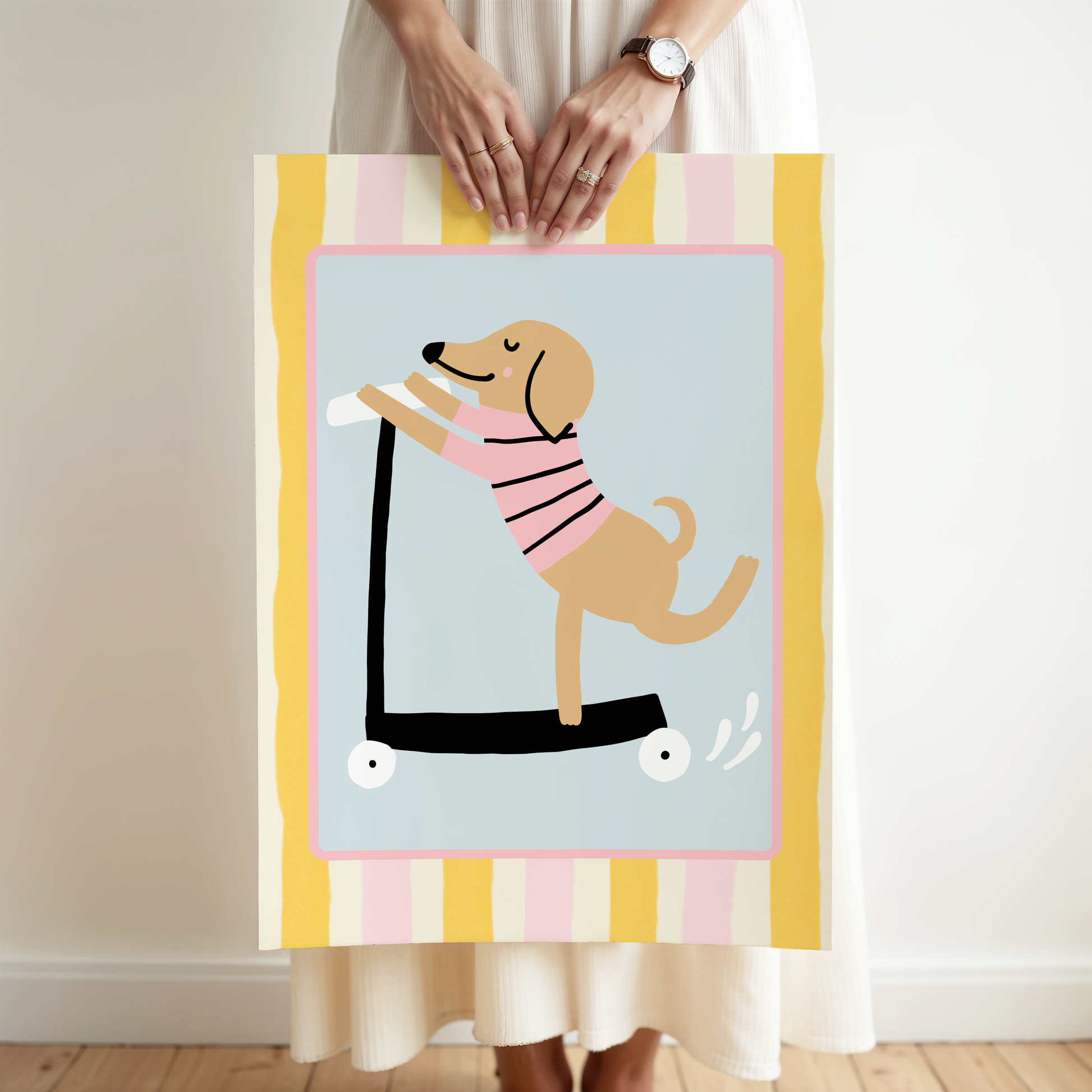Bring joy, energy, and a whole lot of personality to your little one's space with this “Dachshund on a Scooter” poster print. This adorable digital illustration features a cheerful dachshund in a striped pink shirt, confidently riding a scooter — a playful, modern design perfect for dog lovers and little adventurers alike.