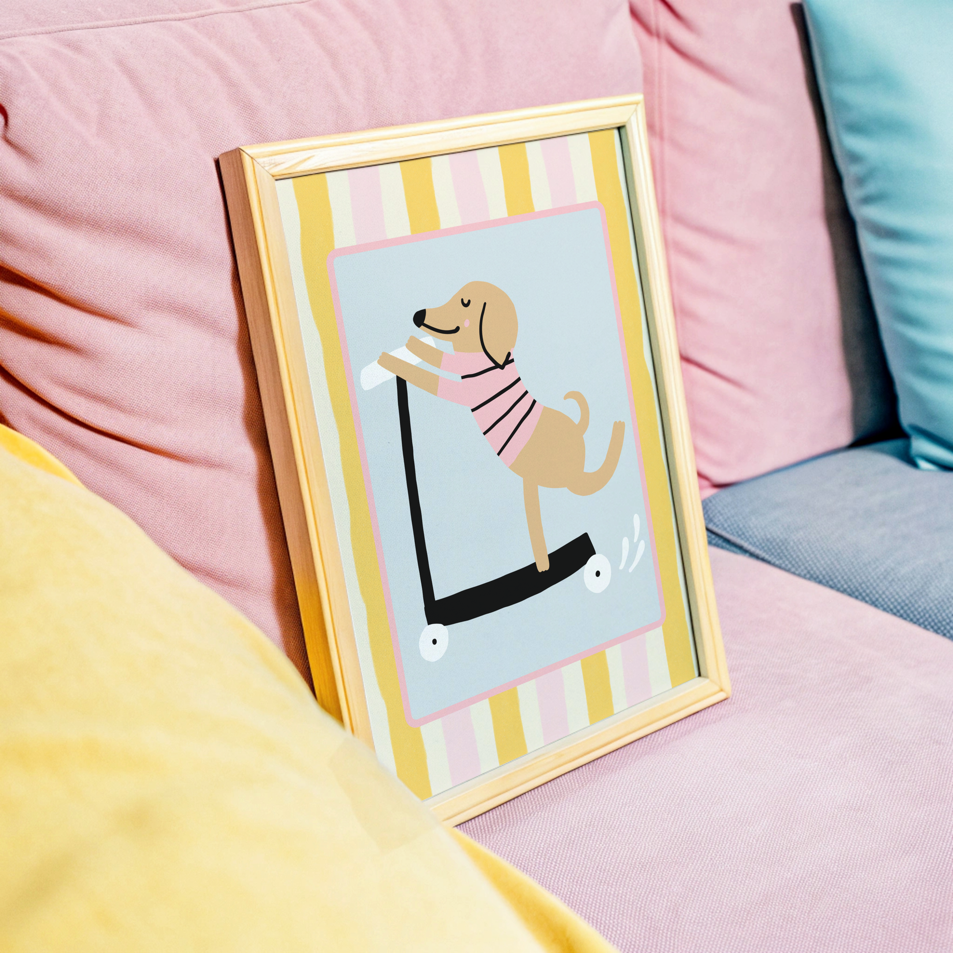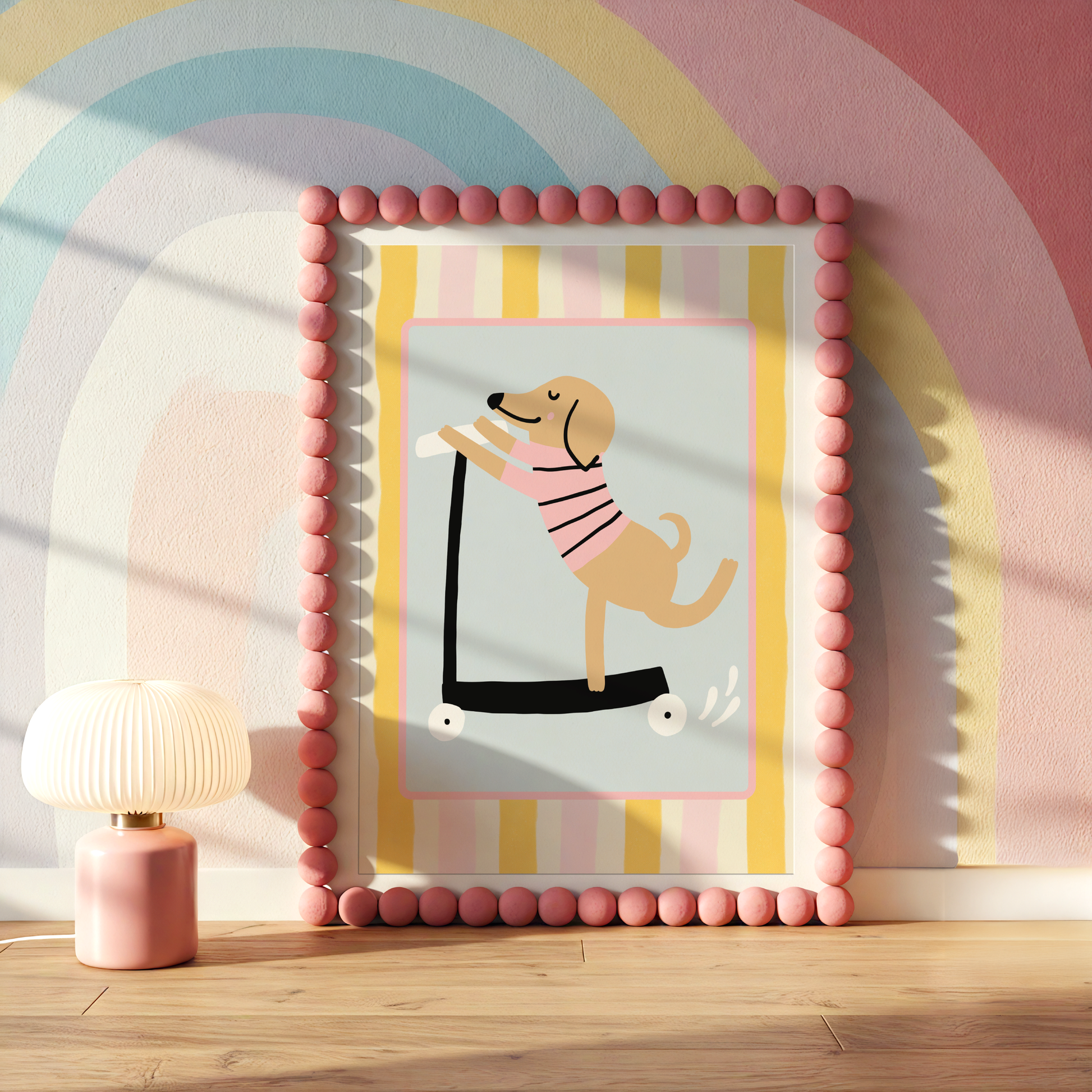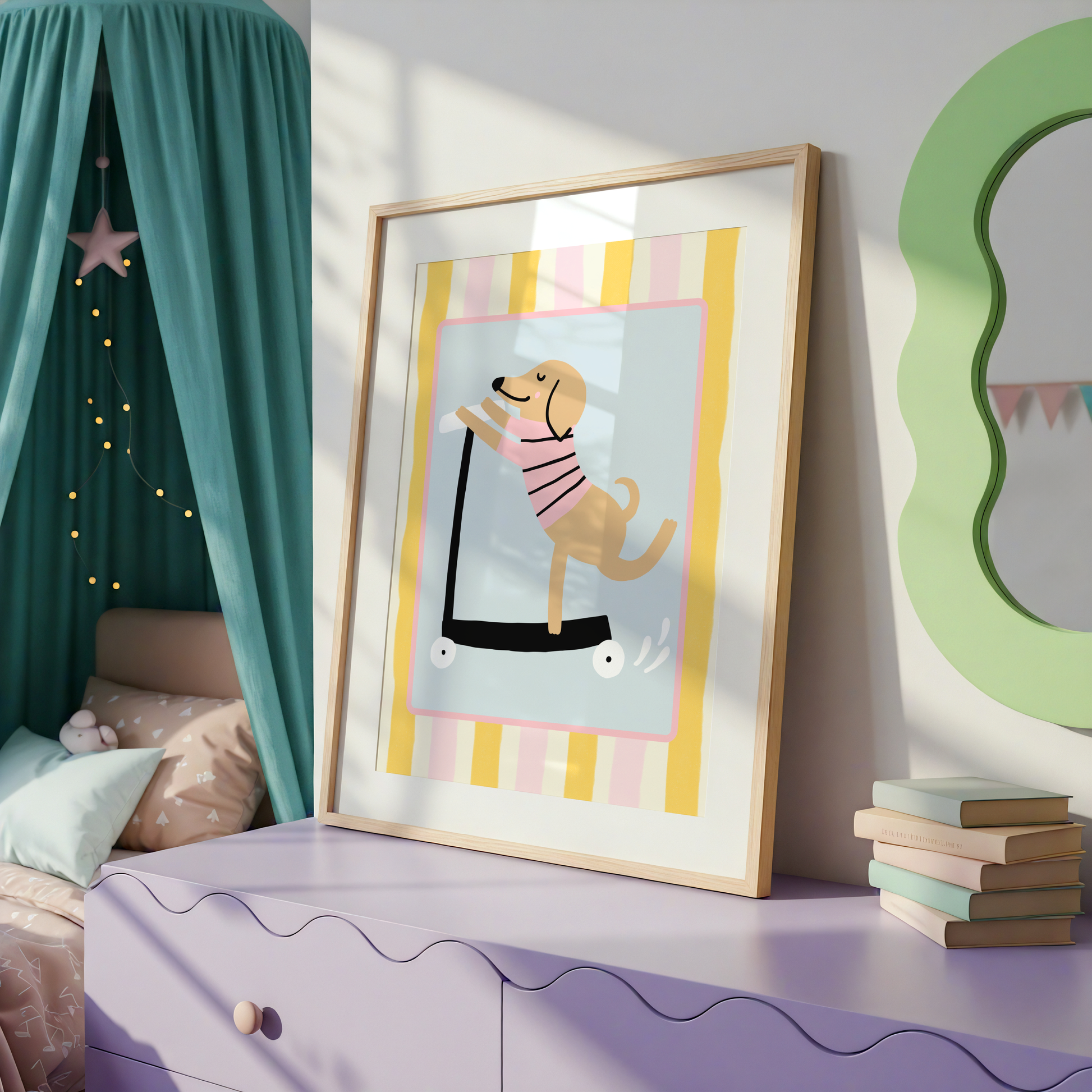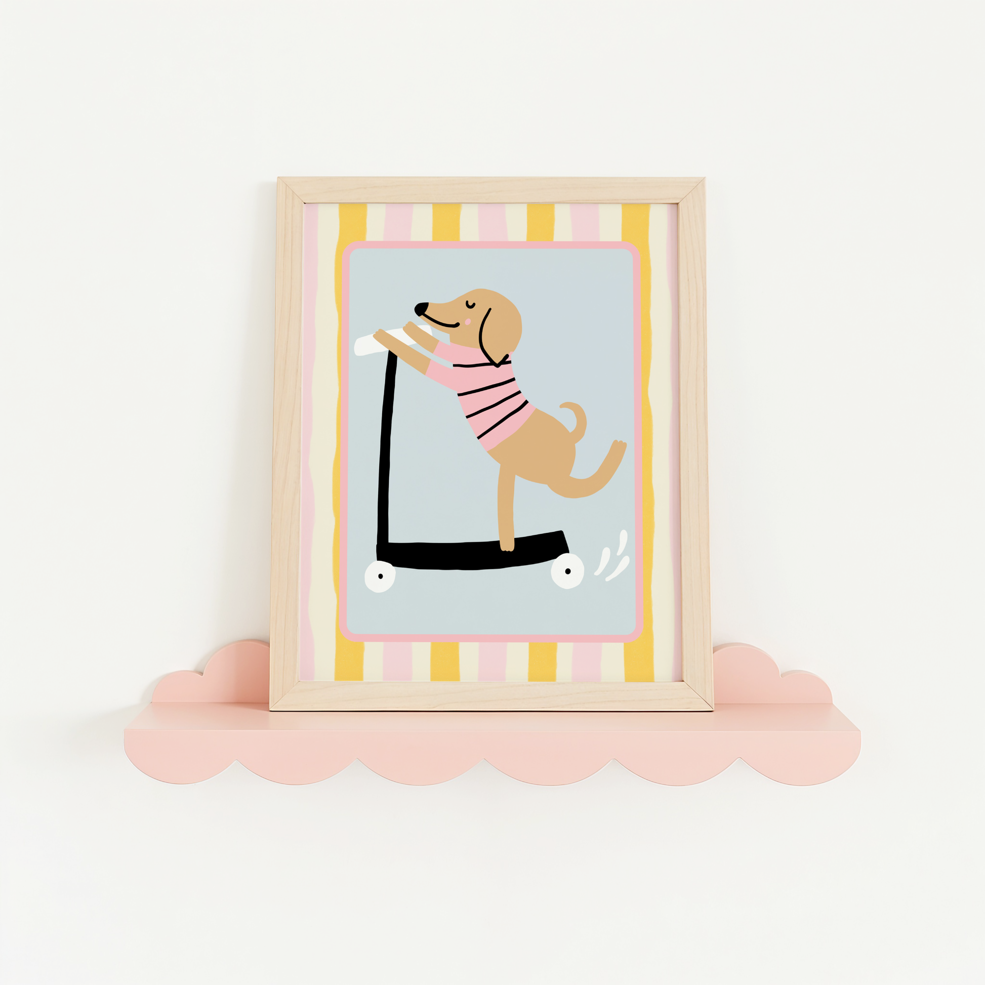 Bring joy, energy, and a whole lot of personality to your little one's space with this “Dachshund on a Scooter” poster print. This adorable digital illustration features a cheerful dachshund in a striped pink shirt, confidently riding a scooter — a playful, modern design perfect for dog lovers and little adventurers alike.