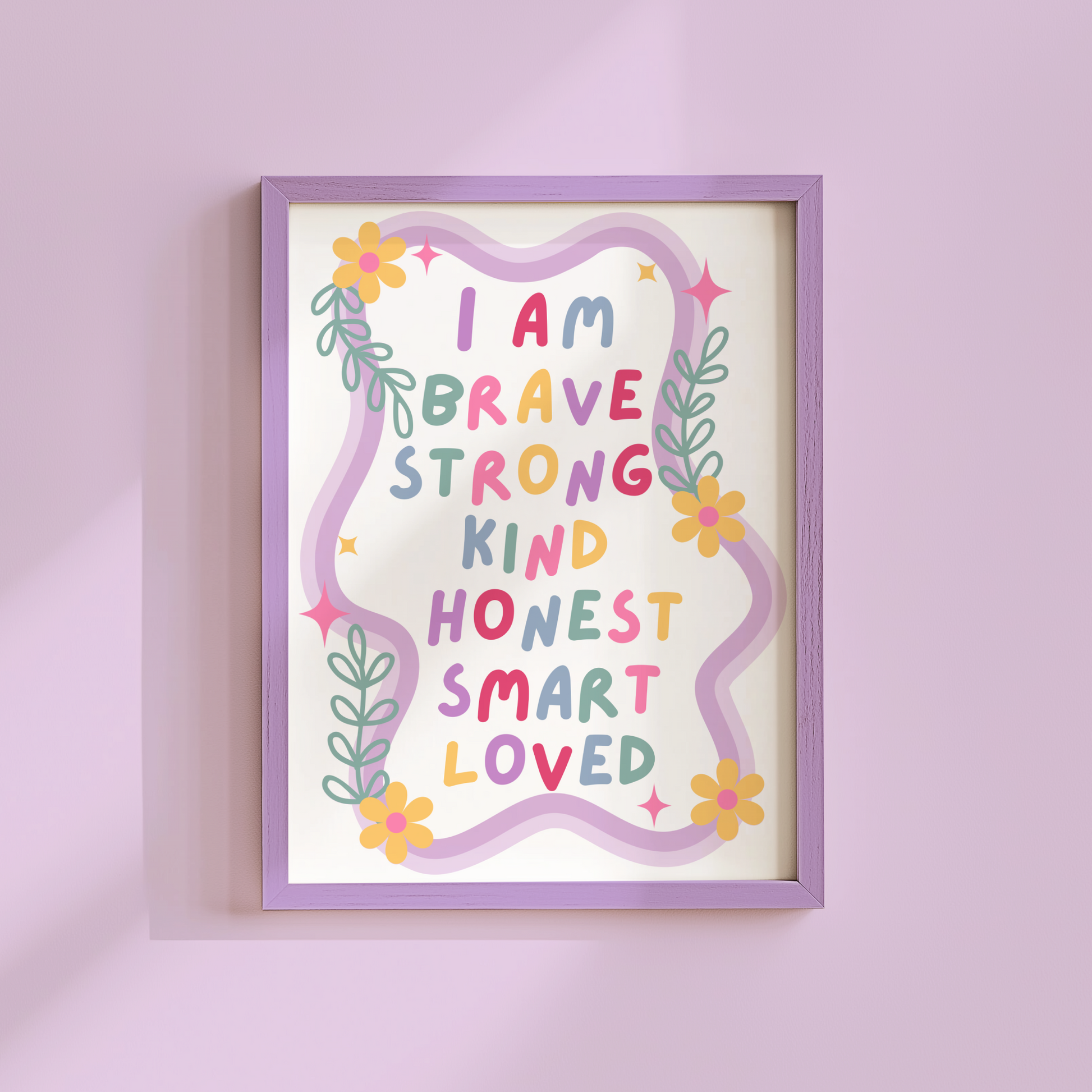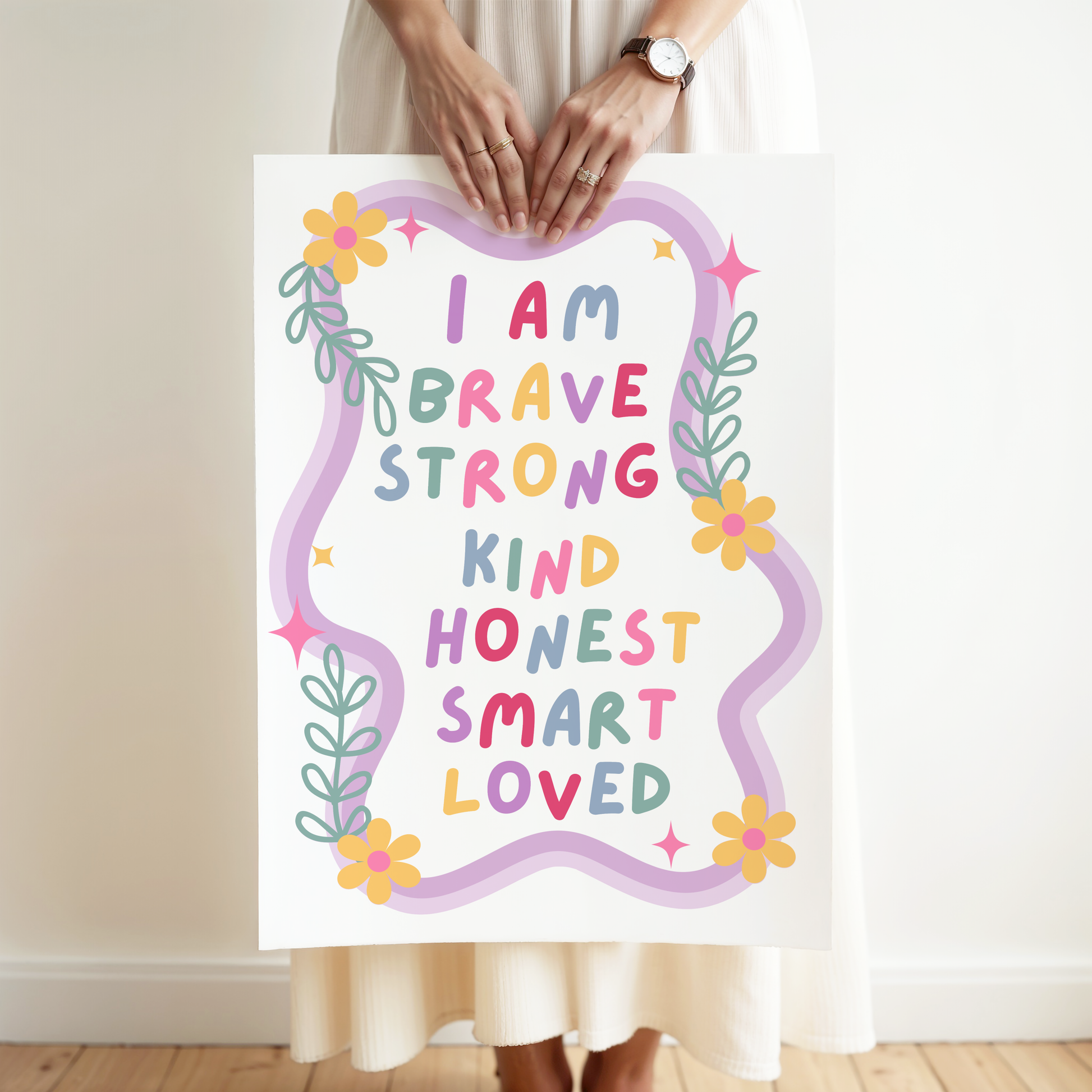 Introducing a colourful and sweet poster print that features essential daily affirmations. This decorative item is an excellent option for educators, parents, or anyone who wants to infuse self-love and positivity into their daily lives. Perfect for a nursery, child's bedroom, classroom or play space.