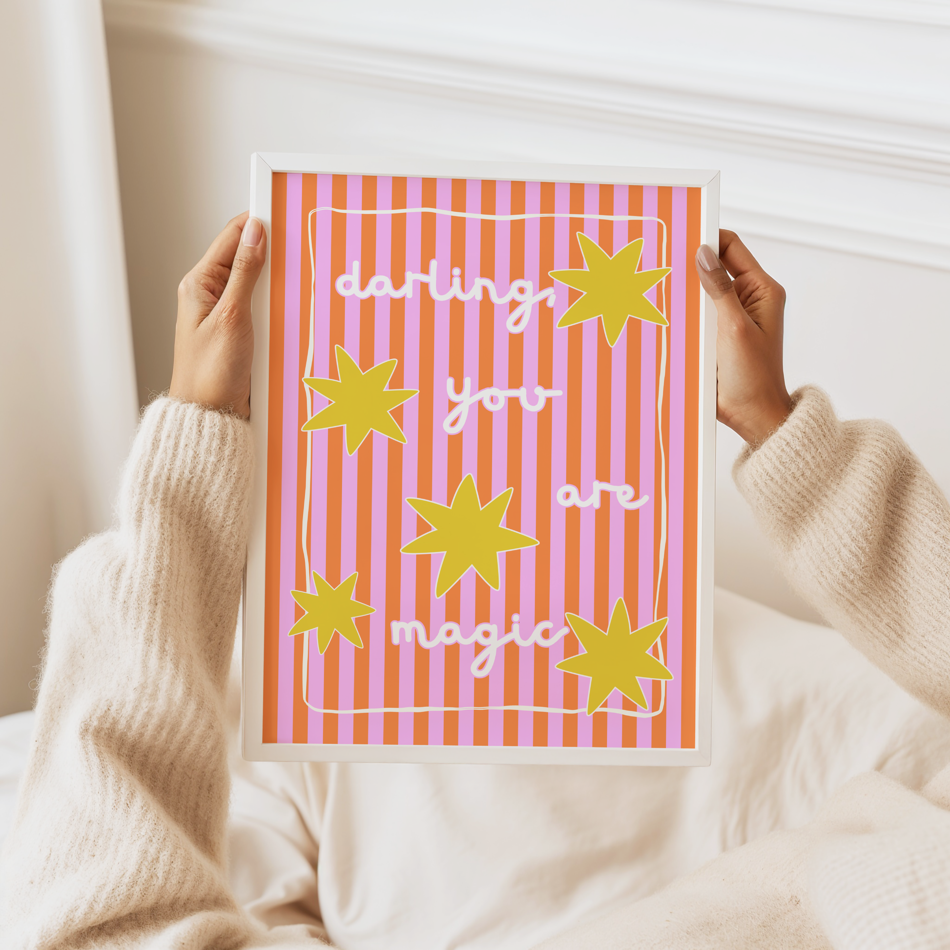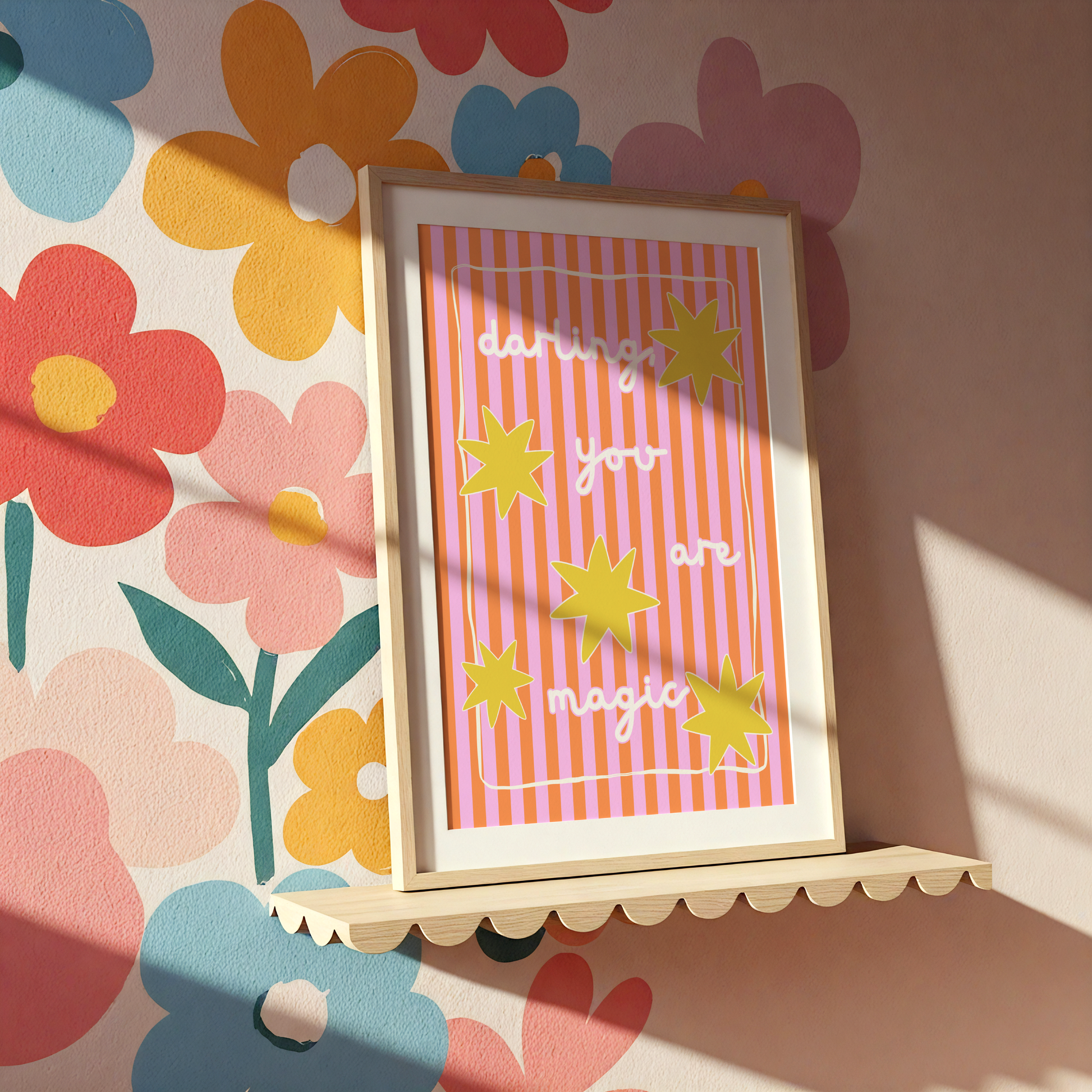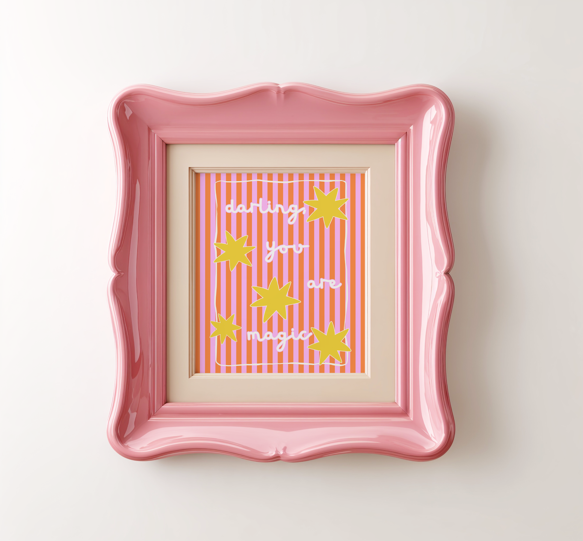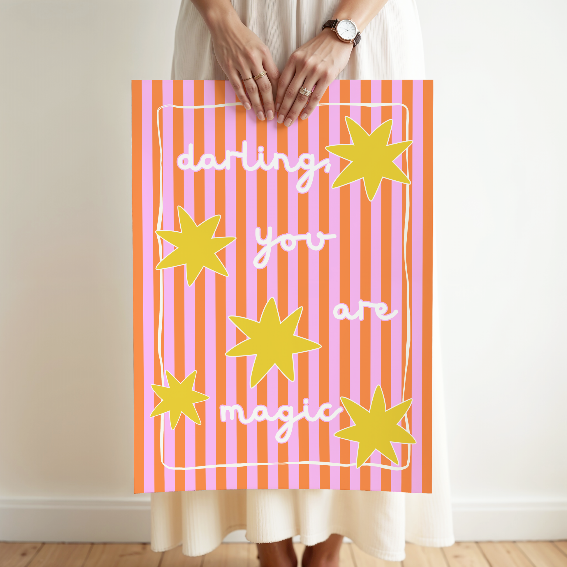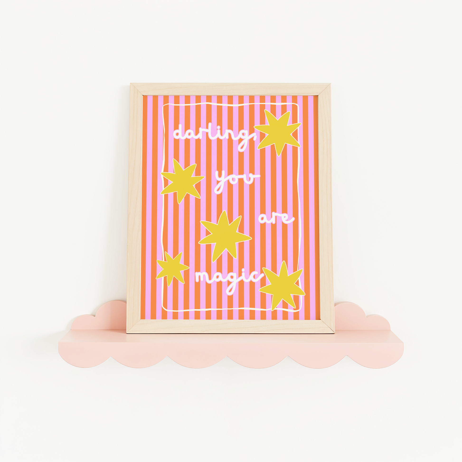 Add a sprinkle of magic to your space with this sweet and uplifting “Darling, You Are Magic” poster print. Designed with a vibrant palette of pink, orange and yellow, and charming hand-lettered typography, this artwork is the perfect way to inspire positivity and joy in any room.