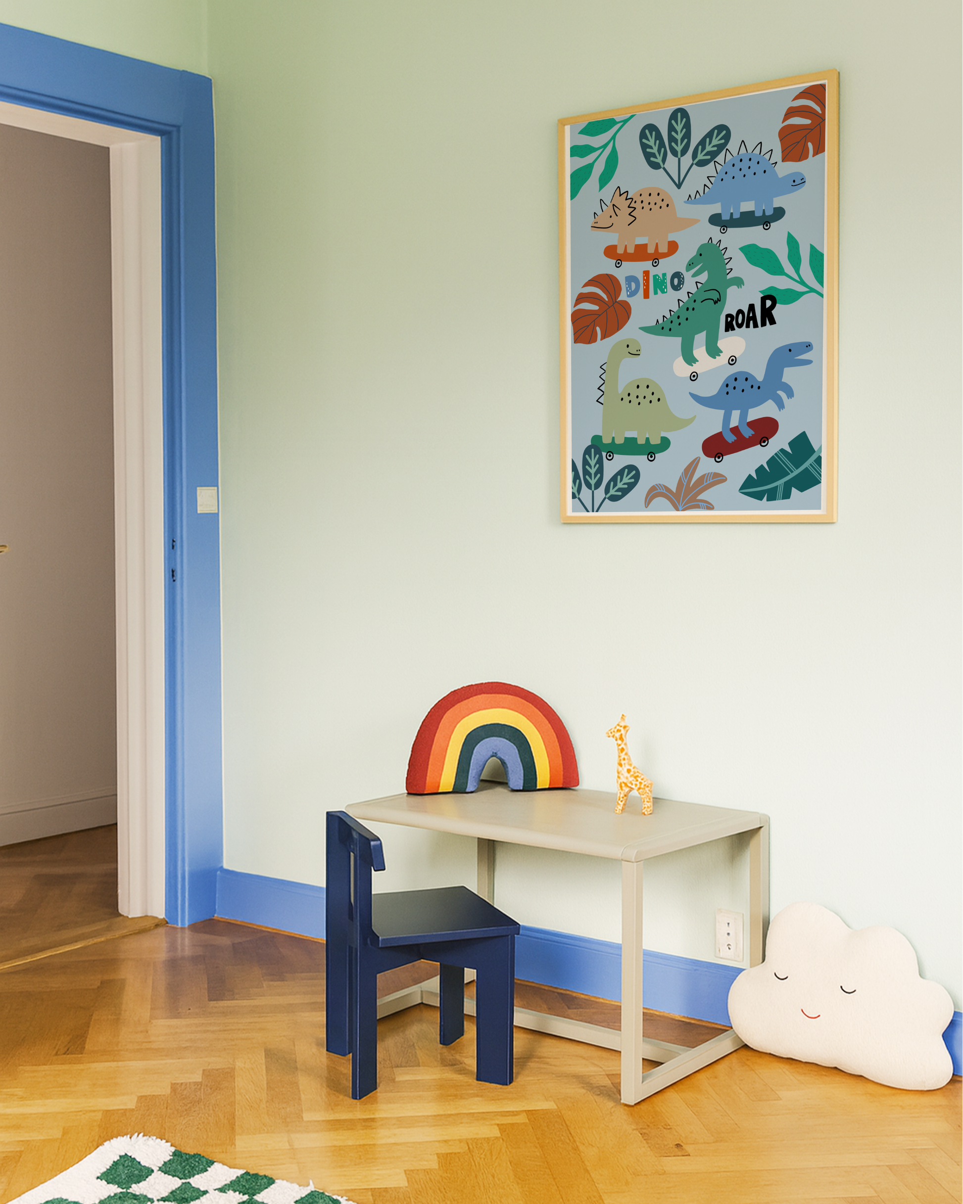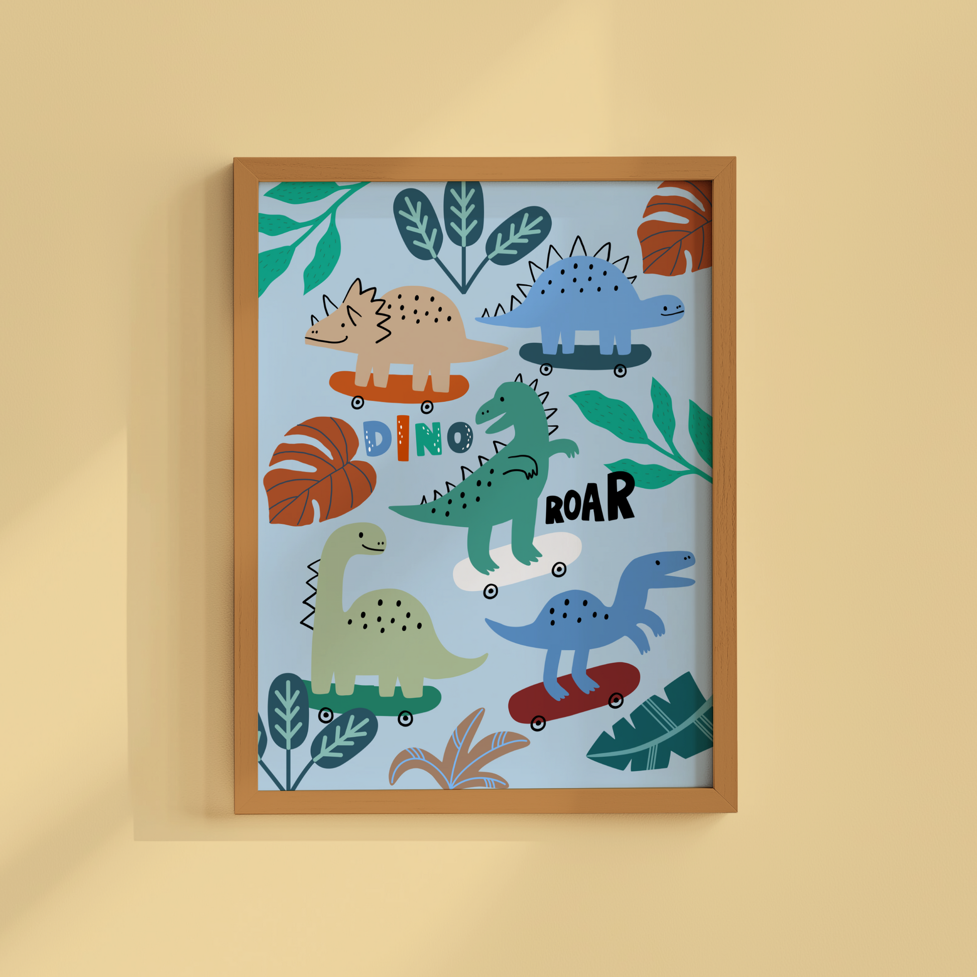 Bring a burst of fun and adventure into your child’s space with this vibrant “Dinosaurs on Skateboards” poster print— a playful design featuring adorable dinosaurs on skateboards surrounded by jungle leaves. Perfect for boys bedrooms, playrooms, or nurseries, this cheerful print adds personality, colour, and imagination to any wall!