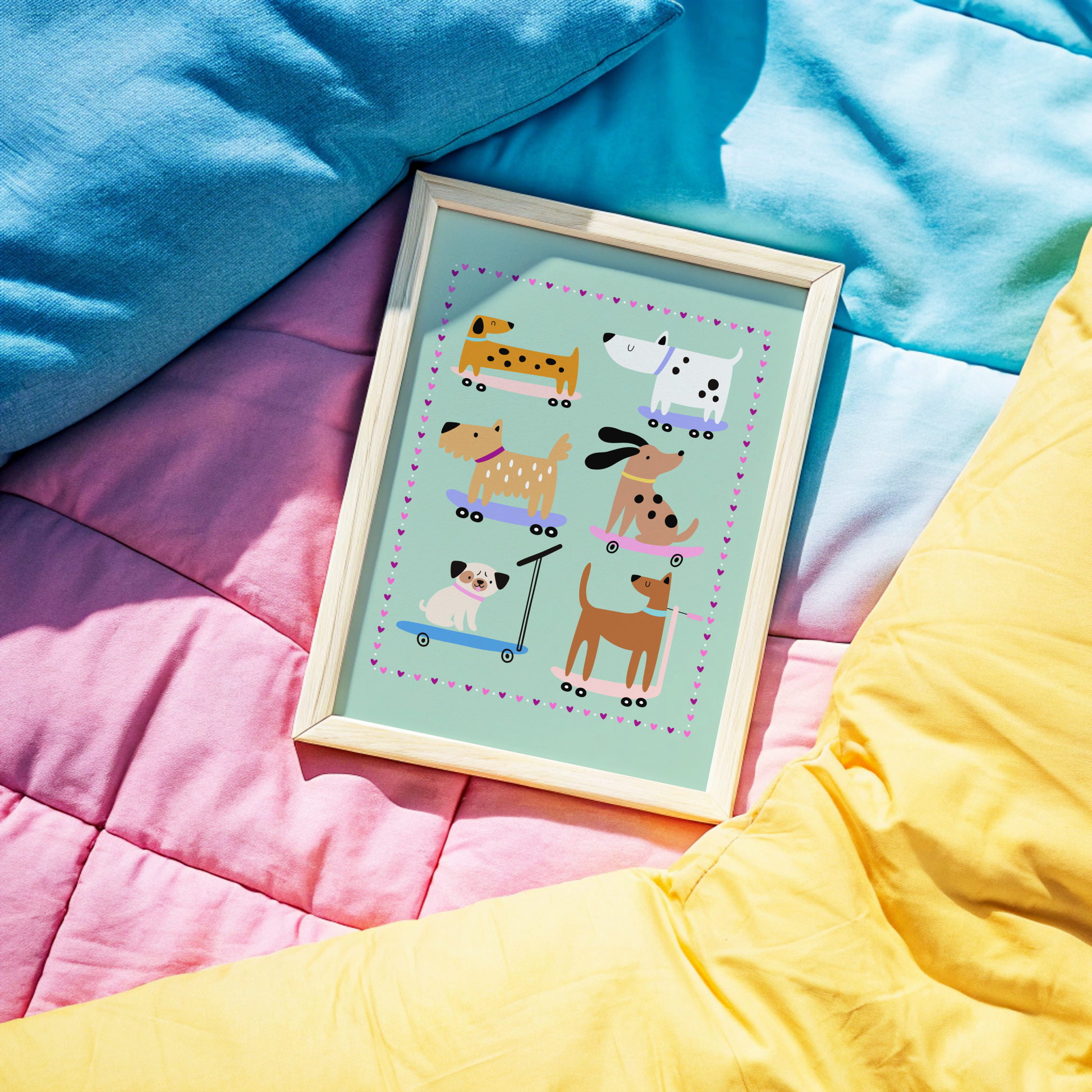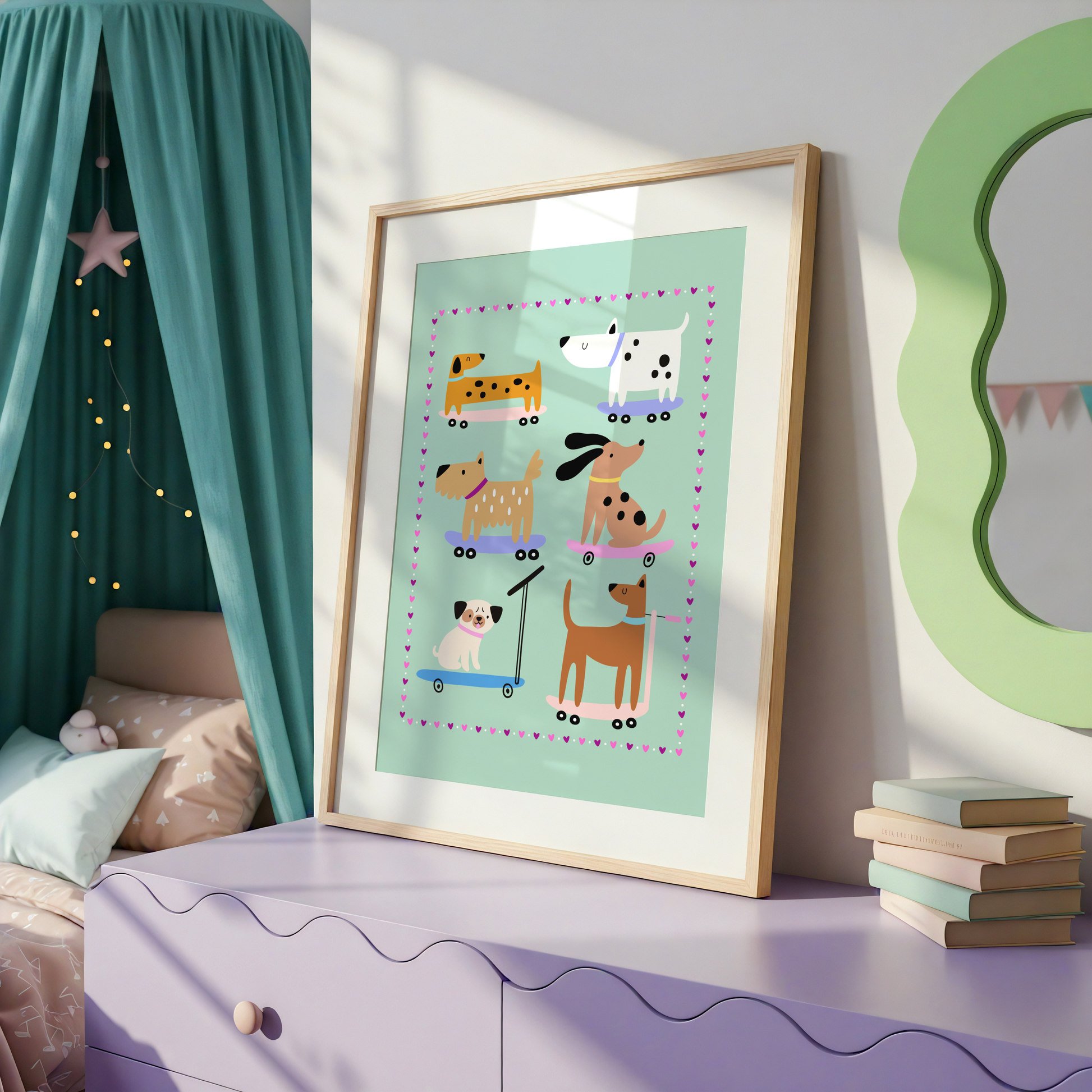 Bring a burst of fun and personality to your little one’s room with this 'Dogs on wheels' poster print. 🛹🐾.Featuring a pack of adorable dogs riding skateboards and scooters, this cheerful design captures the playful energy of childhood. Set against a soft mint-green background with a cute heart border, this artwork adds instant joy and colour to any nursery, playroom, or kids’ bedroom.