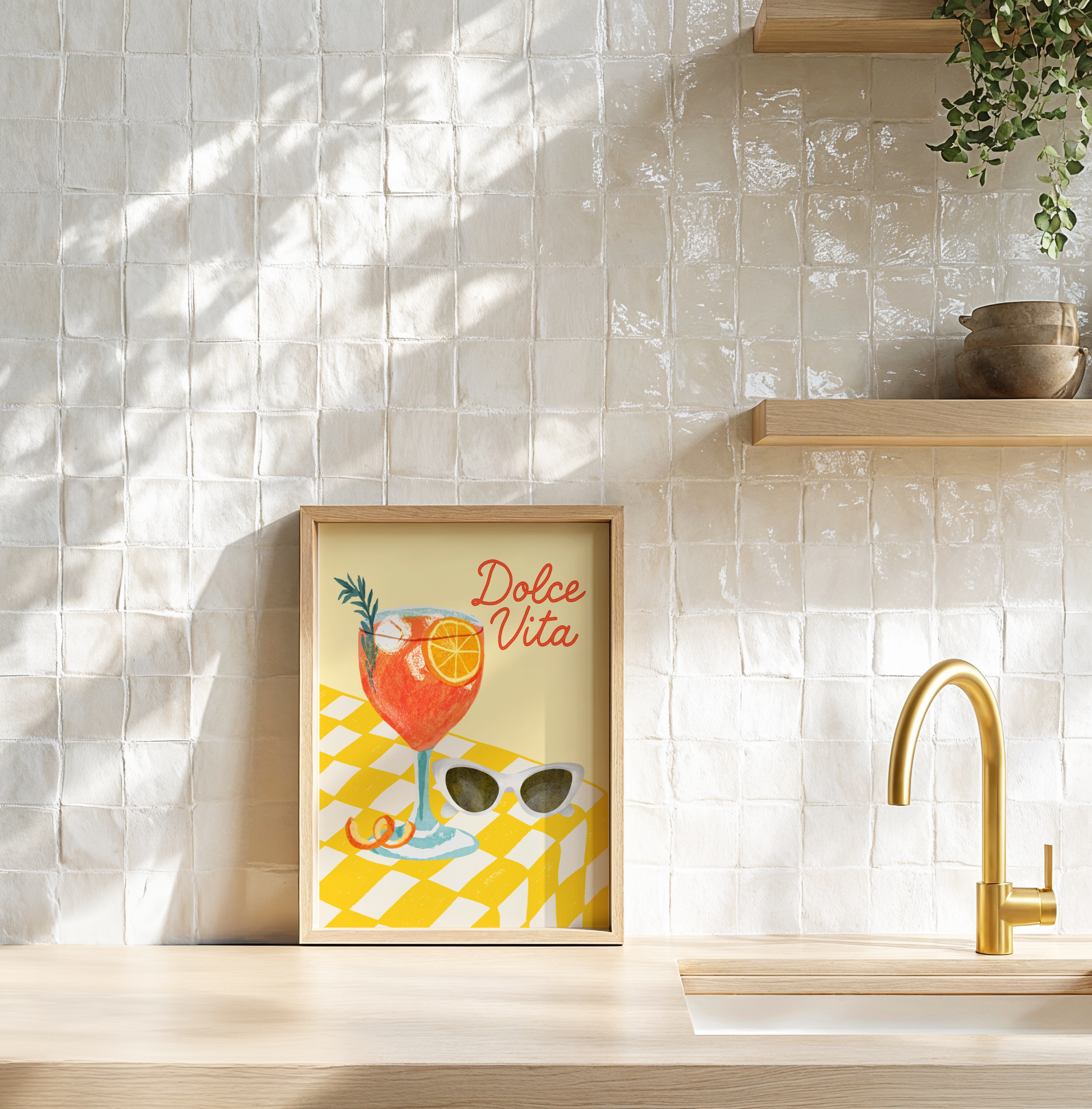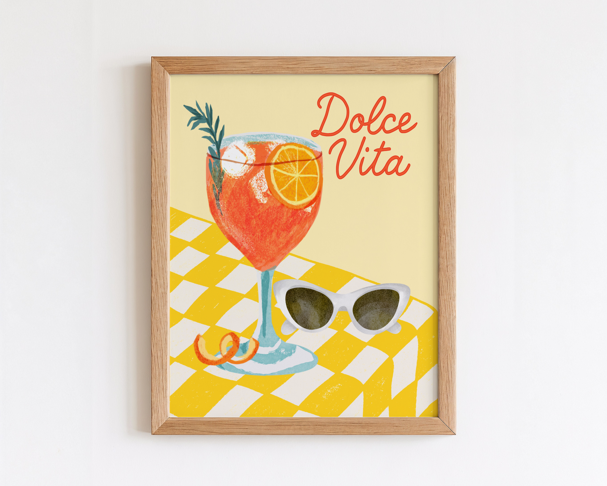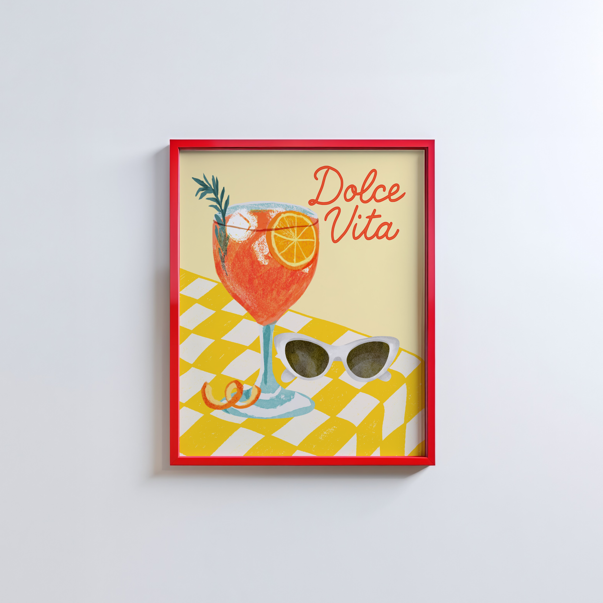 Add a burst of La Dolce Vita to your kitchen, dining space, or bar cart with this vibrant and stylish poster print. The design features a refreshing illustrated Aperol Spritz cocktail sitting on a yellow checkered table, paired with a chic set of sunglasses — all set against a buttery yellow background that radiates Italian summer vibes.