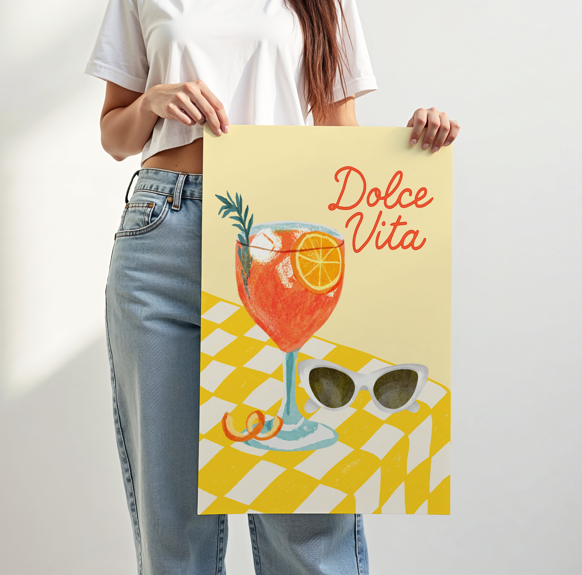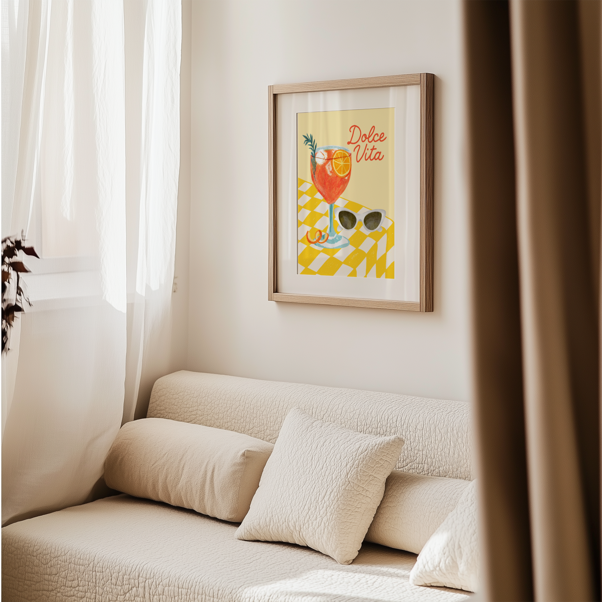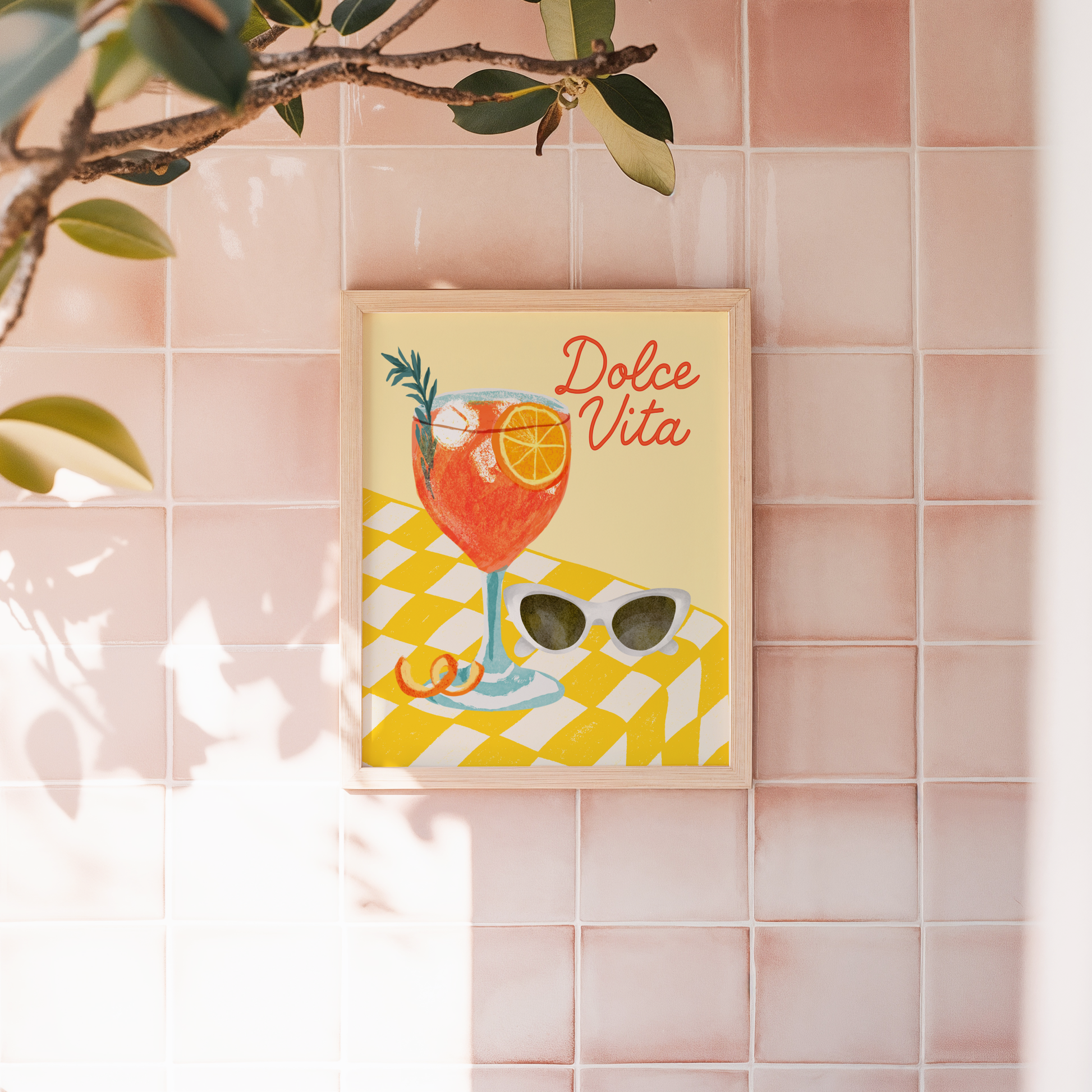 Add a burst of La Dolce Vita to your kitchen, dining space, or bar cart with this vibrant and stylish poster print. The design features a refreshing illustrated Aperol Spritz cocktail sitting on a yellow checkered table, paired with a chic set of sunglasses — all set against a buttery yellow background that radiates Italian summer vibes.