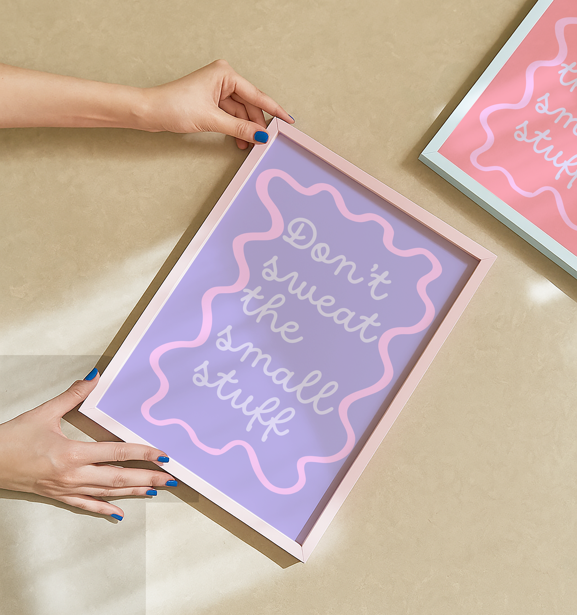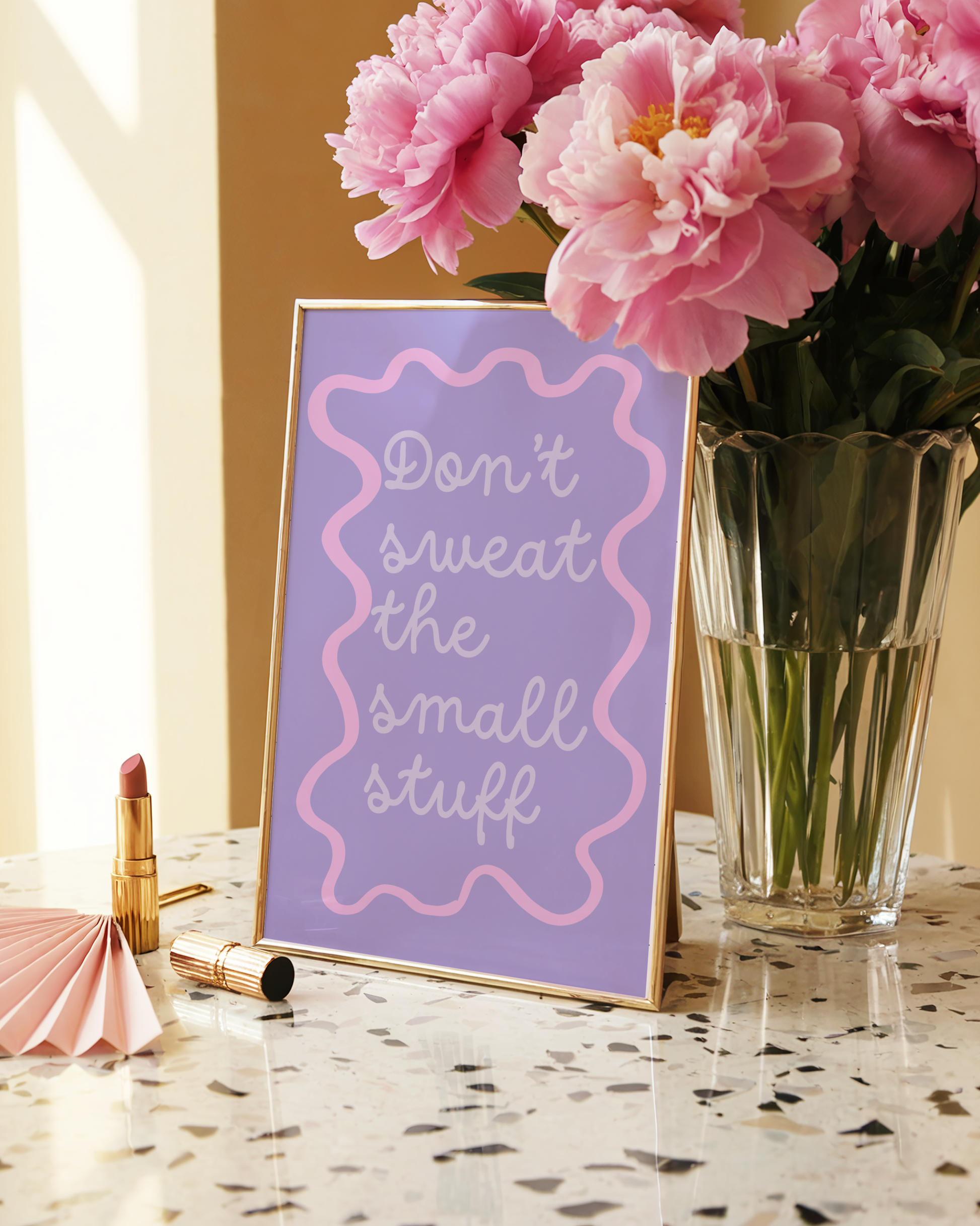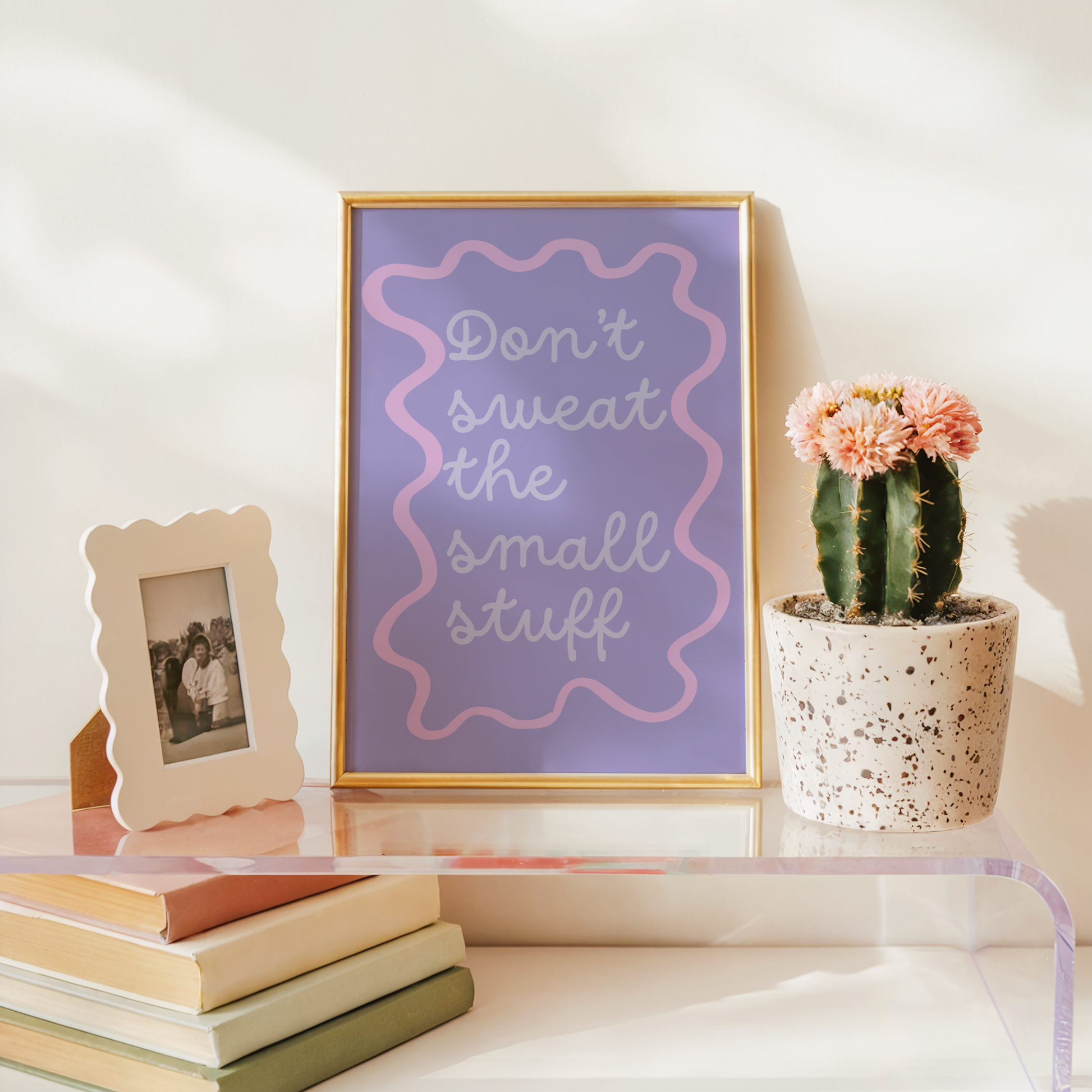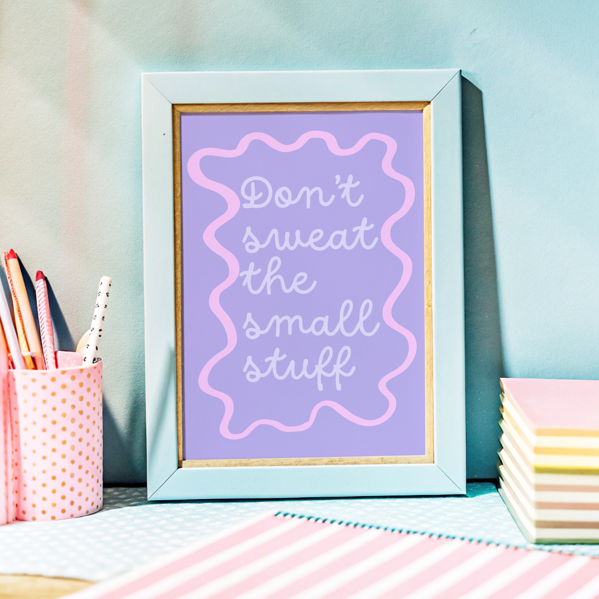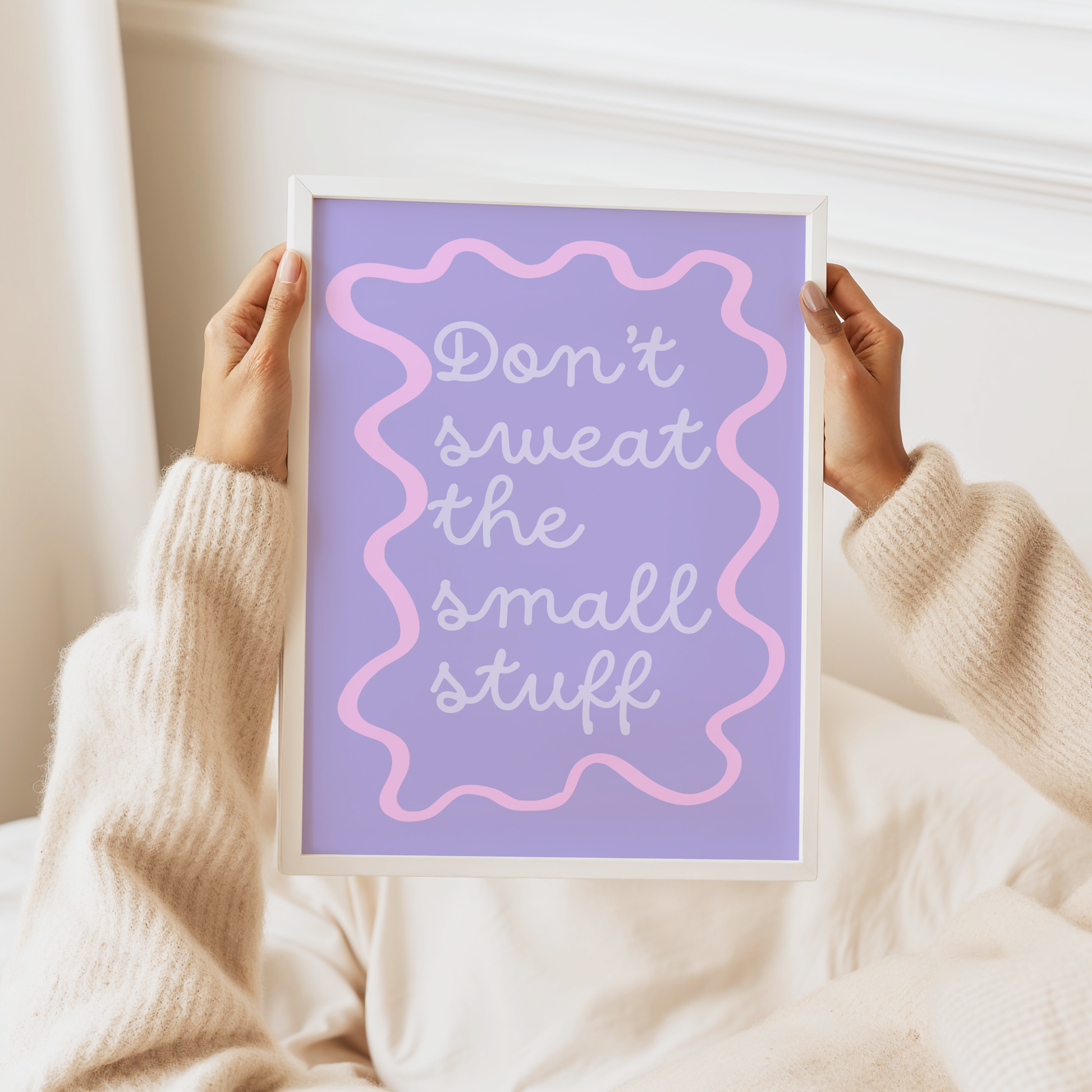 Bring a calming, positive vibe to your walls with this motivational poster print. Designed in soothing pastel lavender and pink with playful retro curves, this artwork is a stylish reminder to focus on what matters most and let go of the little things.
