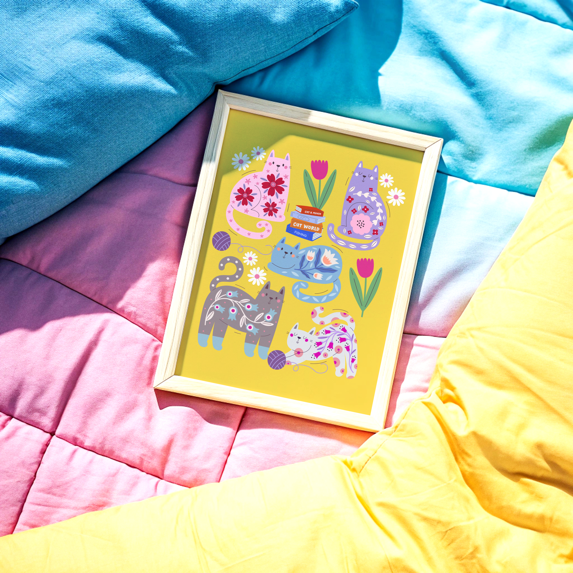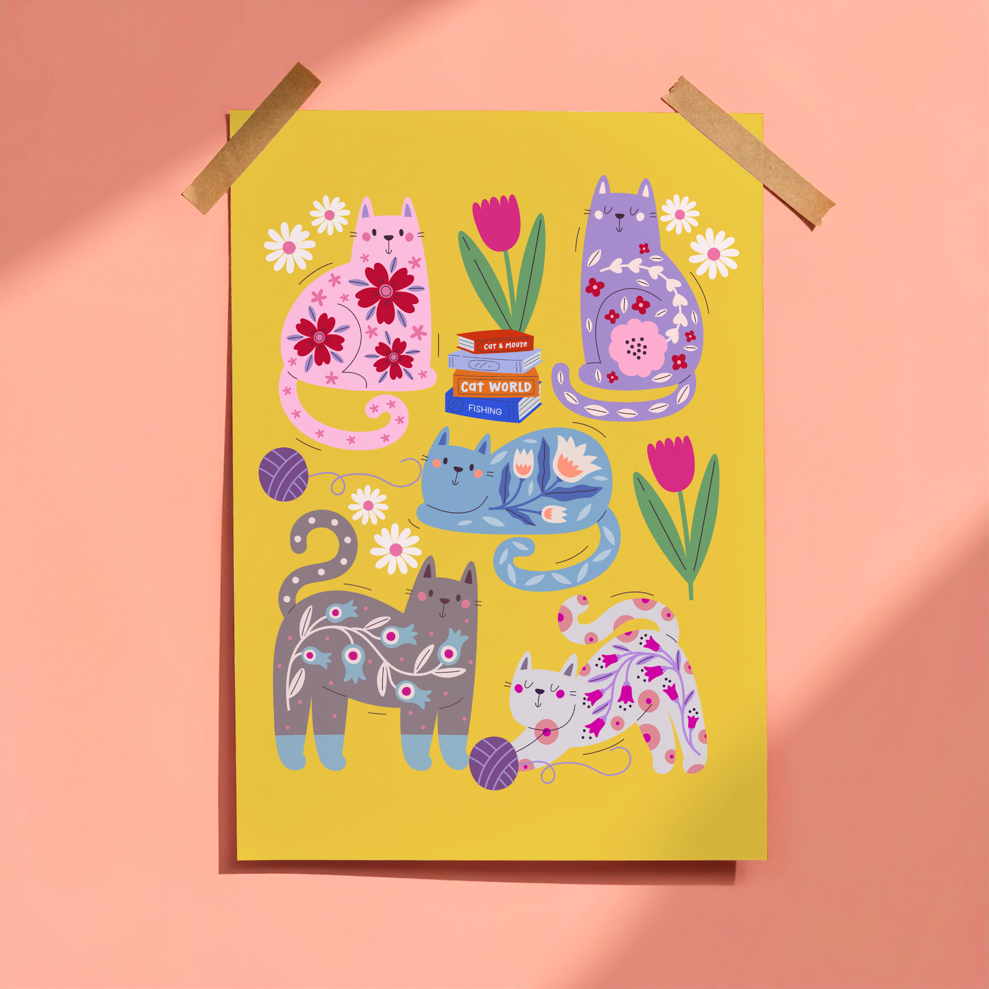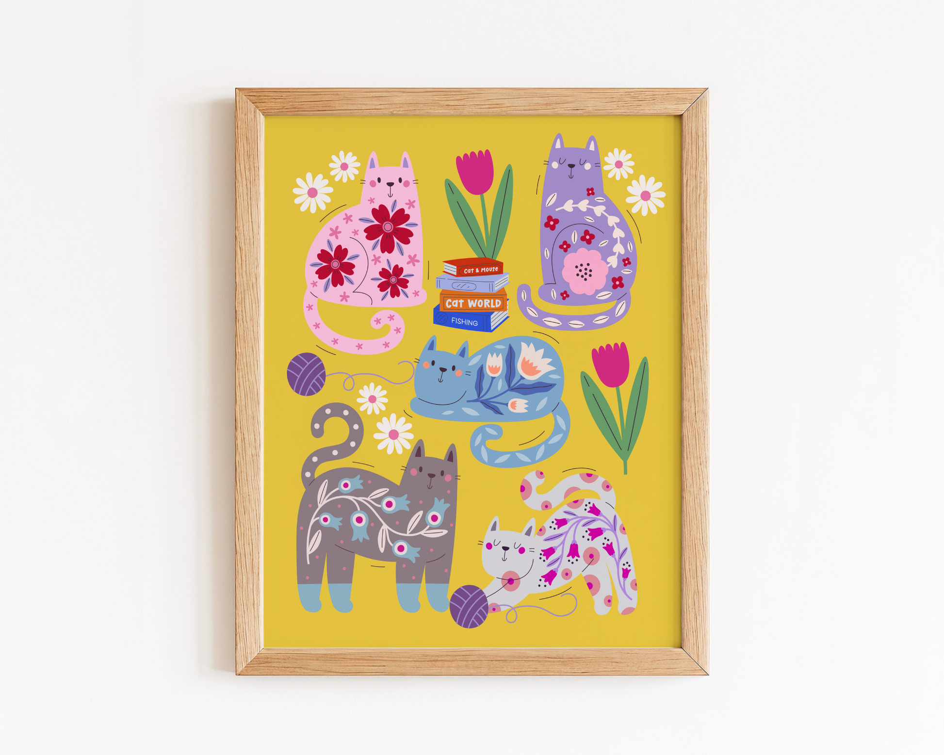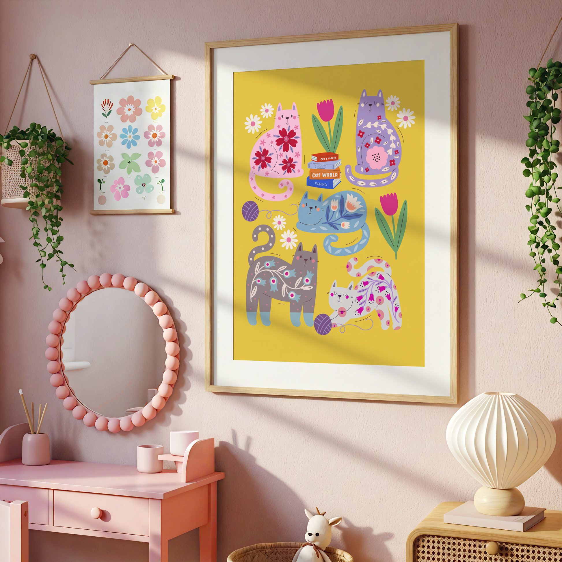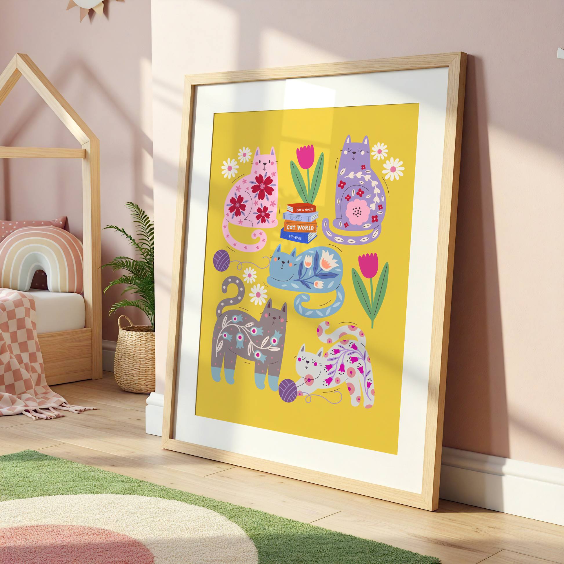 Brighten up your walls with this whimsical floral cat poster print. Featuring a playful collection of cats decorated with flowers, yarn, and books on a vibrant yellow background, this artwork is perfect for adding colour and cuteness to any space.