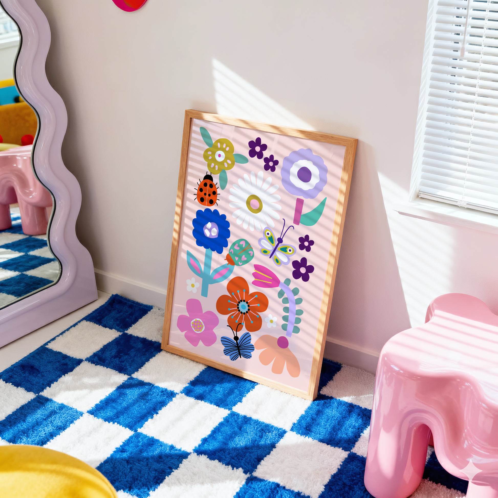 Bring playful colour and modern charm into your little one's space with this colourful floral poster print. Featuring whimsical bold flowers, butterflies and bugs, this artwork is designed to make an instant visual impact.
