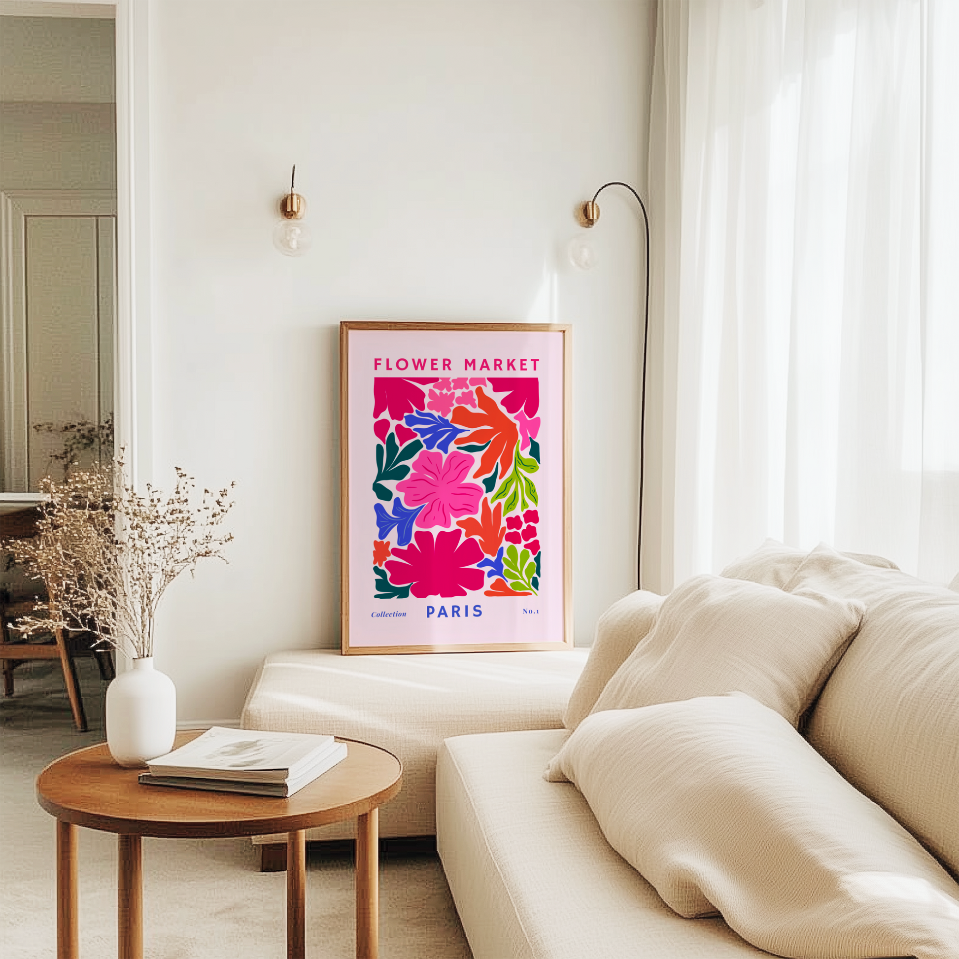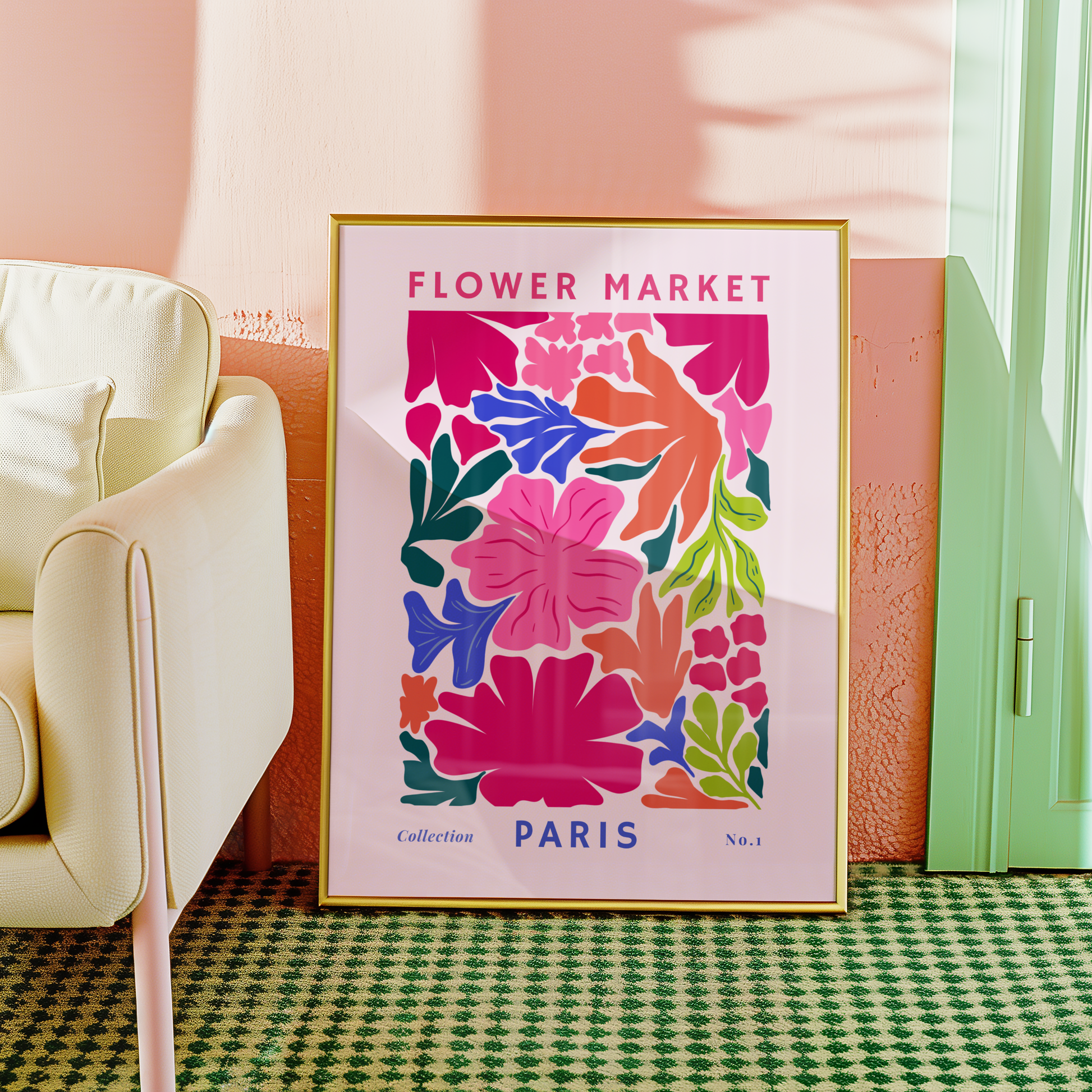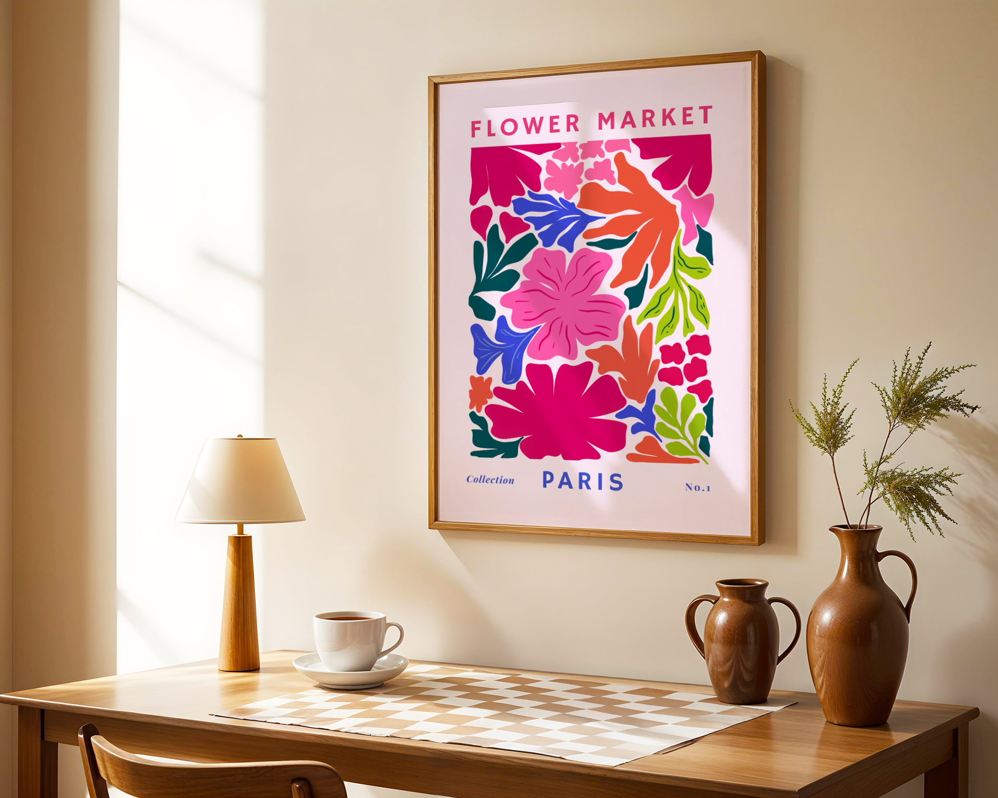 Bring the charm of Parisian flower markets into your home with this vibrant ‘Flower Market Paris’ poster print. The design showcases a colourful arrangement of abstract flowers in shades of pink, blue, orange, and green, creating a bold and modern look.