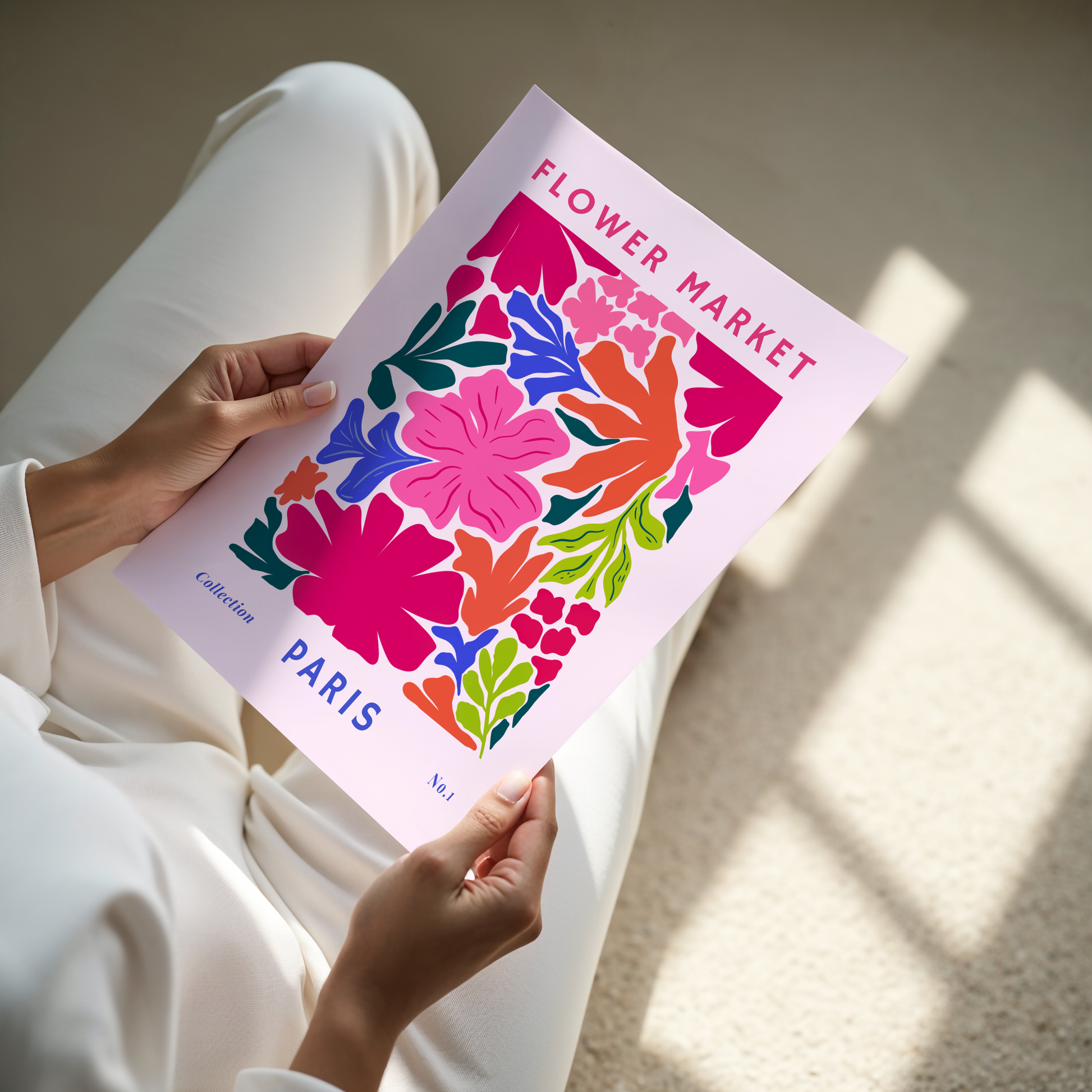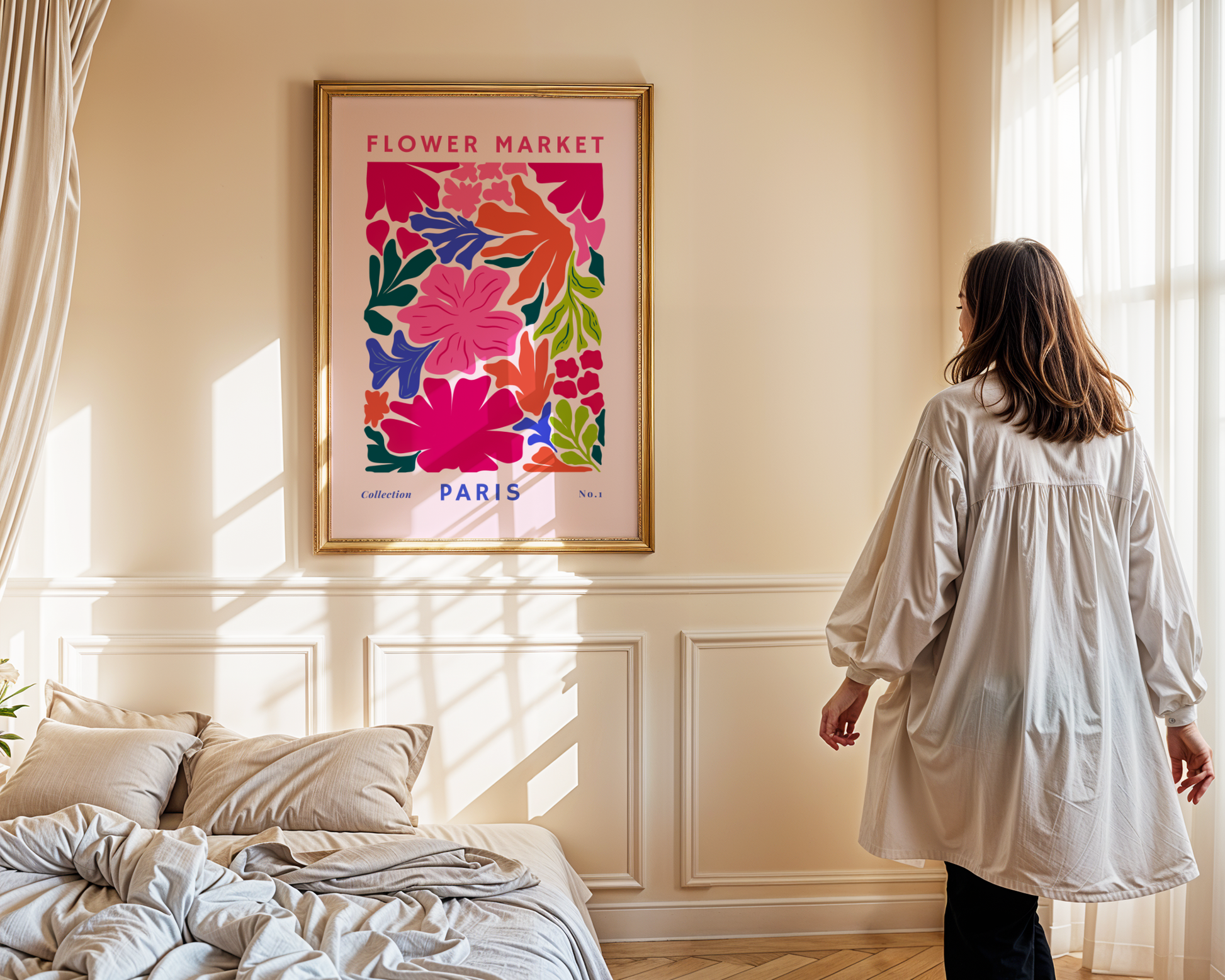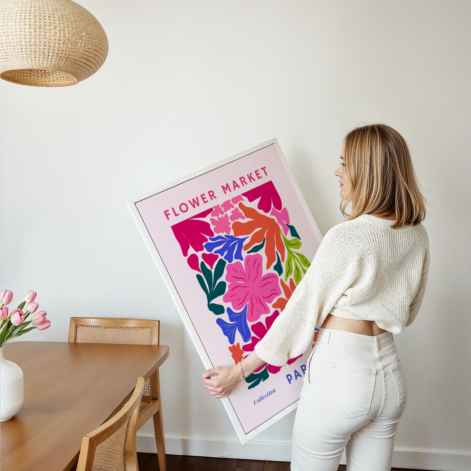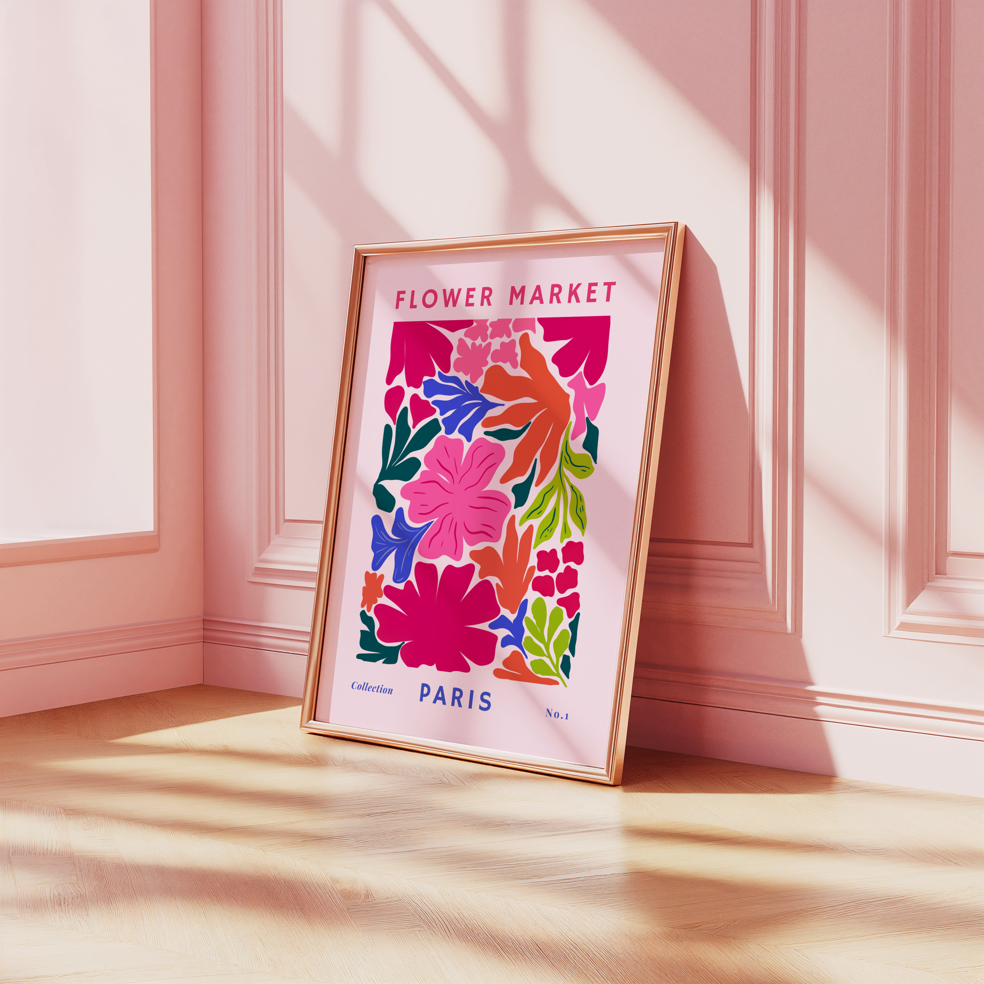 Bring the charm of Parisian flower markets into your home with this vibrant ‘Flower Market Paris’ poster print. The design showcases a colourful arrangement of abstract flowers in shades of pink, blue, orange, and green, creating a bold and modern look.