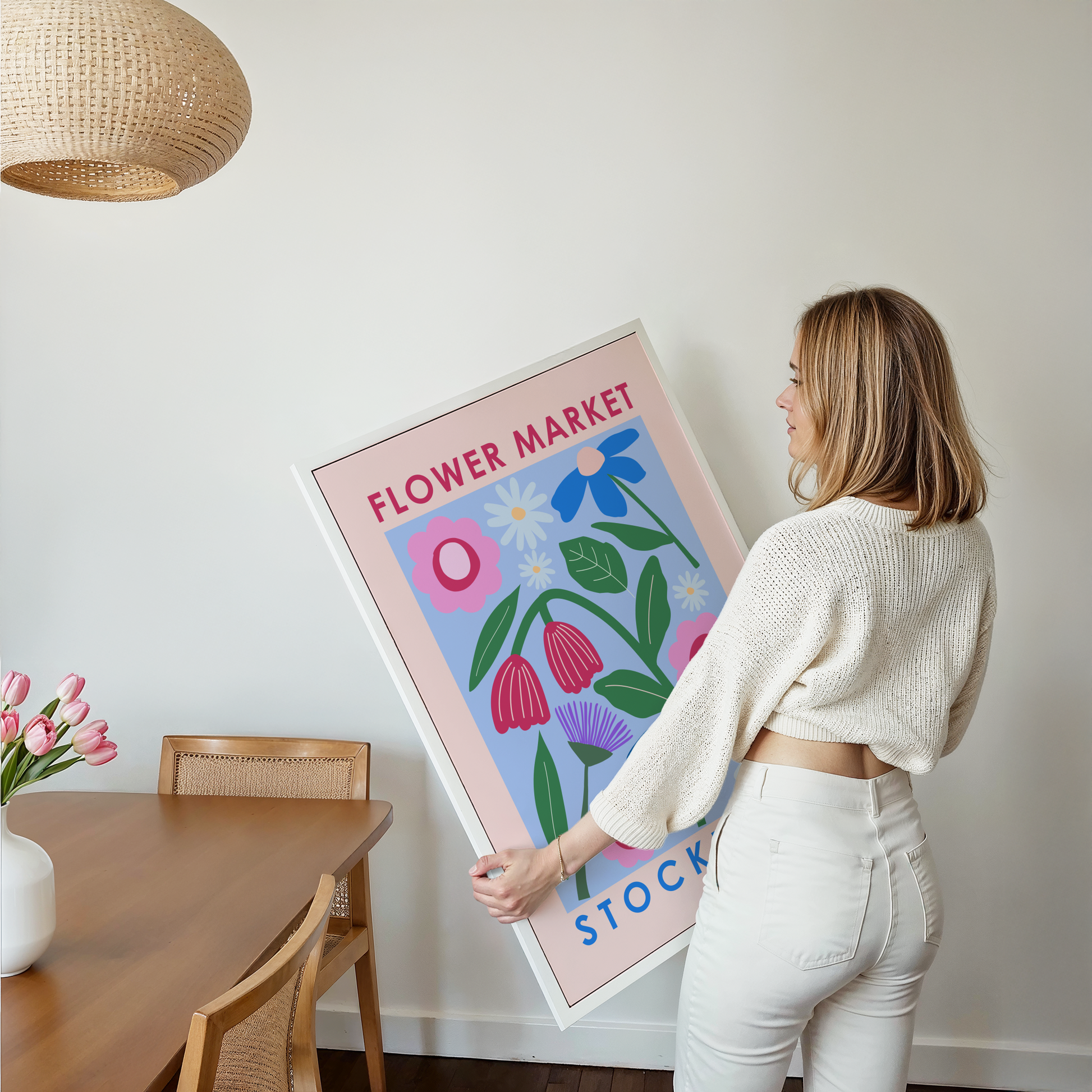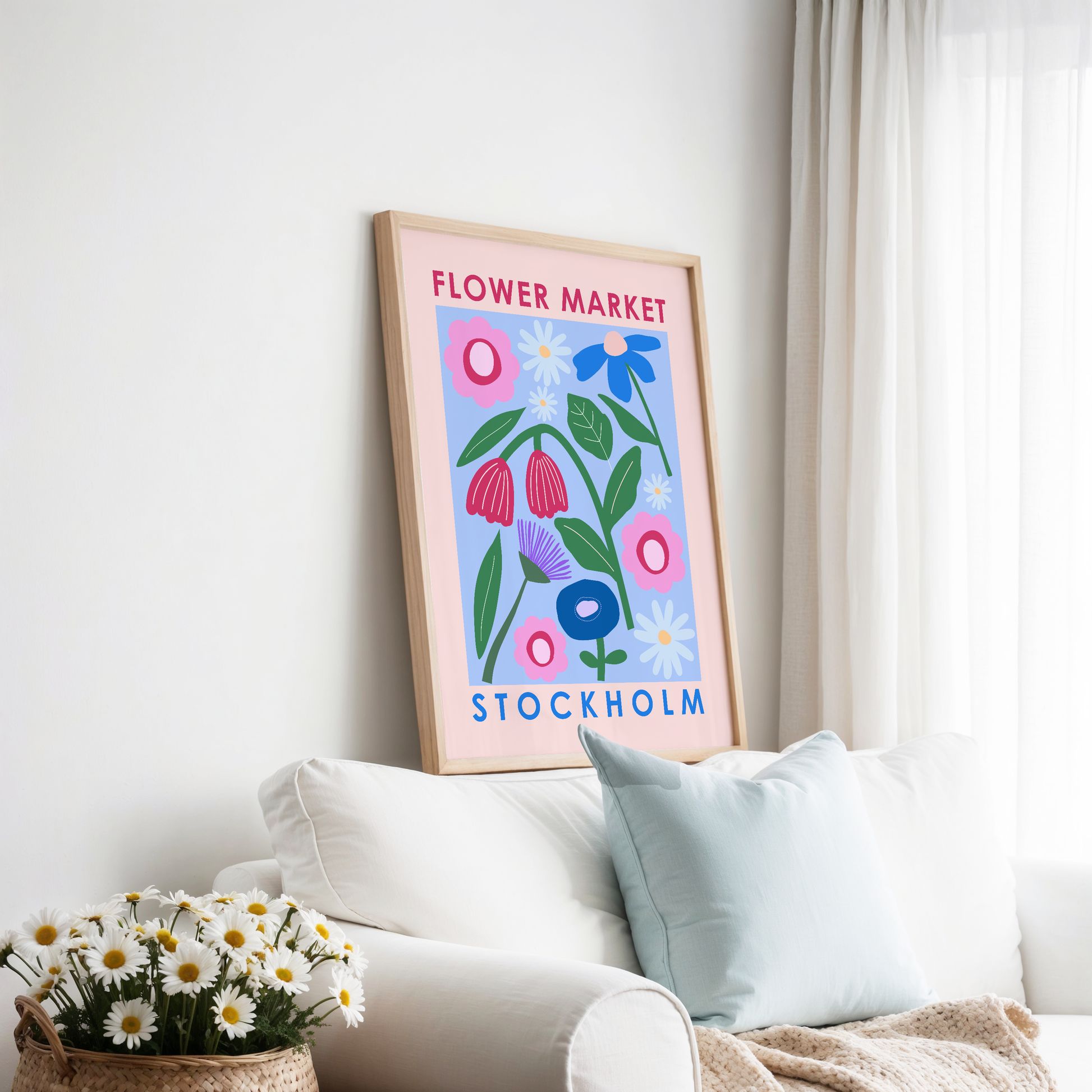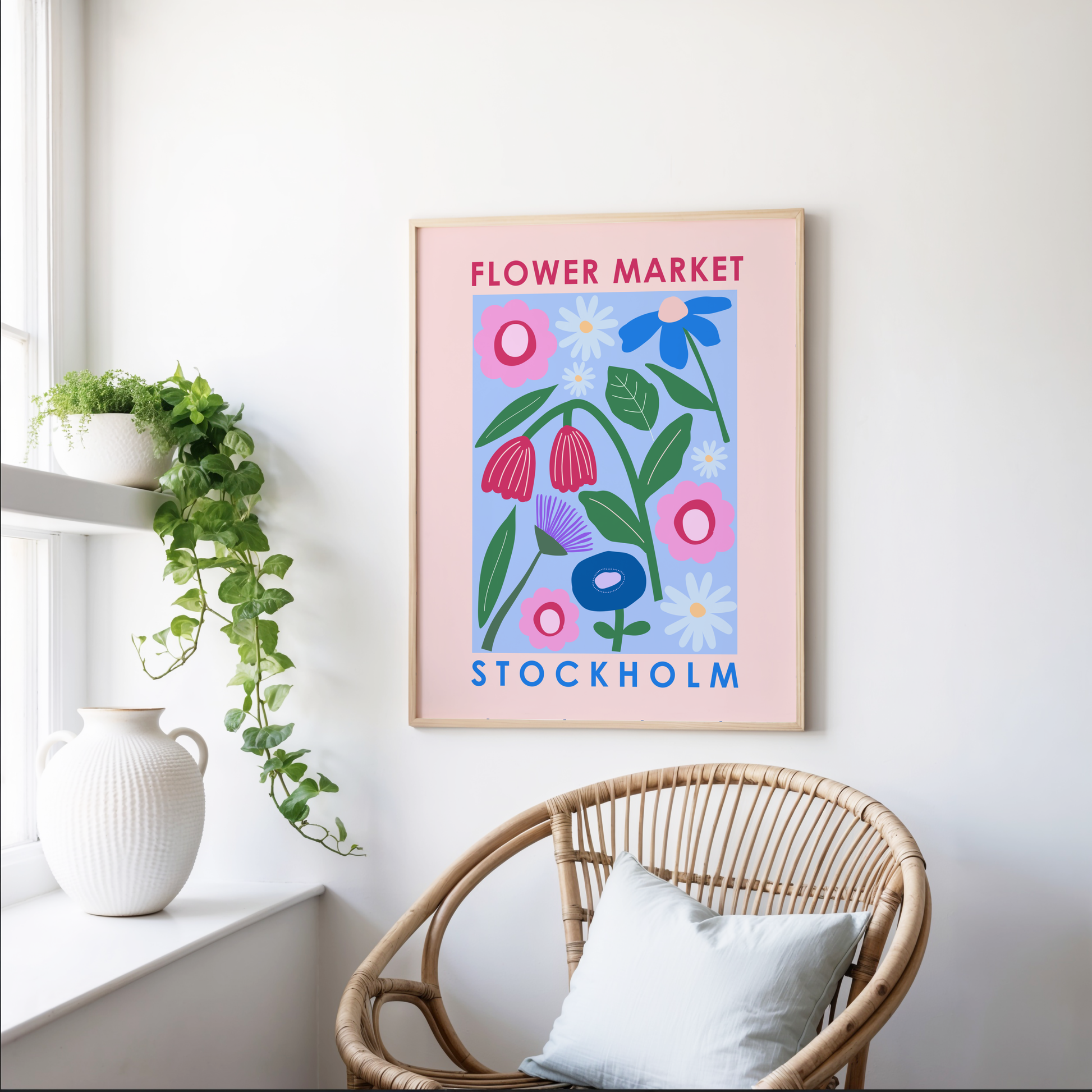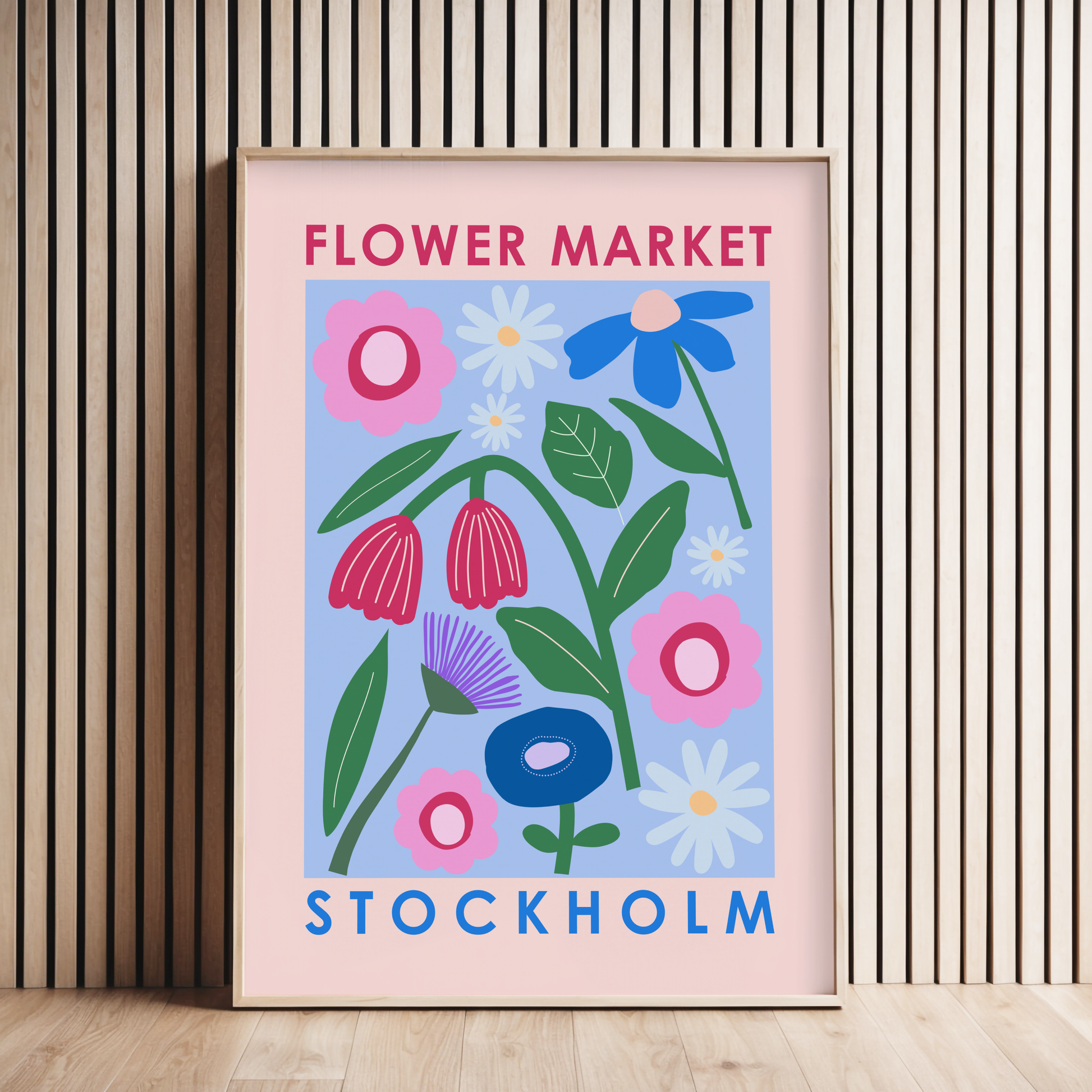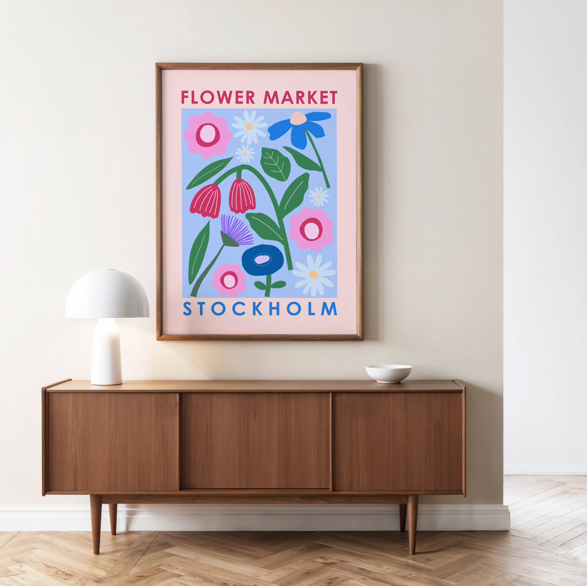 Bring the charm of Scandinavian flower markets into your home with this vibrant Flower Market Stockholm poster print. Featuring a vibrant arrangement of stylised flowers in bold pink, blue, green, purple, and red tones, this piece captures the essence of retro-modern design with a touch of folk art.