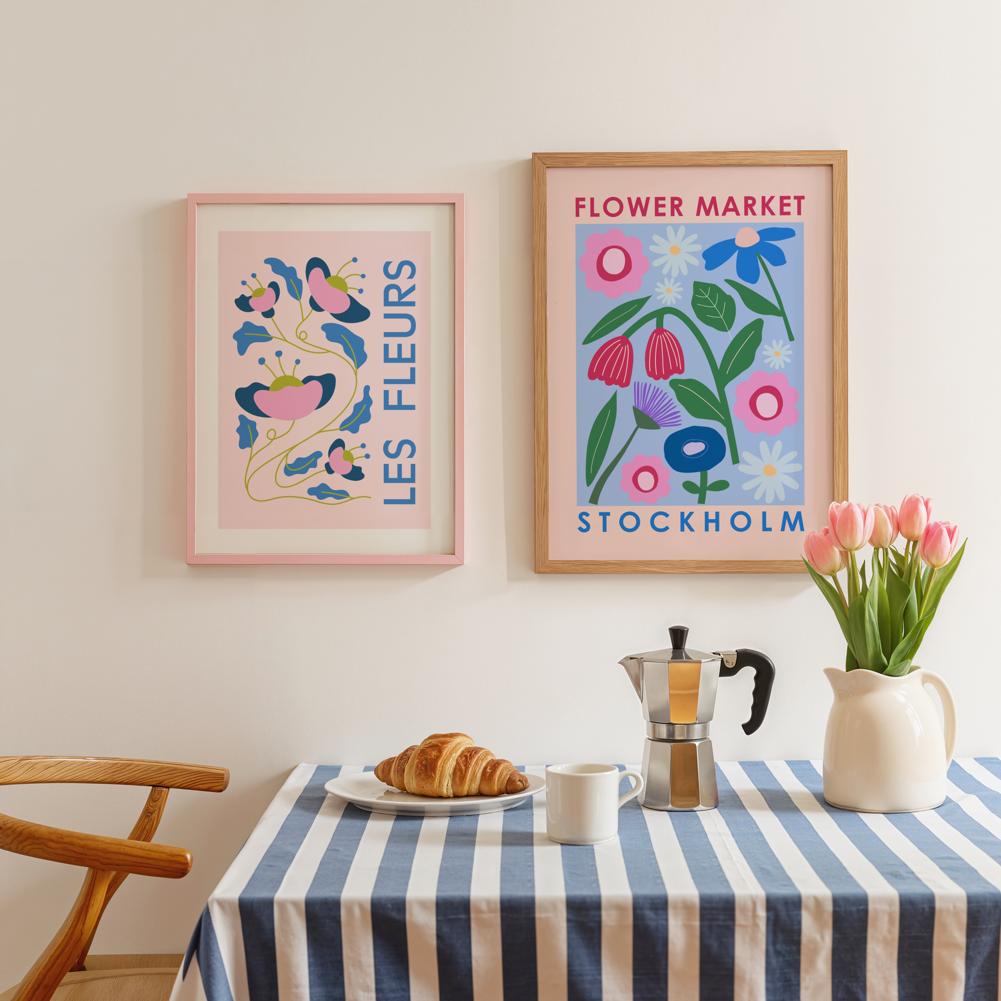 The soft pink border frames a playful blue background bursting with blooms, making it the perfect art print to brighten kitchens, living rooms, offices, or creative spaces. The clean lines and colourful palette also make it a delightful addition to children's bedrooms or Scandinavian-inspired interiors.
