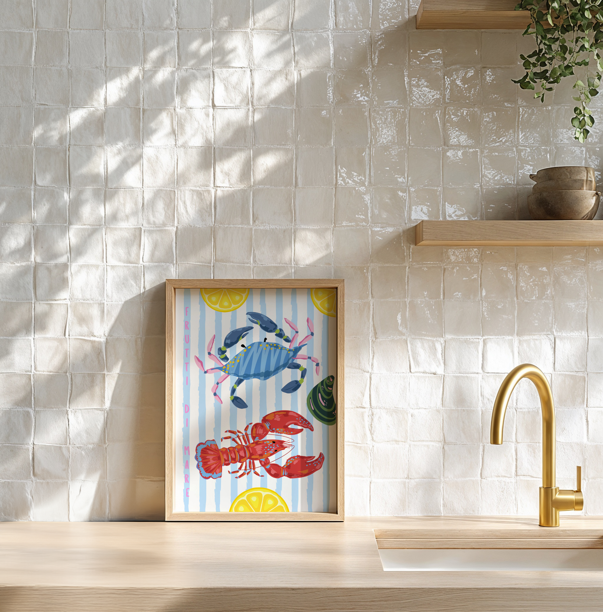 Perfect for coastal-inspired interiors, beach houses, or anyone who loves seafood and colourful decor, this print adds a fresh, summery vibe to any wall.