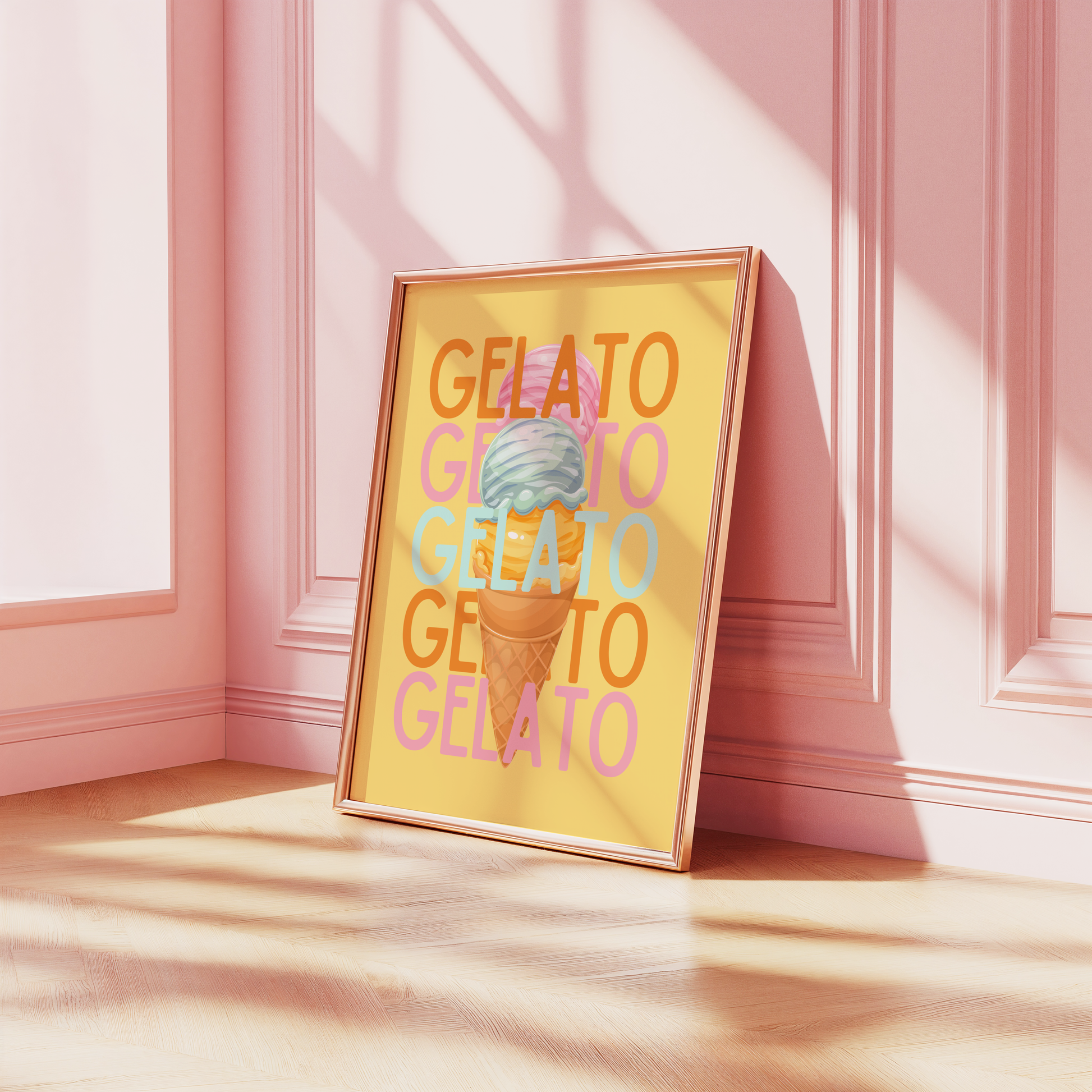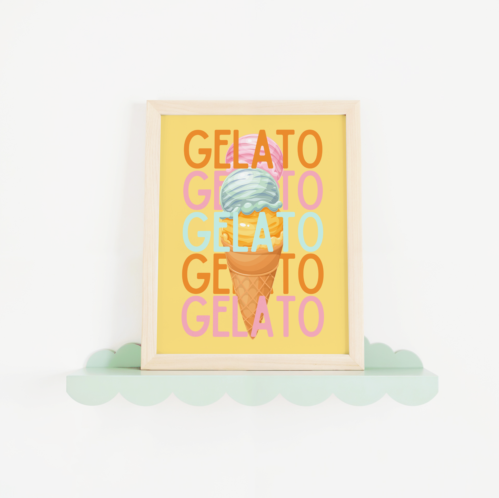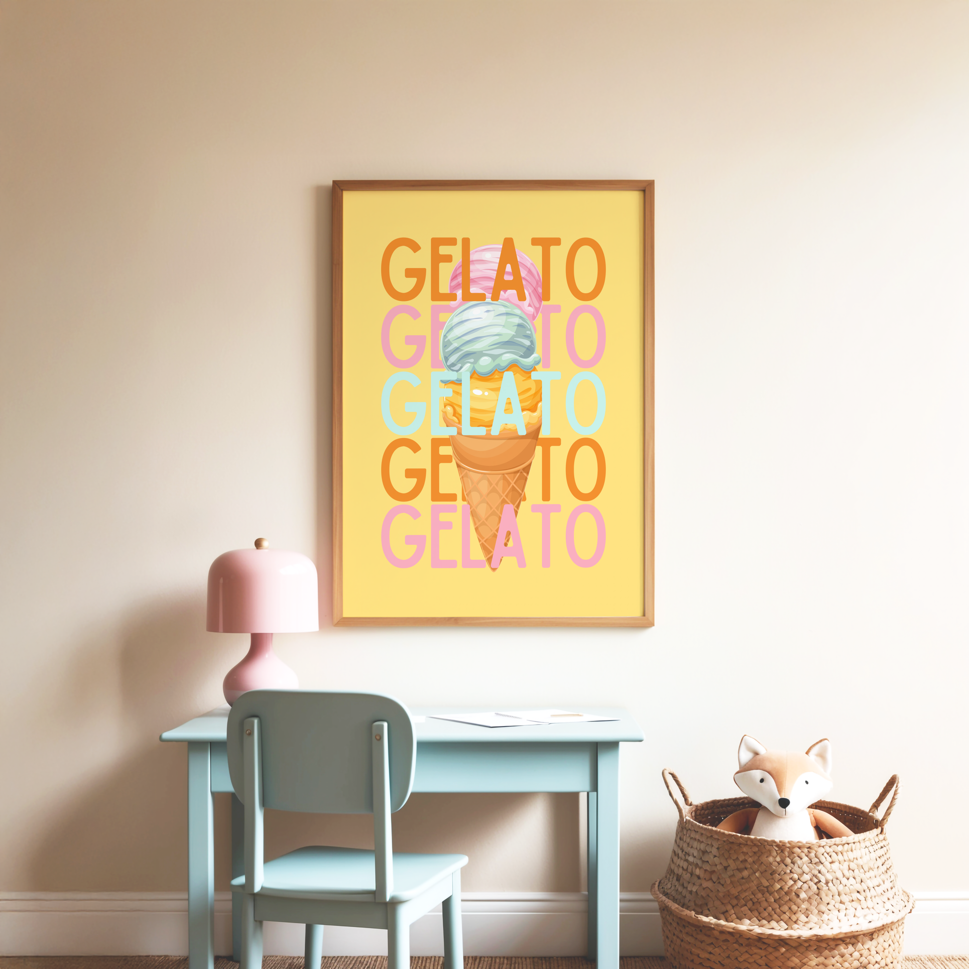The Gelato poster print is a burst of retro rainbow goodness for your walls (kitchen, dining, bathroom or kids bedroom to name a few). It features a gelato cone stacked with three scoops, set against a sunny yellow background. And just when you thought it couldn’t get sweeter, "GELATO" dances in a playful pattern of pink, blue, and orange.