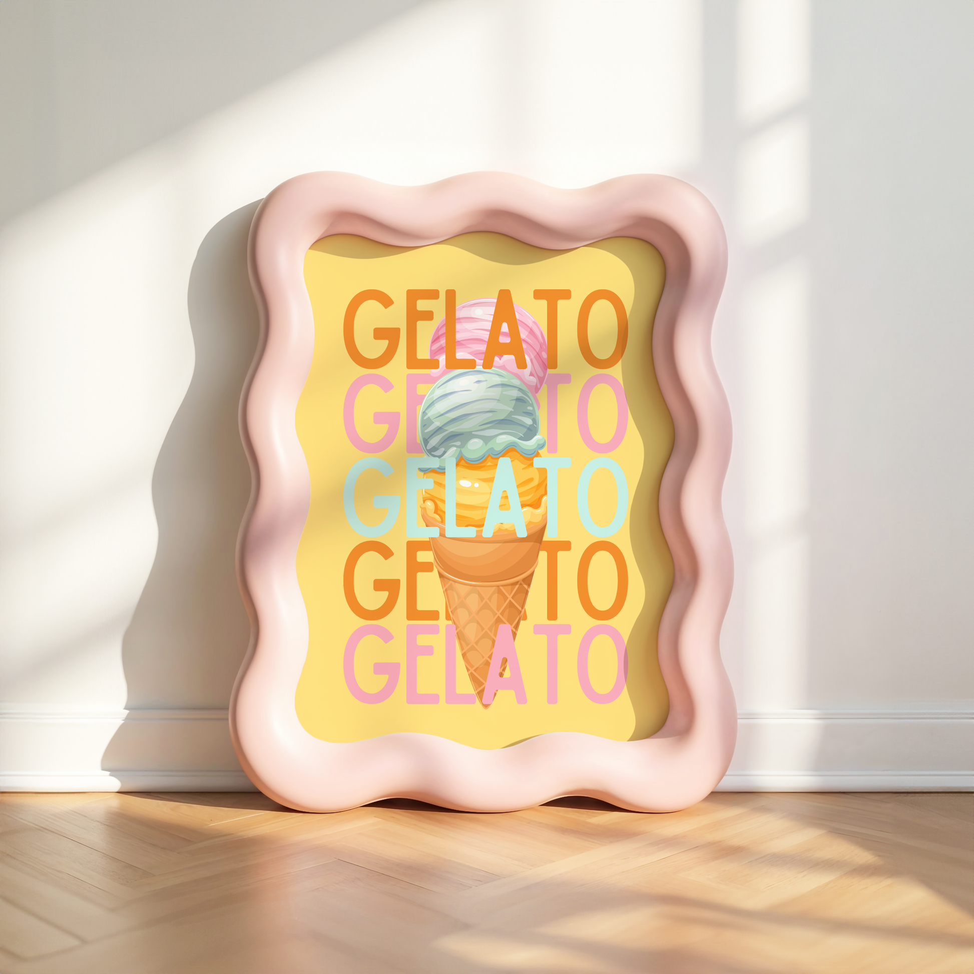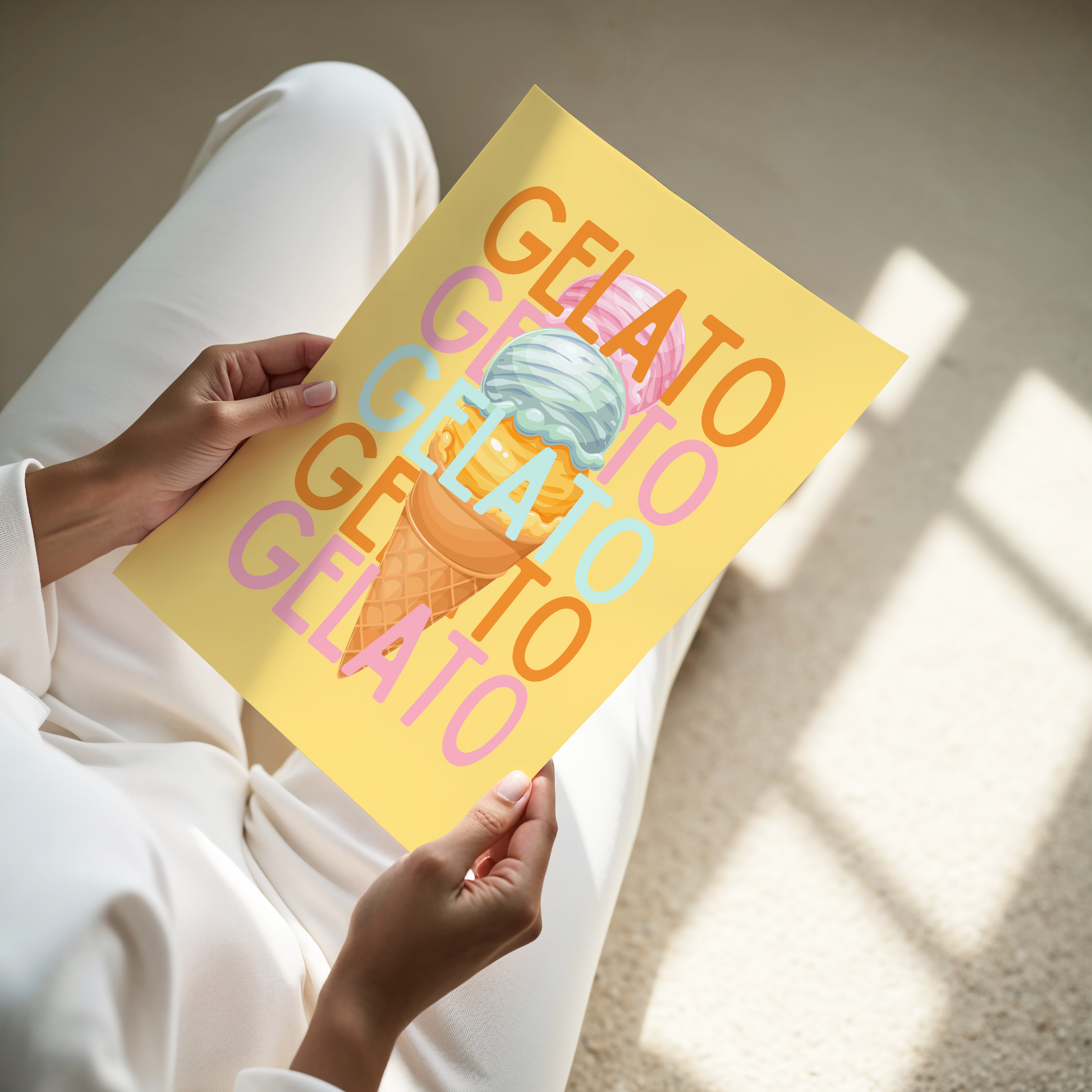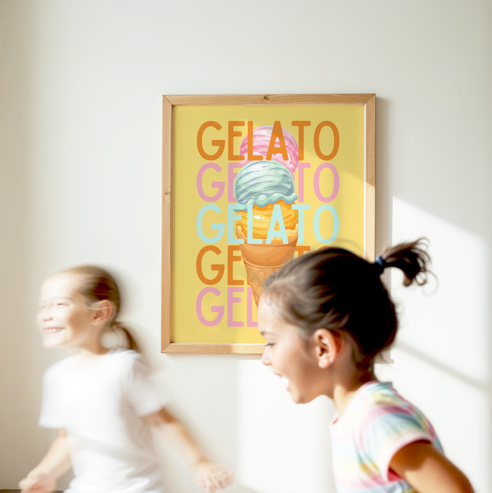 The Gelato poster print is a burst of retro rainbow goodness for your walls (kitchen, dining, bathroom or kids bedroom to name a few). It features a gelato cone stacked with three scoops, set against a sunny yellow background. And just when you thought it couldn’t get sweeter, "GELATO" dances in a playful pattern of pink, blue, and orange.