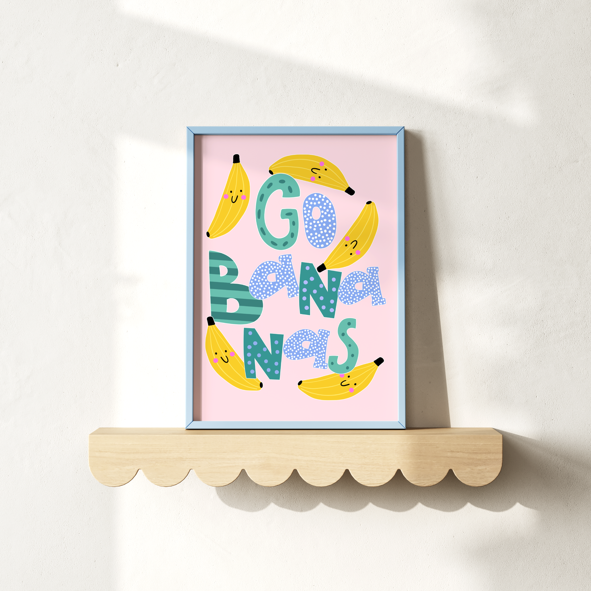 Bring happiness to your child’s space with this playful “Go Bananas” poster print. Featuring cheerful banana illustrations and bold, colourful lettering, this artwork is designed to spark smiles, imagination, and fun!