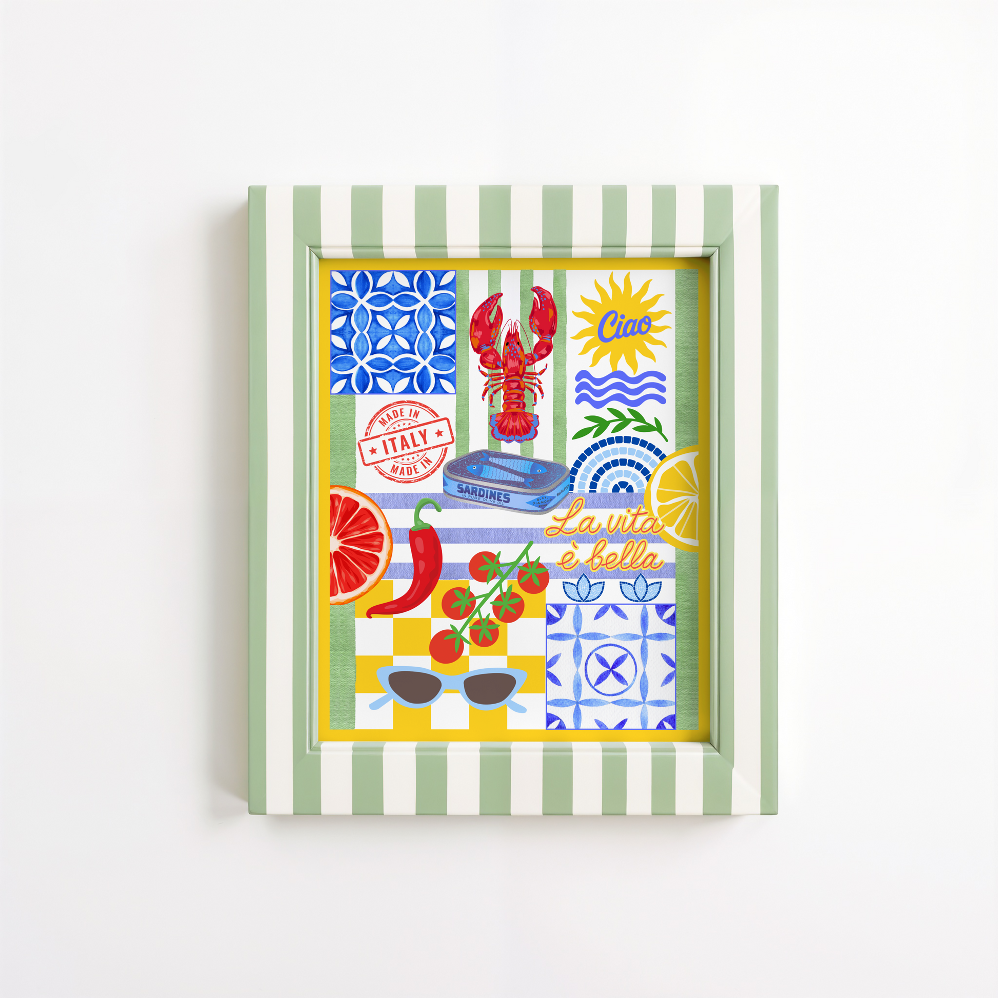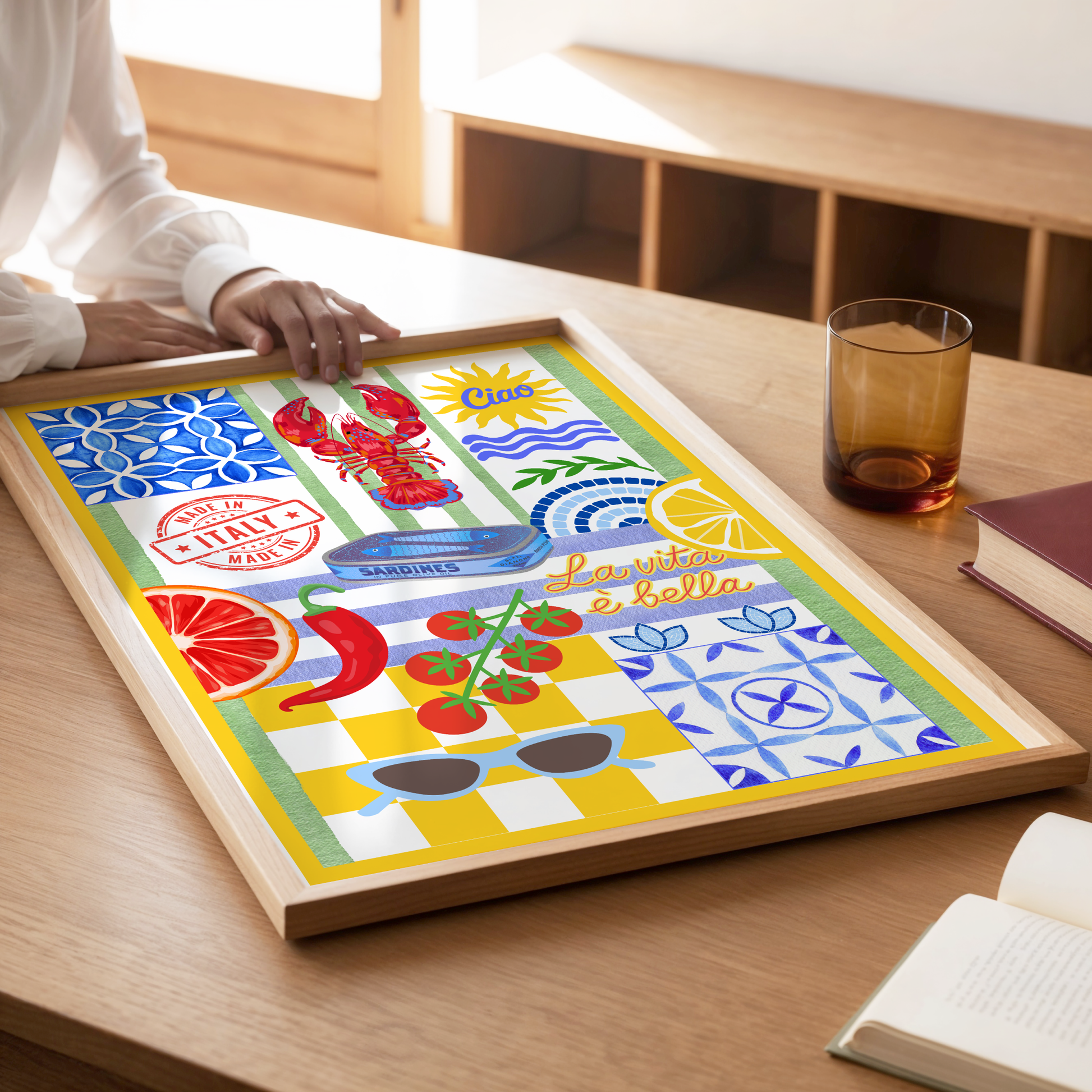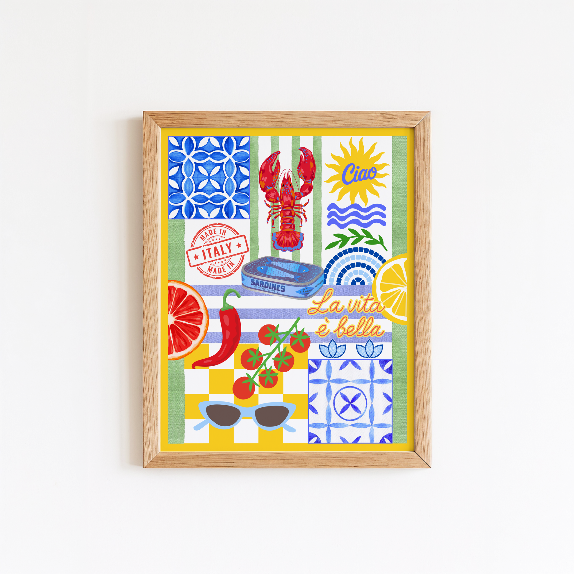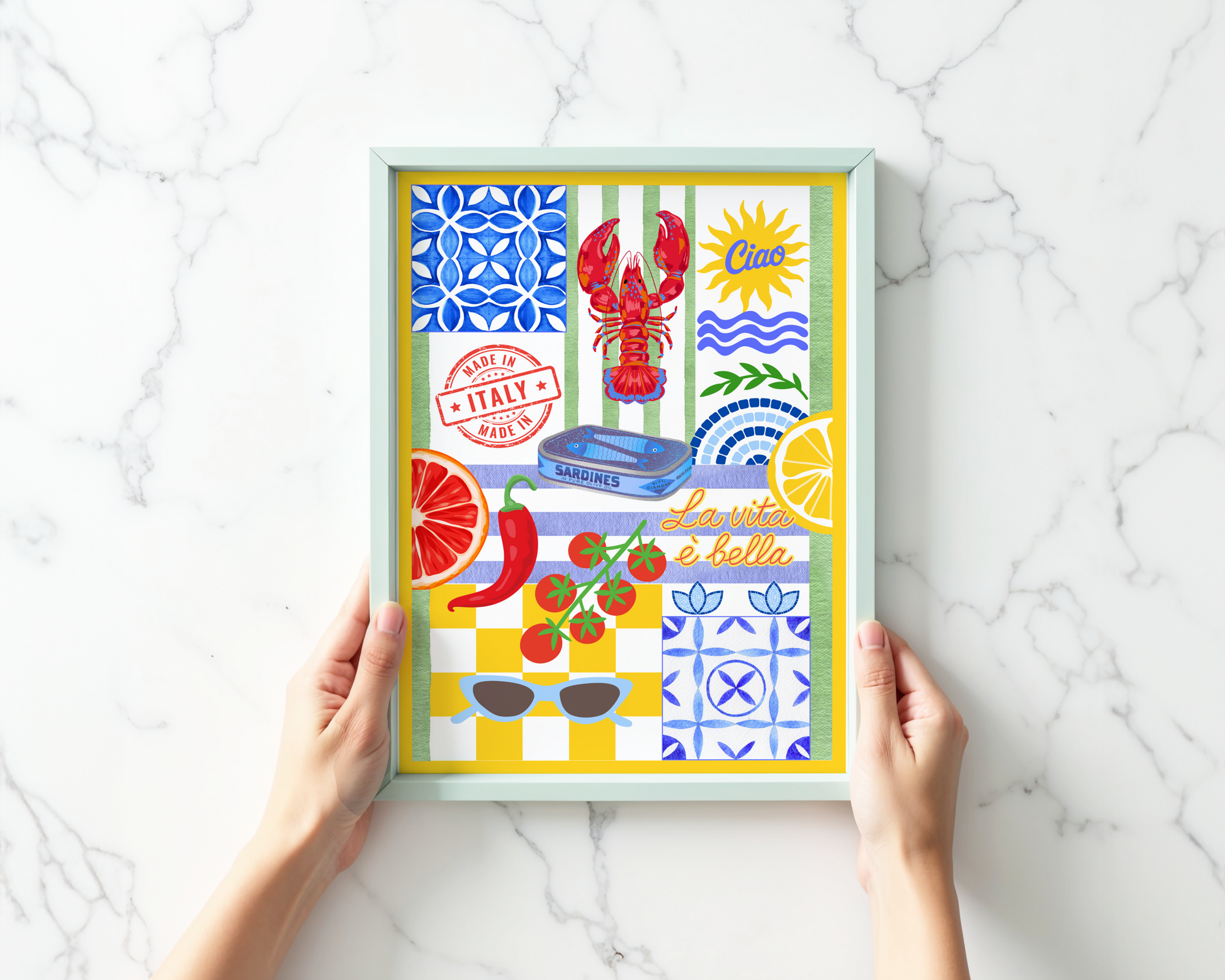 Indulge in la dolce vita—the sweet life—with this vibrant and summery Italian Patchwork poster print. Inspired by dreamy Mediterranean holidays, this design features a playful collage of elements like sunshine, citrus fruits, olive leaves, seafood, sunglasses, and intricate tile-inspired patterns.