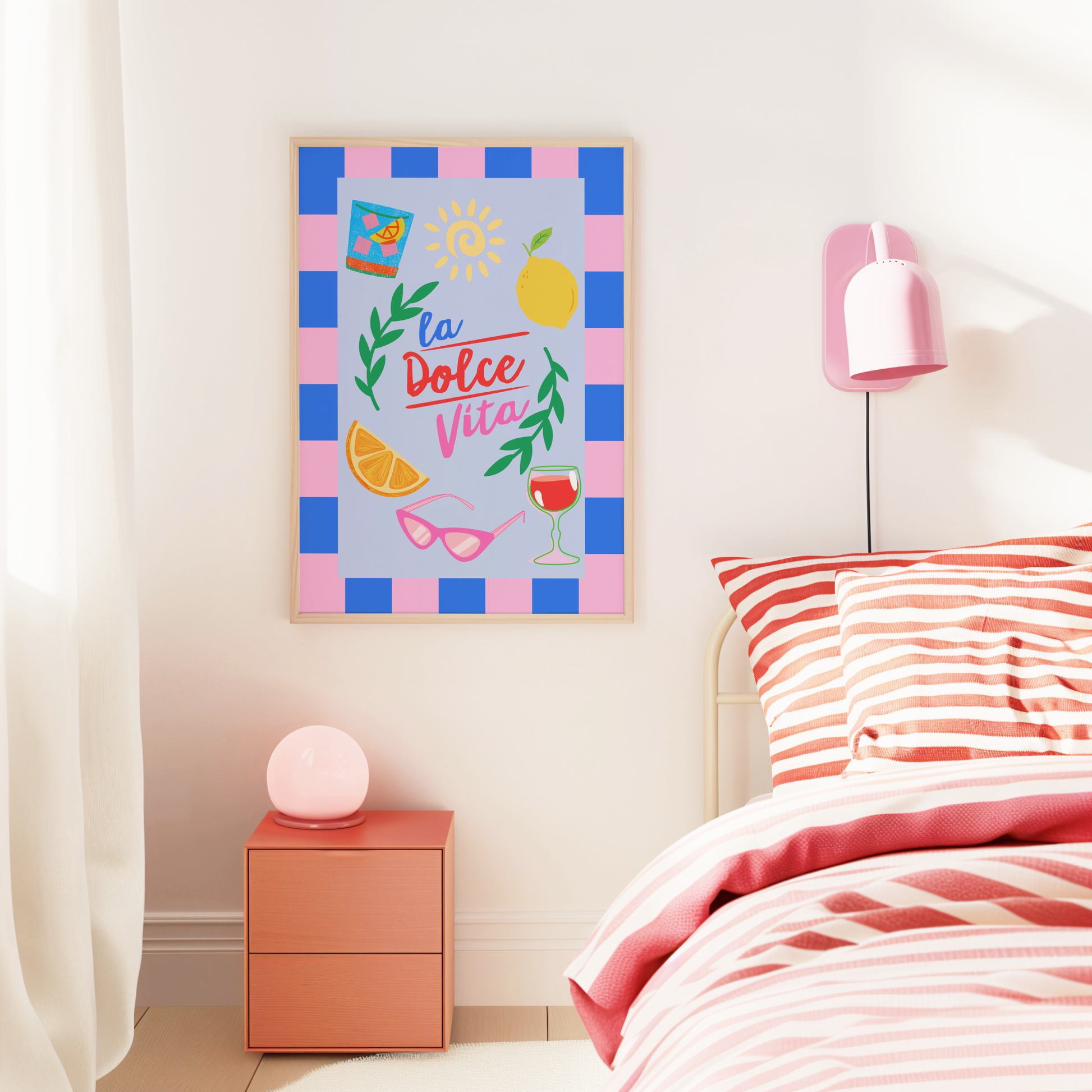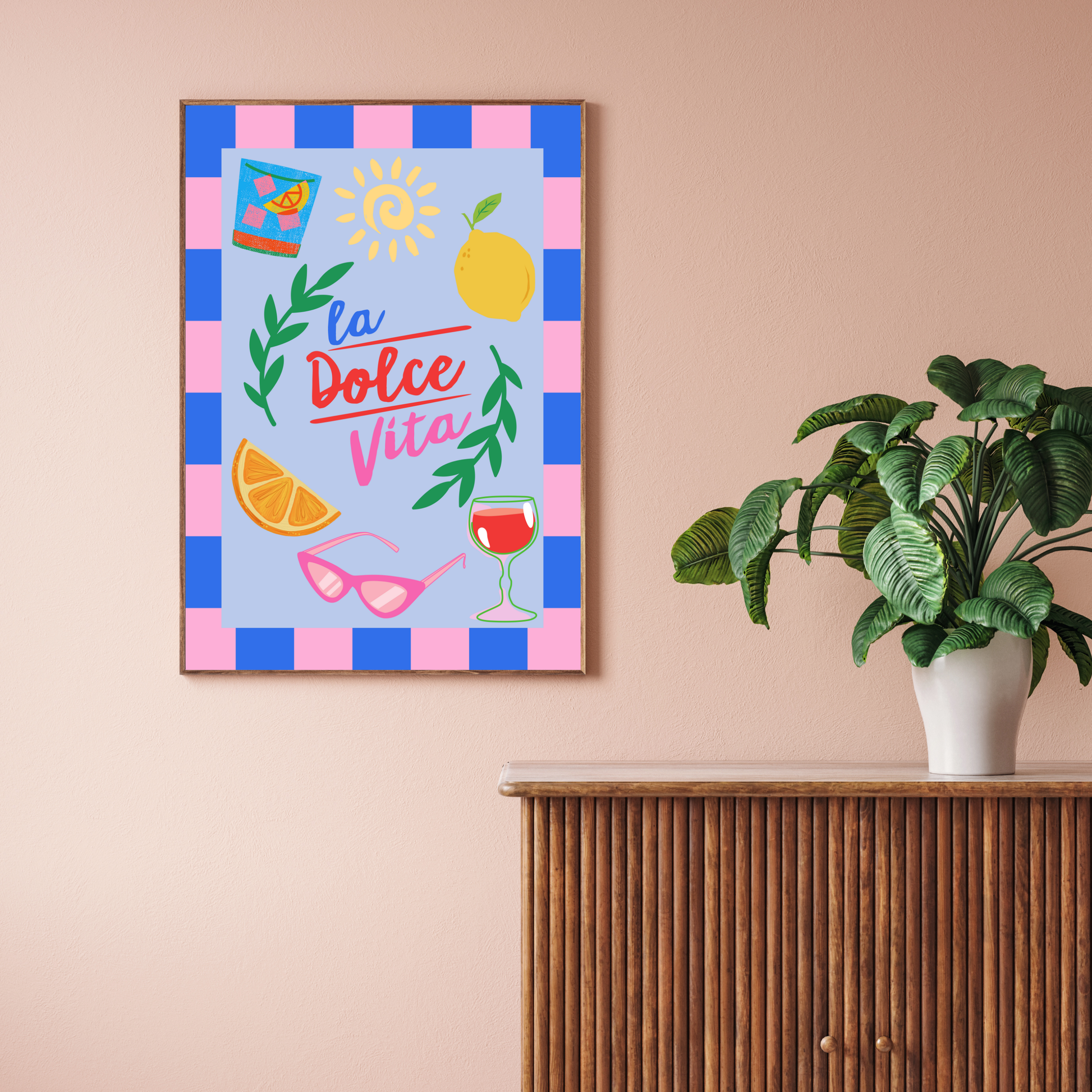 This beautiful poster print captures the essence of “the sweet life” with sunny, feel-good elements like fresh citrus fruit, olive branches, pink sunglasses, red wine, a refreshing gin and tonic, and a shining sun. It’s the perfect way to infuse your kitchen, living room, or dining area with a laid-back Mediterranean vibe.