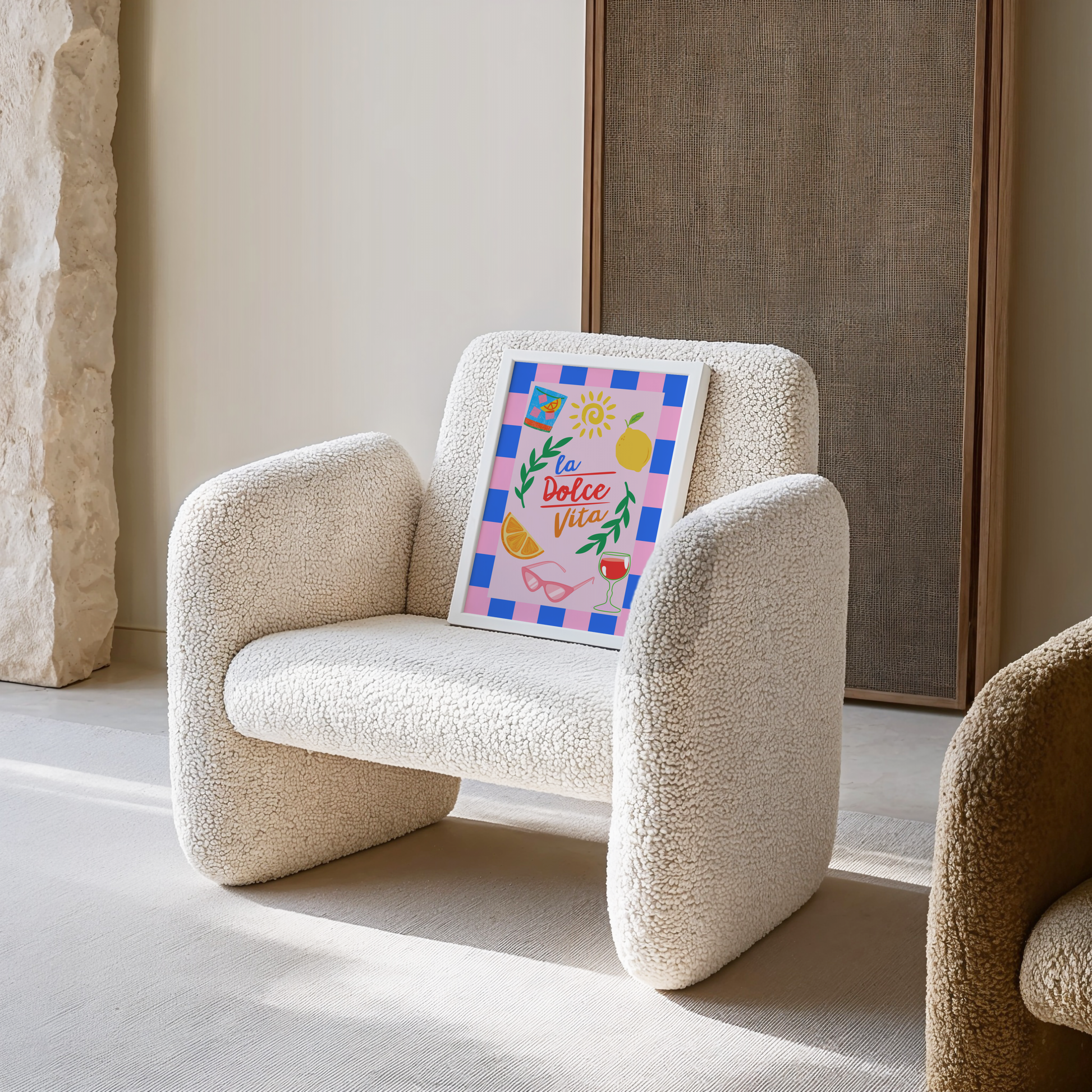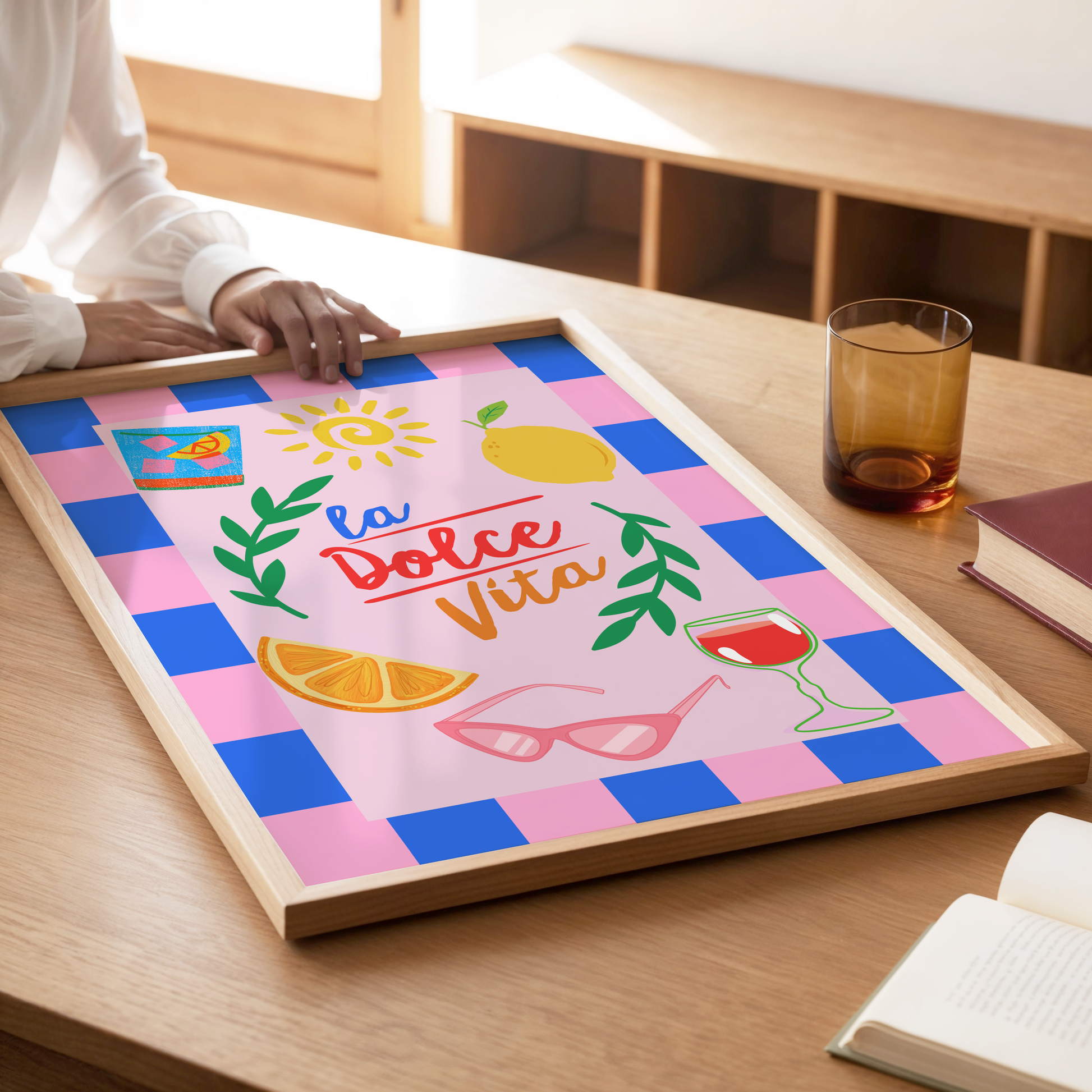 Indulge in the essence of sweet life with this colourful poster print titled 'La Dolce Vita'. It showcases a perfect blend of sunshine, citrus fruits, olive leaves, pink sunglasses, red wine and gin and tonic, bringing the charm and tranquility of a summer holiday in Italy right to your home.