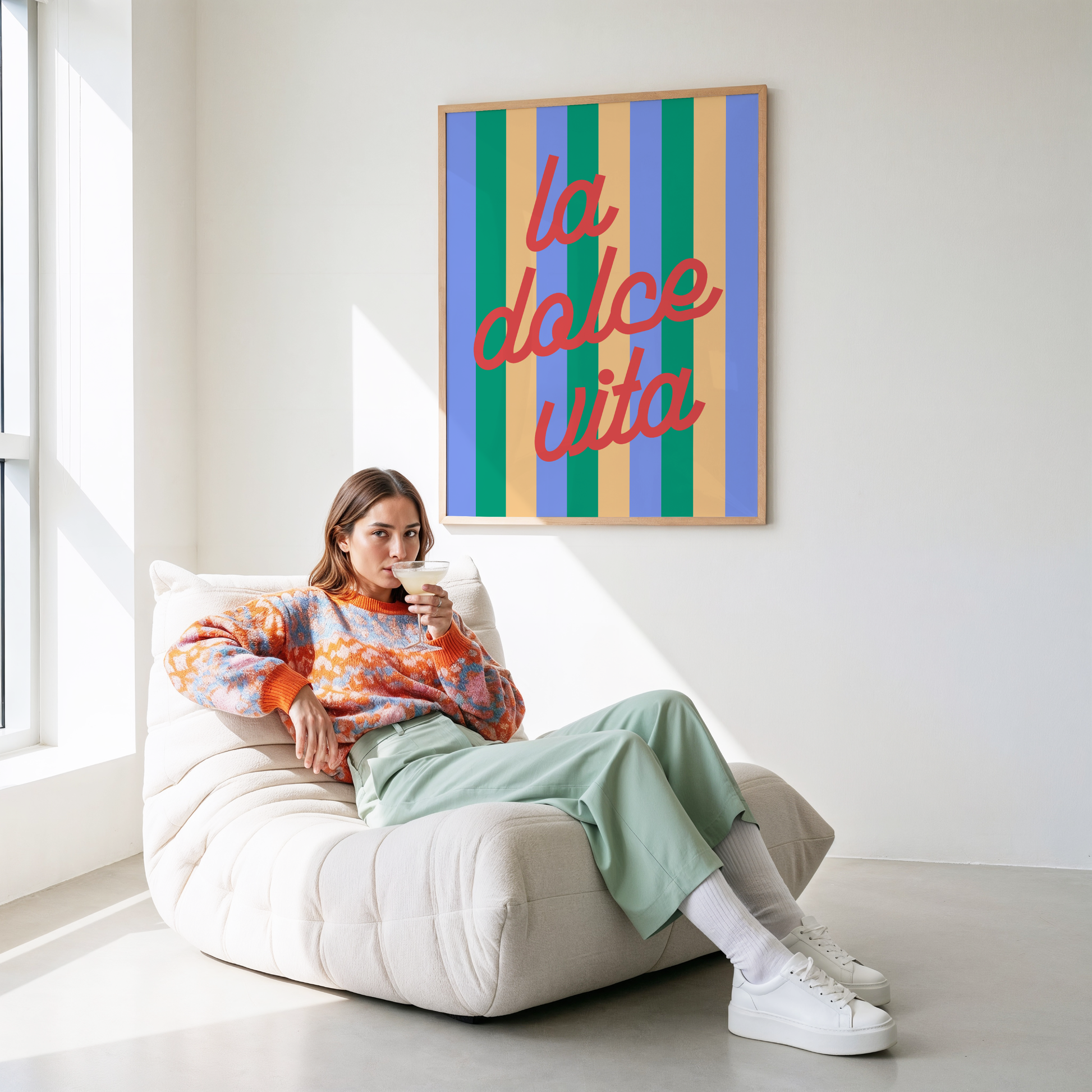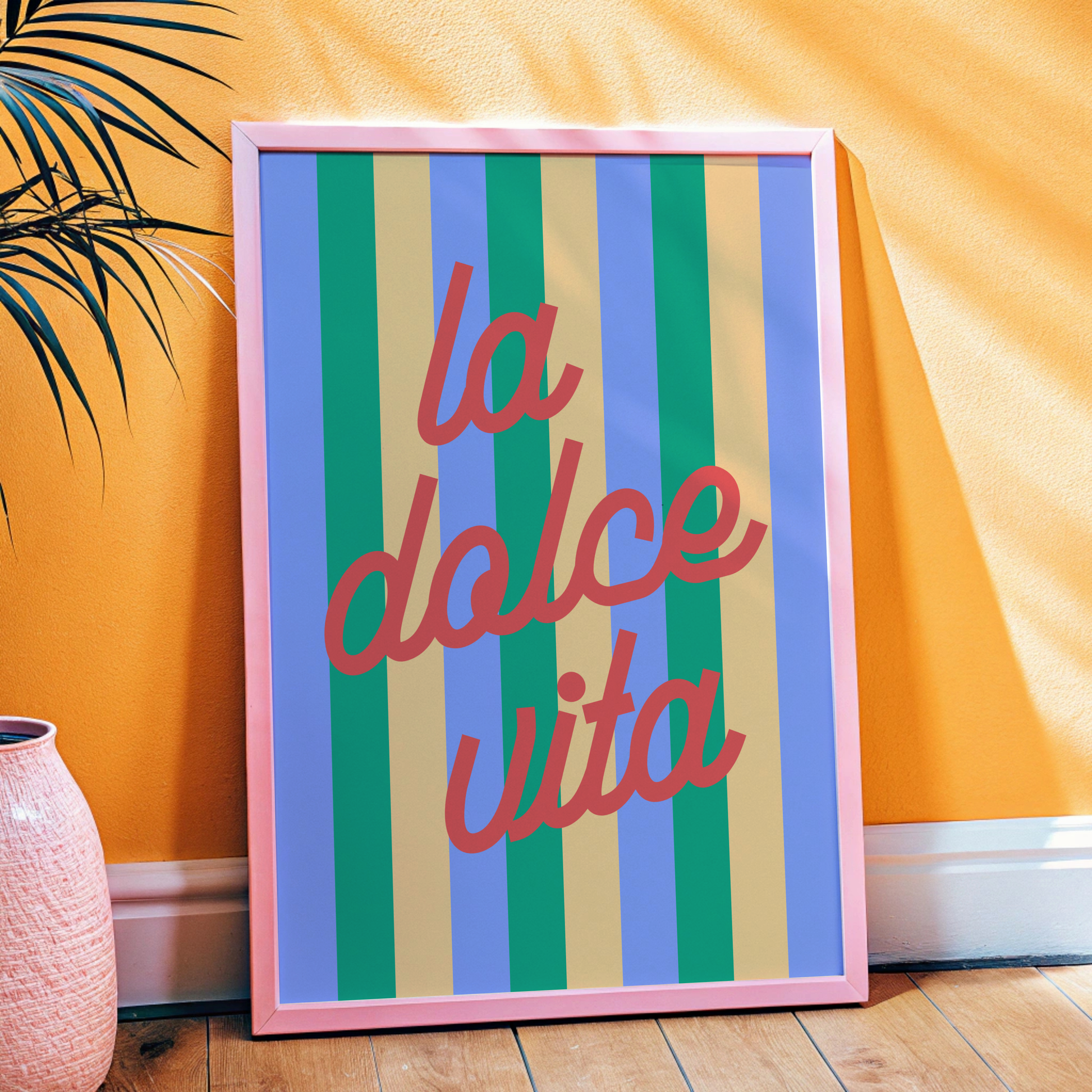 Bring Italian summer charm and retro vibes into your home with this bold La Dolce Vita poster print. Featuring vibrant green, yellow, and blue stripes with cursive red lettering, this digital print is a reminder to embrace the sweet life every day.
